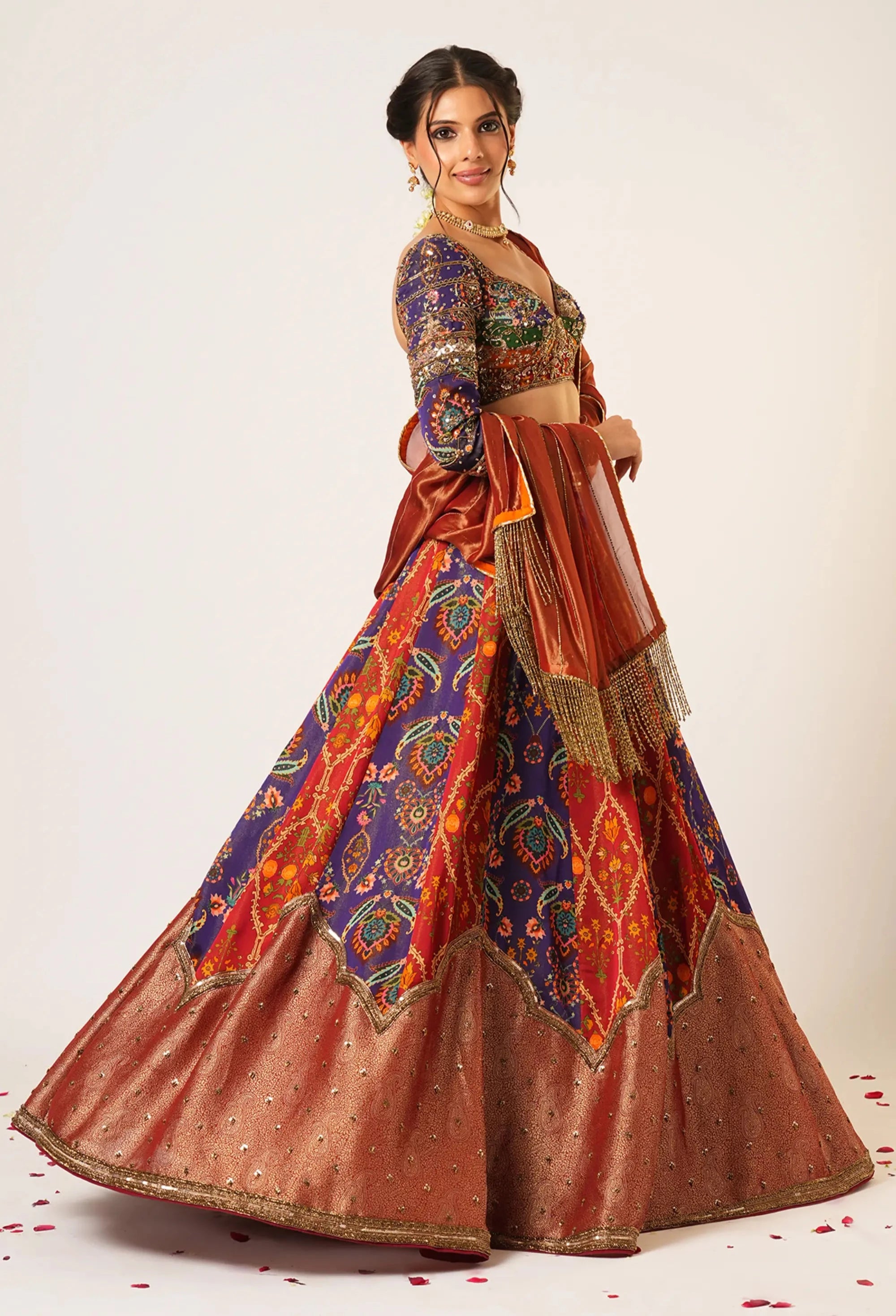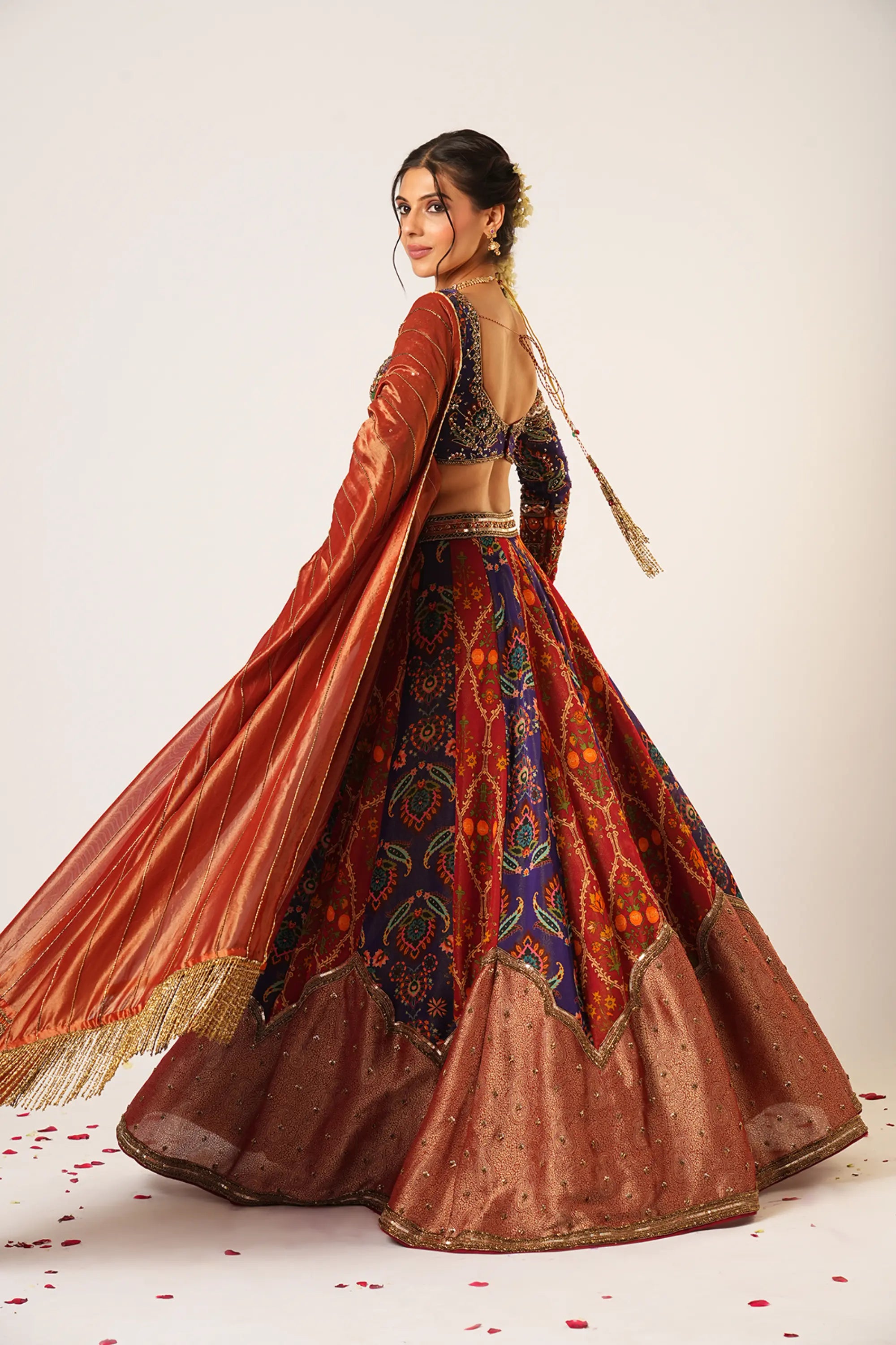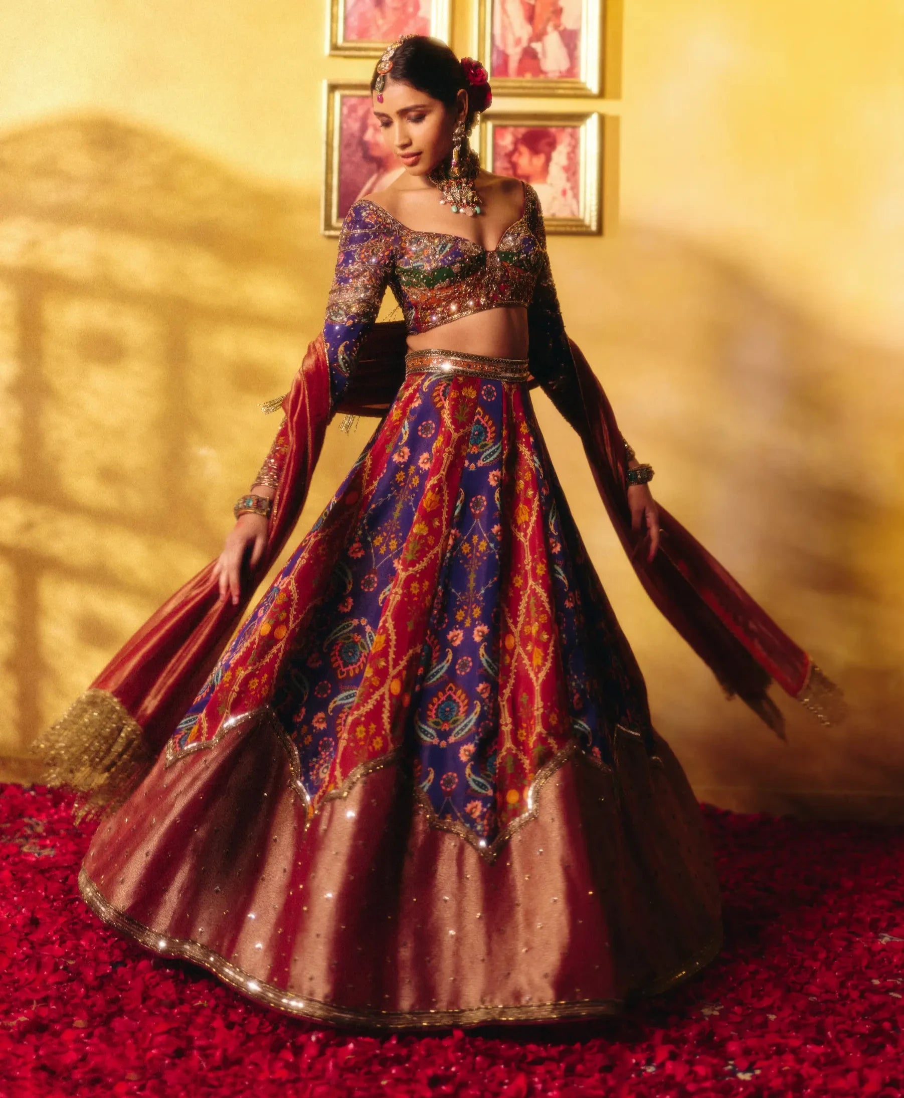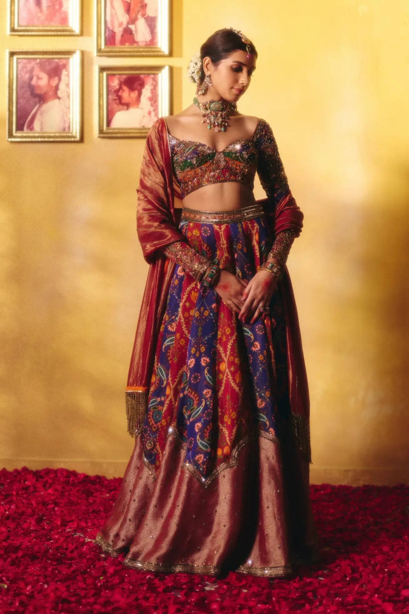 The Multicolor Indrani Lehenga is a stunning masterpiece, designed to captivate with its vibrant hues and intricate craftsmanship. Featuring a rich blend of colors, this lehenga combines traditional design elements with modern elegance, making it perfect for weddings, festivals, and special occasions. The luxurious fabric and exquisite embellishments offer a graceful and flattering silhouette, ensuring you make a bold fashion statement.