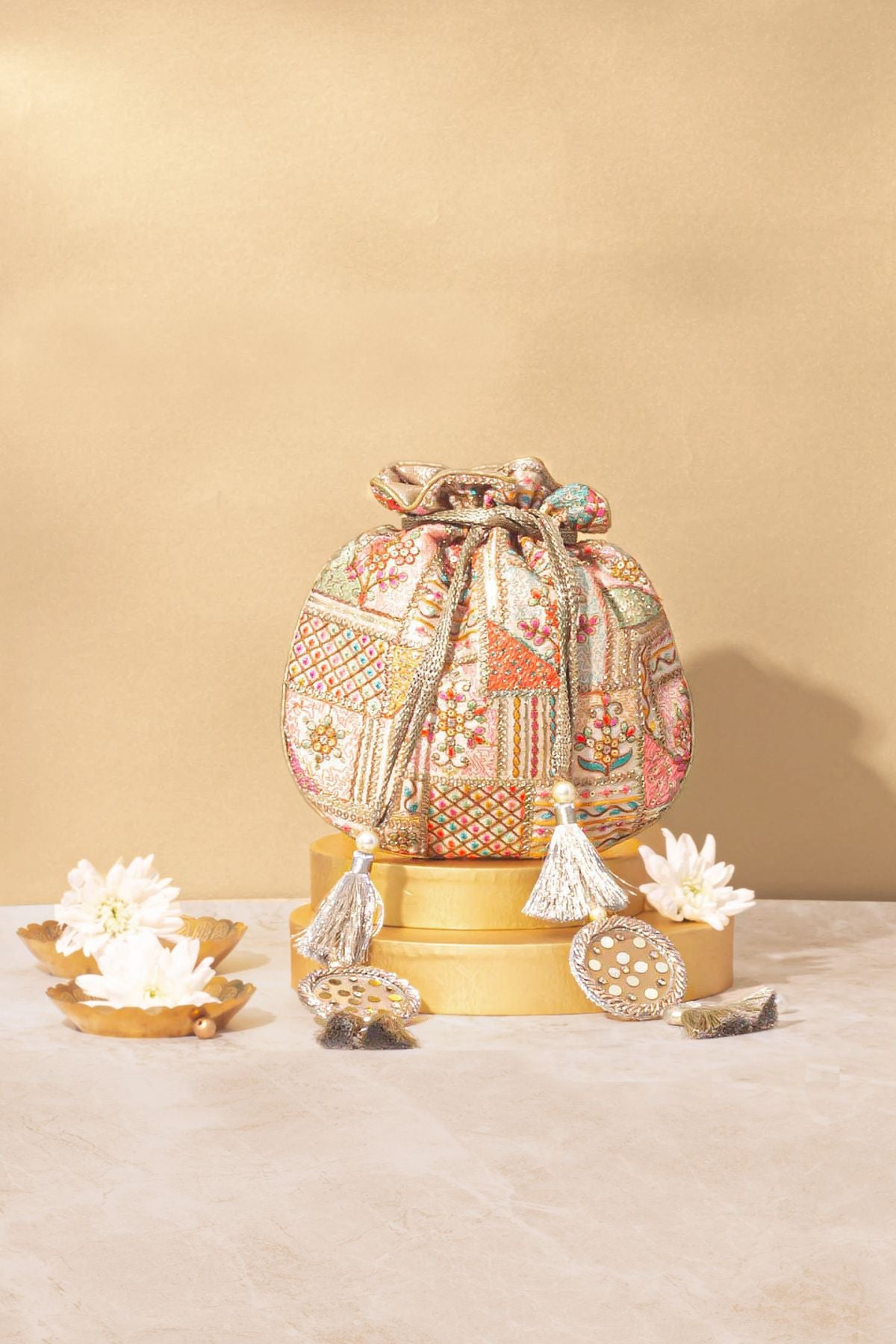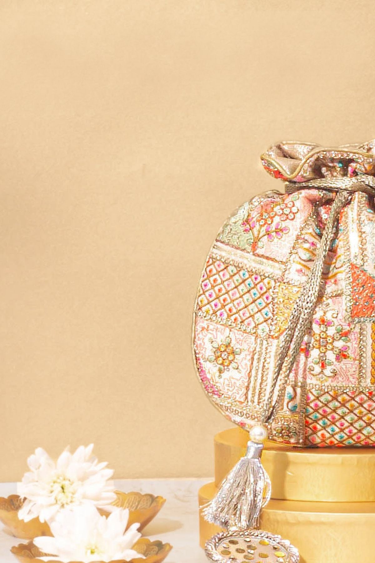 Our Jia Embroidered Multi-Color Potli is a vibrant masterpiece, featuring intricate embroidery in a stunning blend of colors. The long tassels add a playful charm, making it the perfect accessory to elevate your ensemble. A seamless fusion of tradition and contemporary style, this potli is ideal for festive events and special occasions.