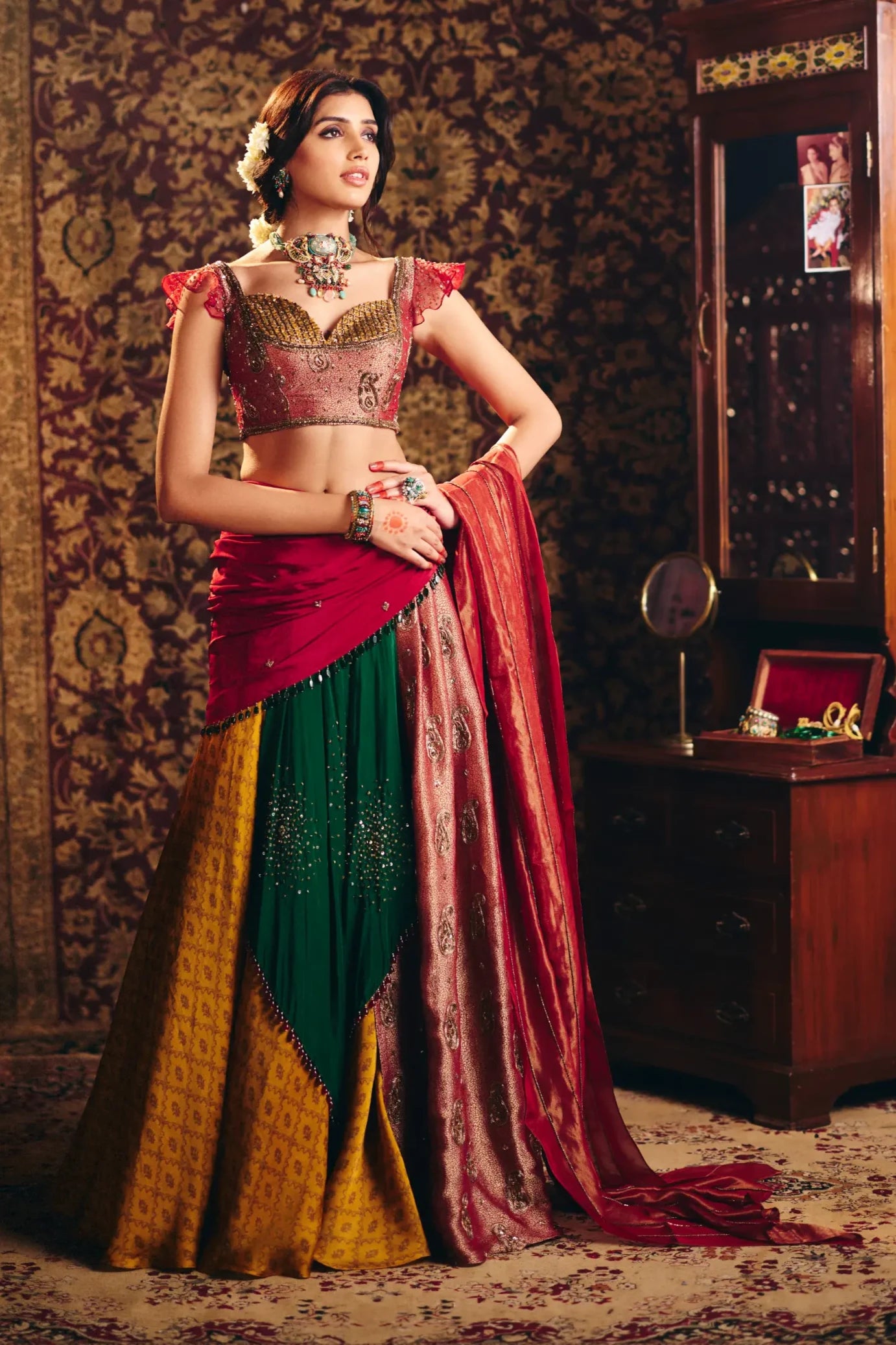 The Multicolor Panchali Lehenga is a stunning and vibrant piece that effortlessly combines rich, traditional design with contemporary flair. Featuring a beautiful blend of colors, this lehenga is crafted with intricate detailing and luxurious fabric, making it perfect for weddings, festivals, and celebratory occasions. The dynamic color palette and graceful silhouette create a mesmerizing look that is sure to turn heads.