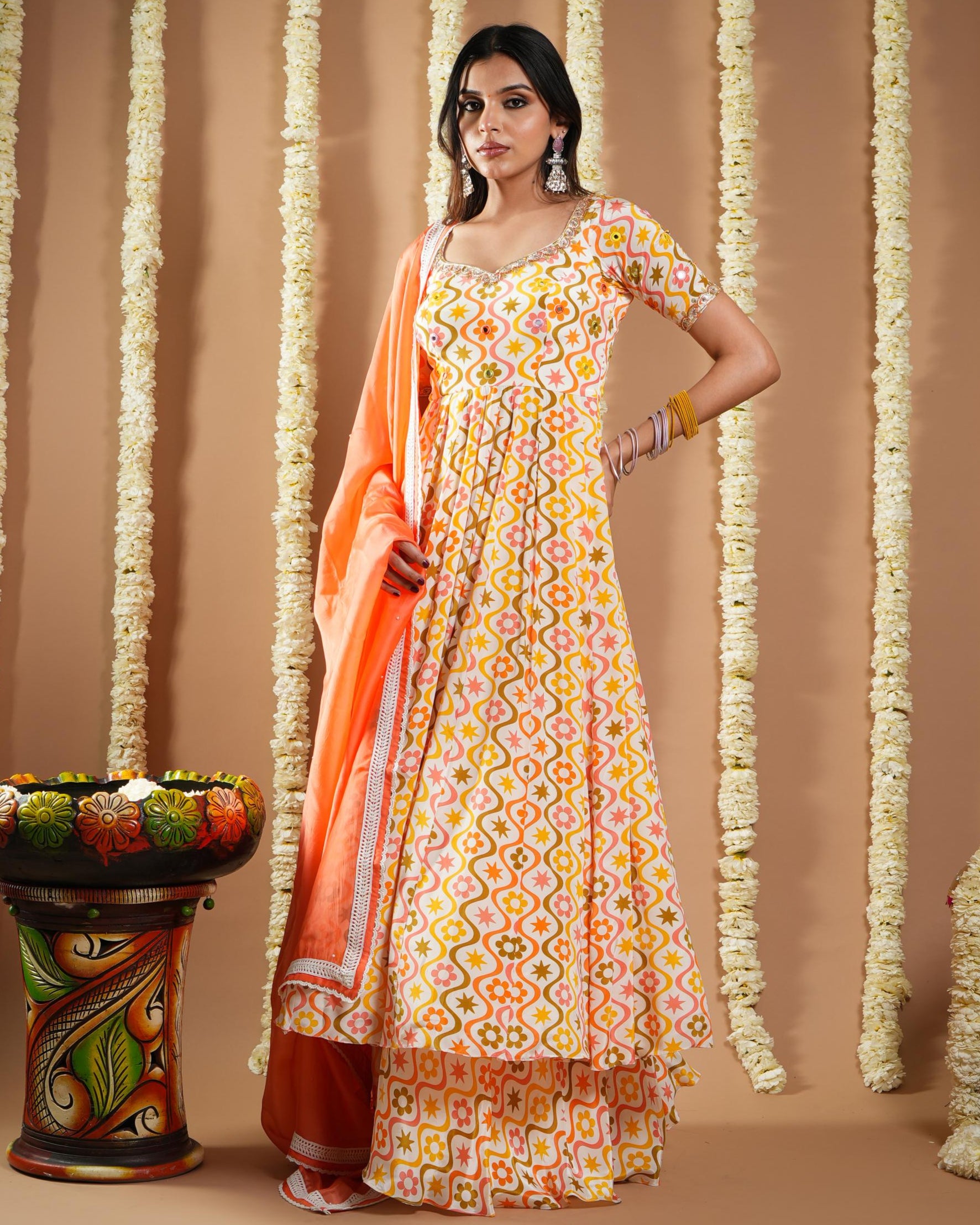 Embrace vibrant tradition with the Off-White Multicolor Printed Avyanna Anarkali Set. Featuring a lively palette and timeless silhouette, this ensemble is perfect for festive celebrations, cultural gatherings, and special occasions.