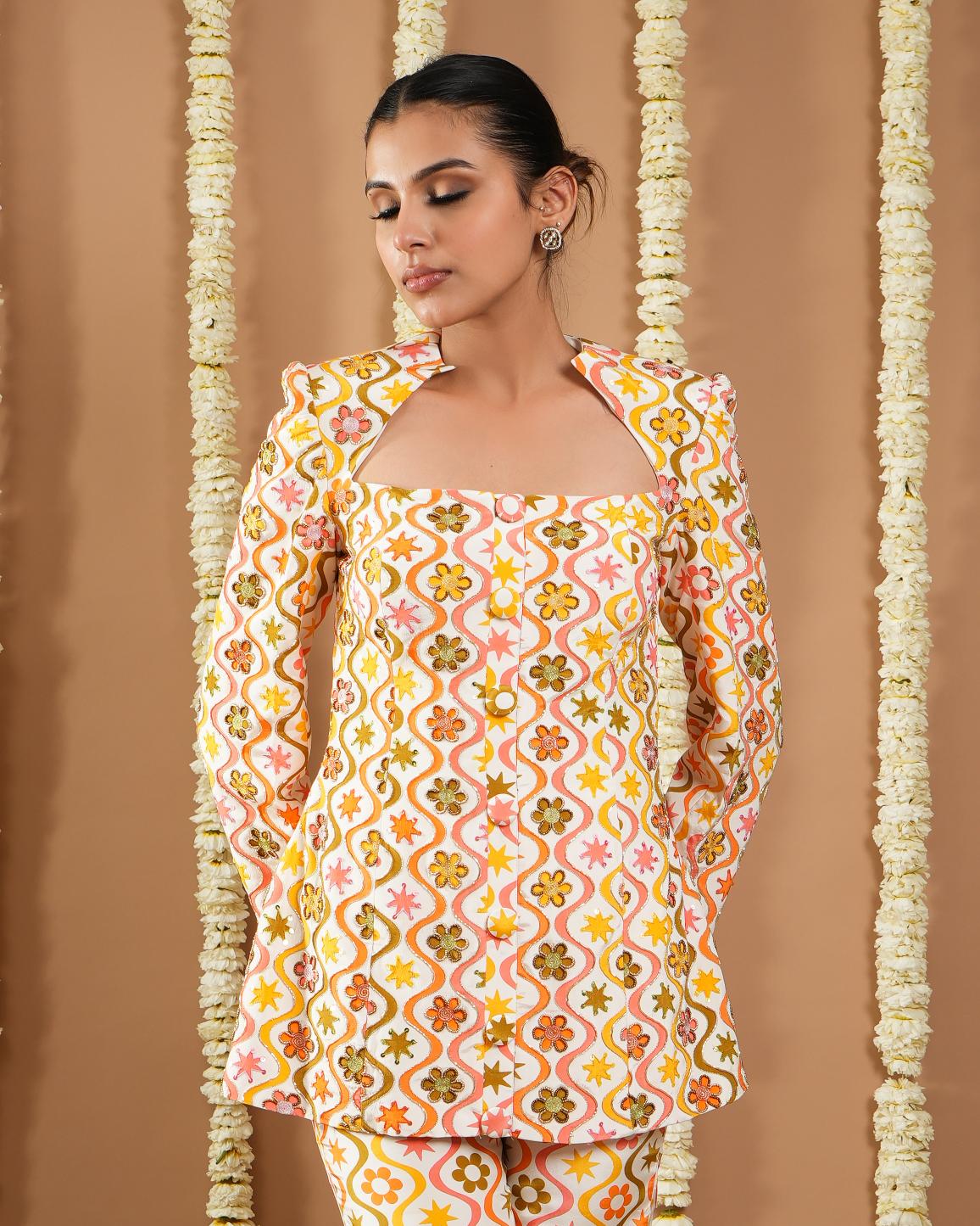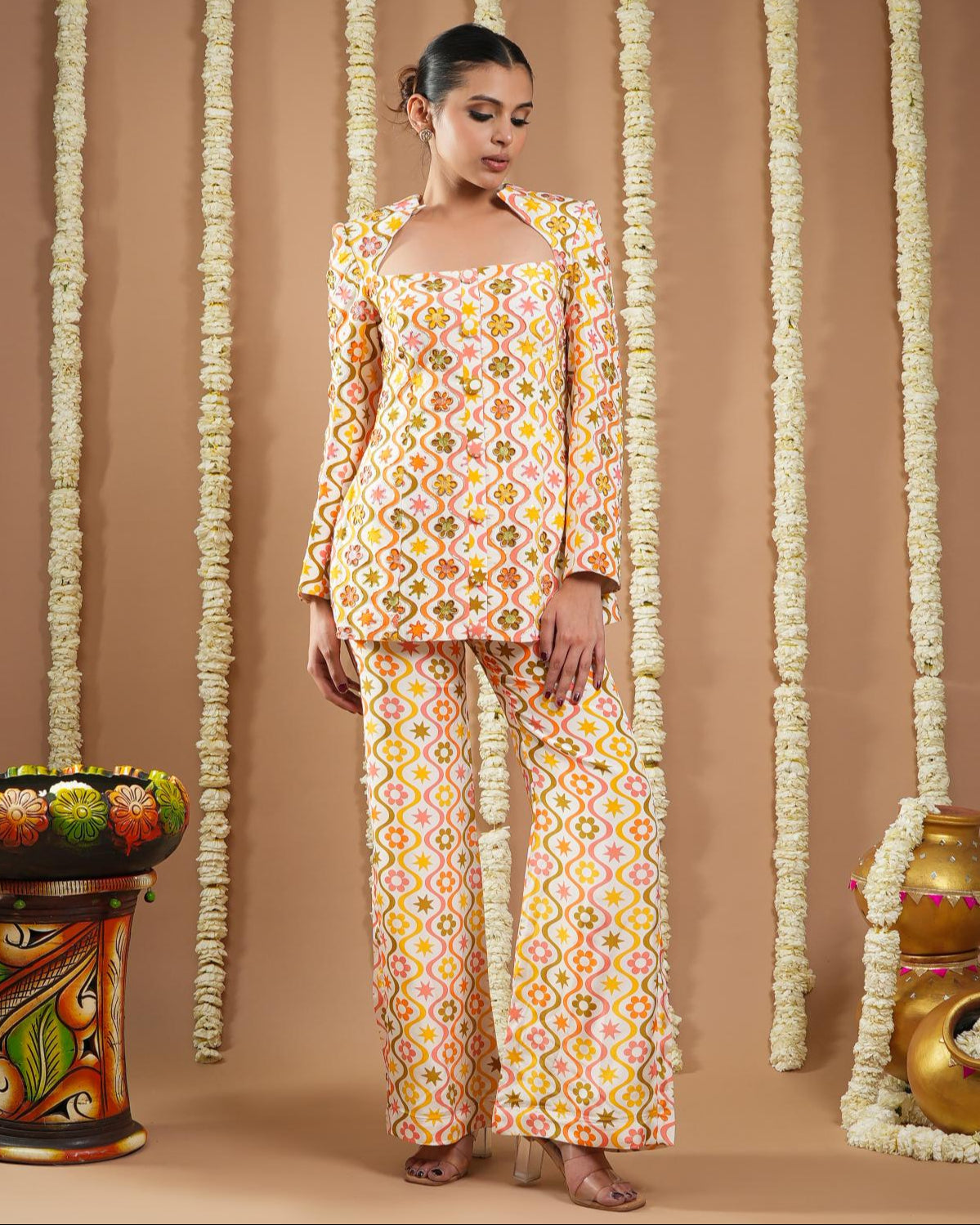 Step out in style with the Off-White Multicolor Printed Avyanna Coat & Pant Set. Blending bold prints with structured elegance, this contemporary ensemble is perfect for festive gatherings, cultural events, and statement-making occasions.