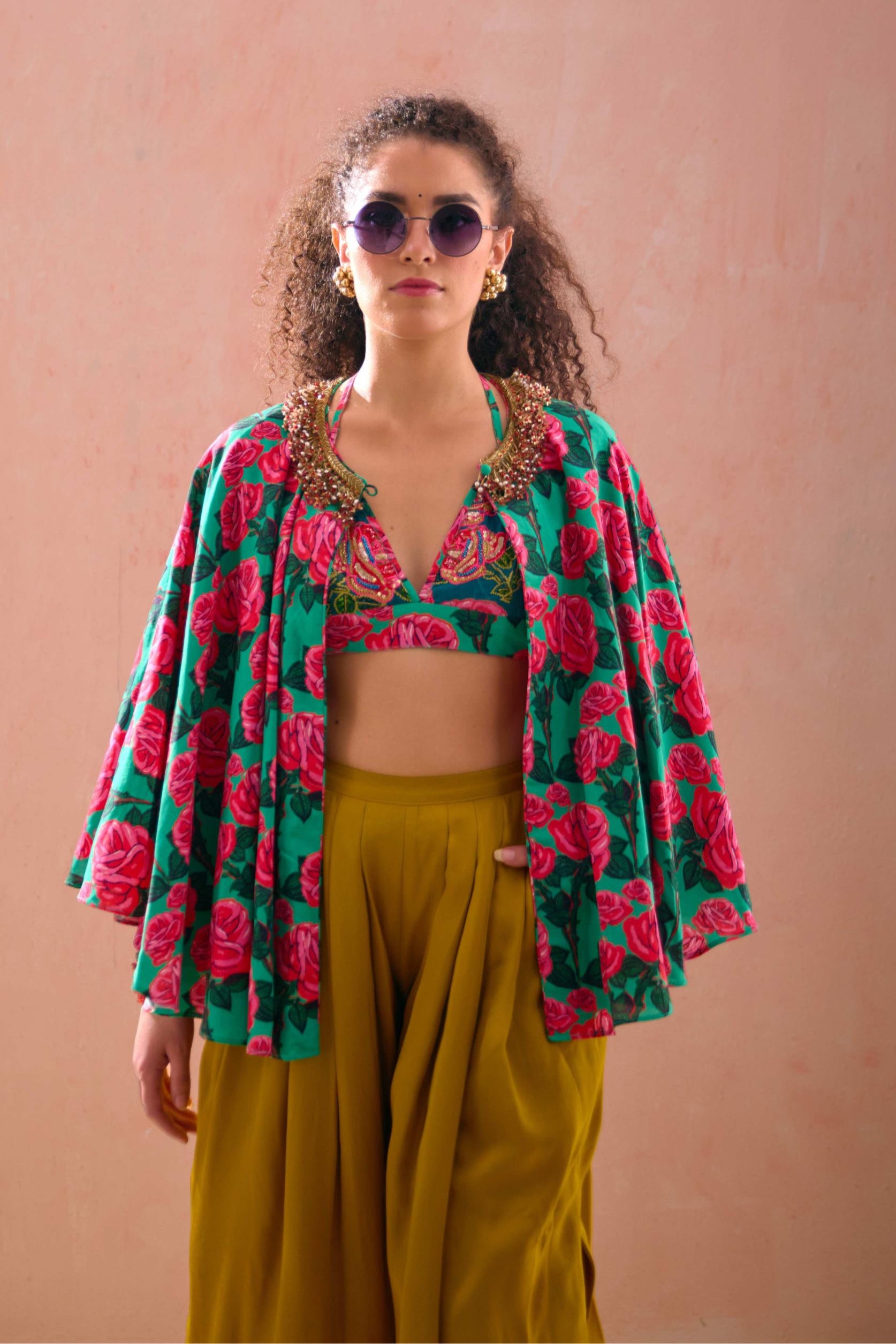 Multicolor rayon printed printed cape with bralette paired solid pant