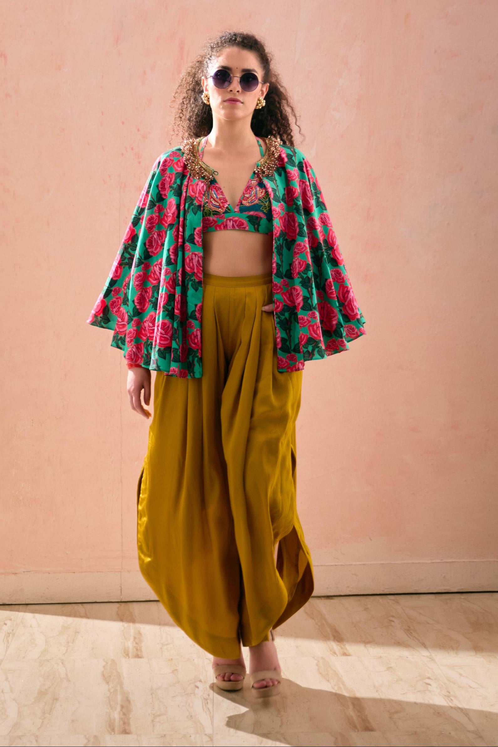 Components: 3 pieces (Bralet, dhoti pant, cape)