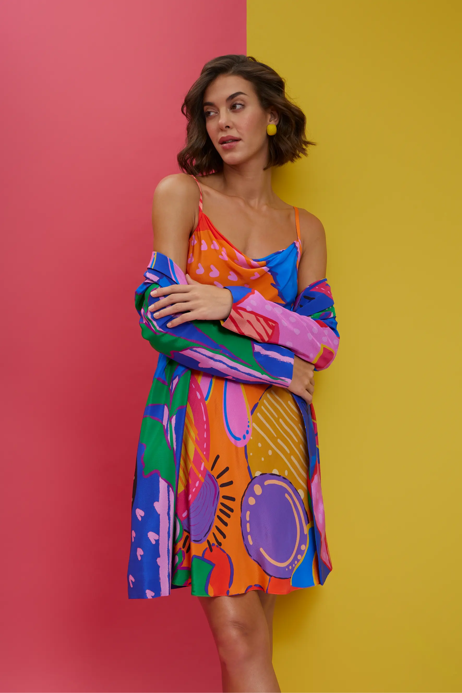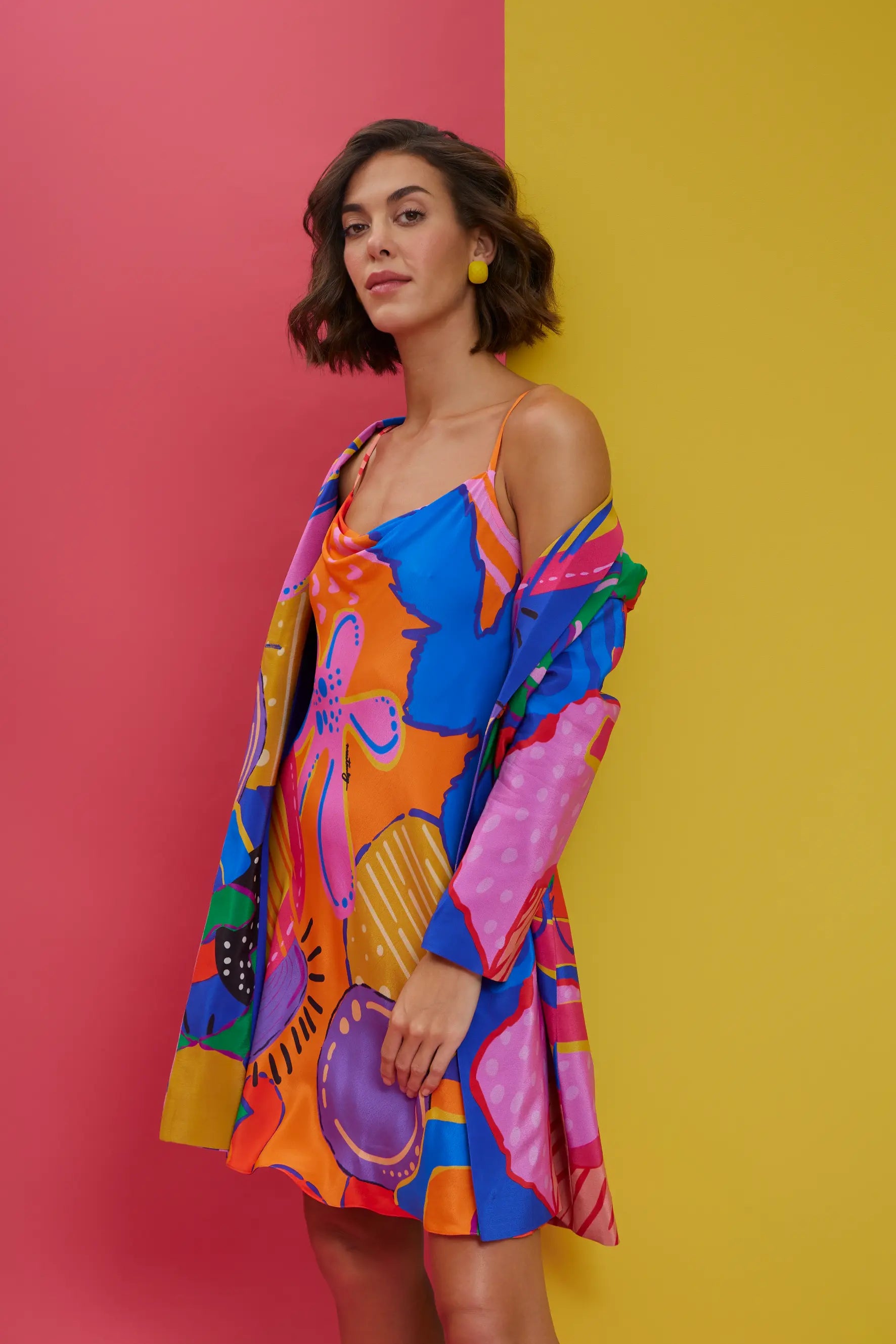 Elevate your style with this stunning multicolor slip dress with blazer. The silky slip dress features a vibrant multicolor pattern, creating a bold and feminine look, while the sleek blazer adds structure and sophistication. Perfect for transitioning from day to night, this ensemble combines effortless elegance with contemporary flair, making it ideal for both formal occasions and stylish evenings out.