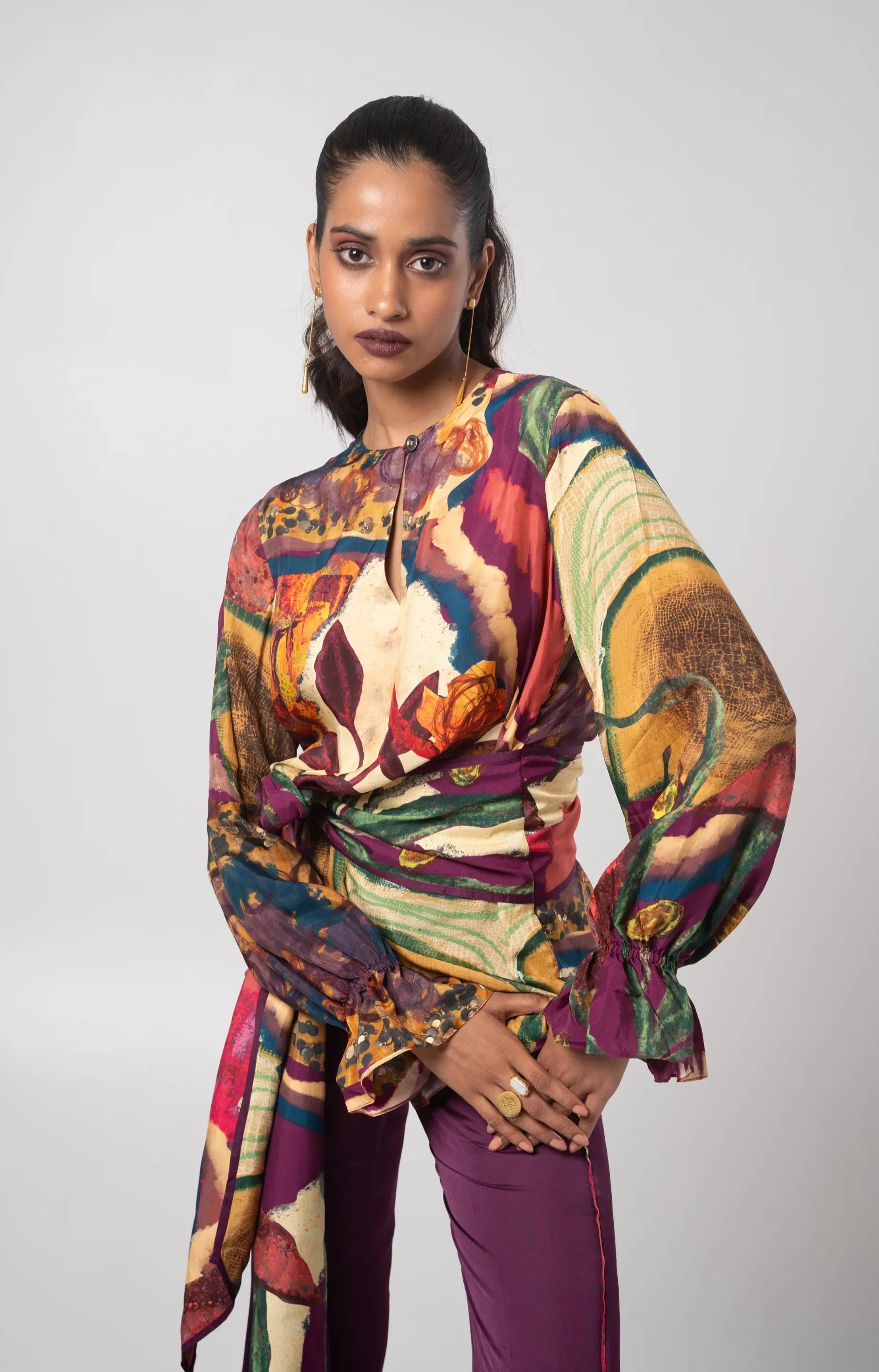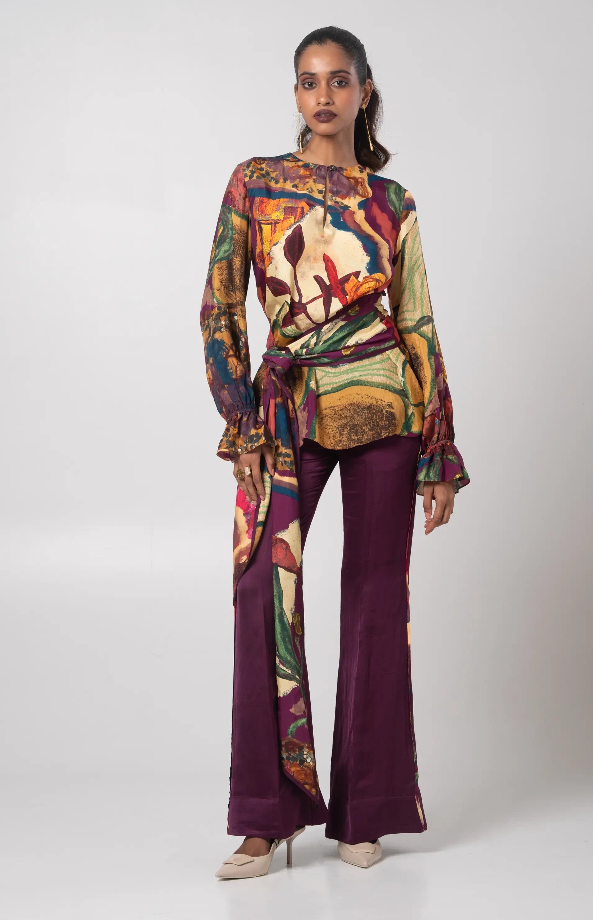 This chic co-ord set offers a perfect balance of sophistication and modern design. The full-sleeve top features a tie-up detail at the waist, allowing you to accentuate your silhouette with a customizable, flattering fit. The top's sleek design is complemented by solid flared trousers that flow elegantly, offering both comfort and style. A contrast piping detail along the side seam of the trousers adds a contemporary touch and enhances the overall look. Ideal for both casual and semi-formal occasions, this versatile ensemble can easily transition from daywear to evening outings, offering effortless style and refined appeal.