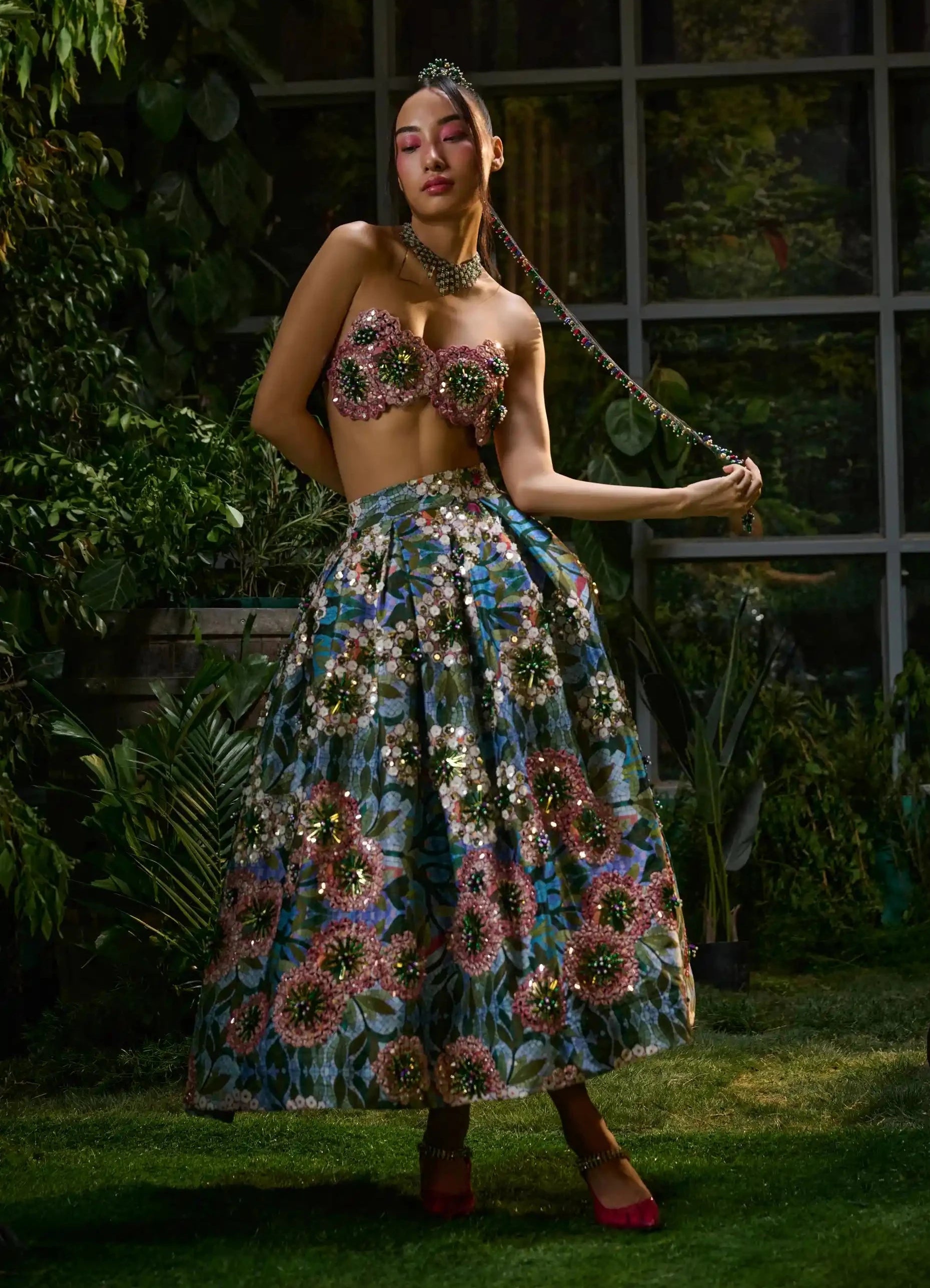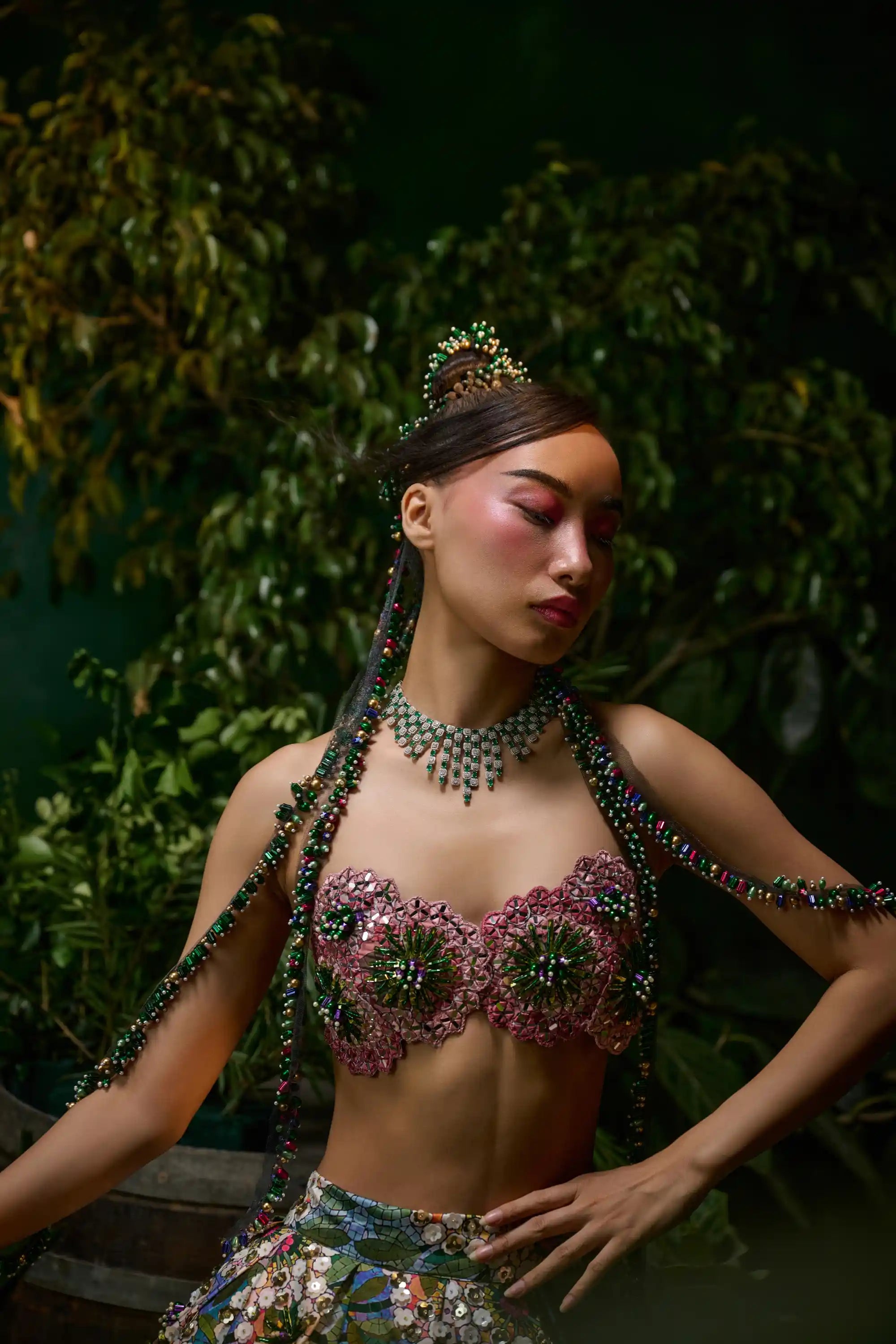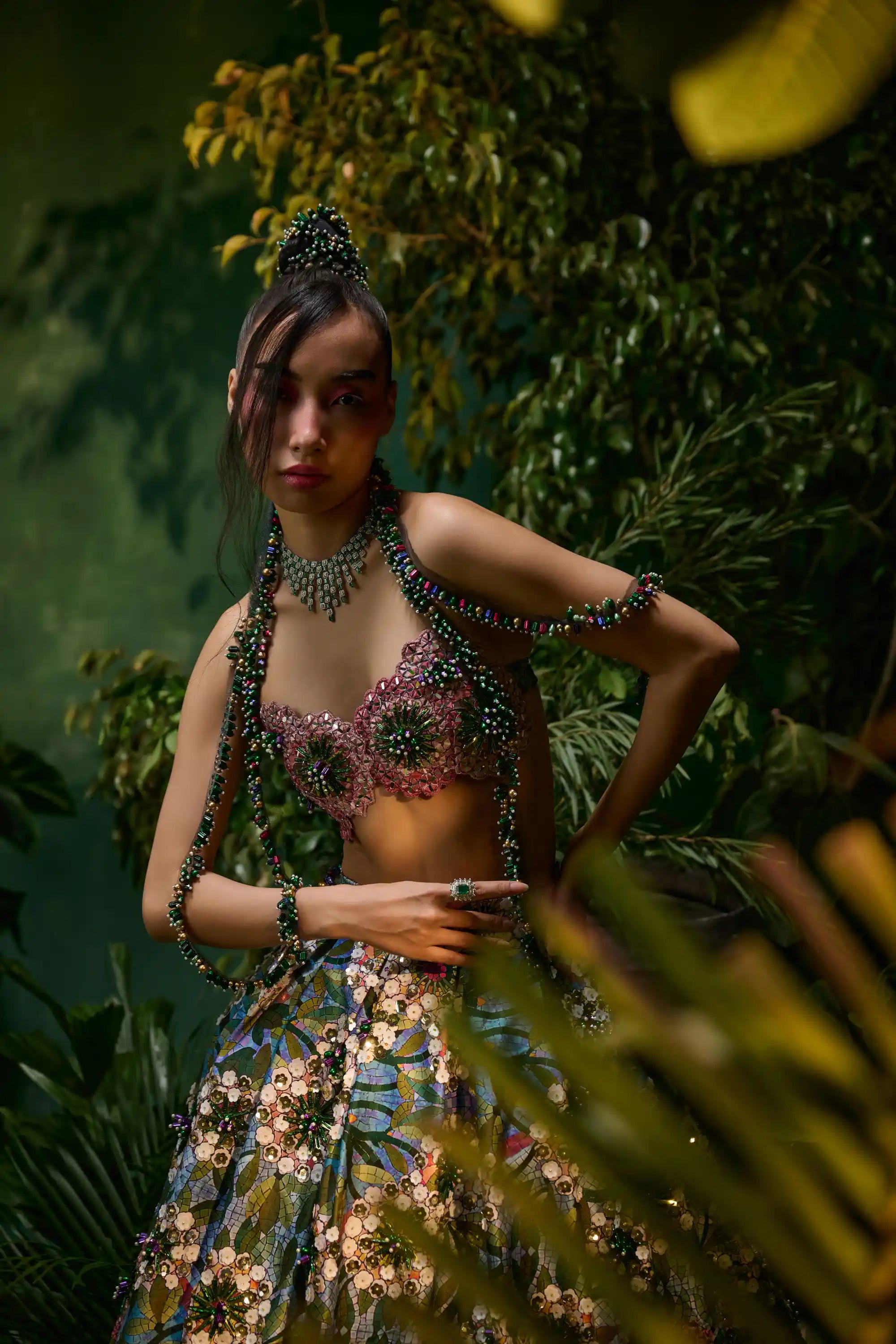 Make a statement with this stunning lehenga set, designed to captivate with its exquisite details and vibrant colors. The voluminous skirt features a mesmerizing blend of textures and embellishments, while the paired corset blouse adds an elegant touch. Perfect for your special occasion, this ensemble promises to turn heads and leave a lasting impression.