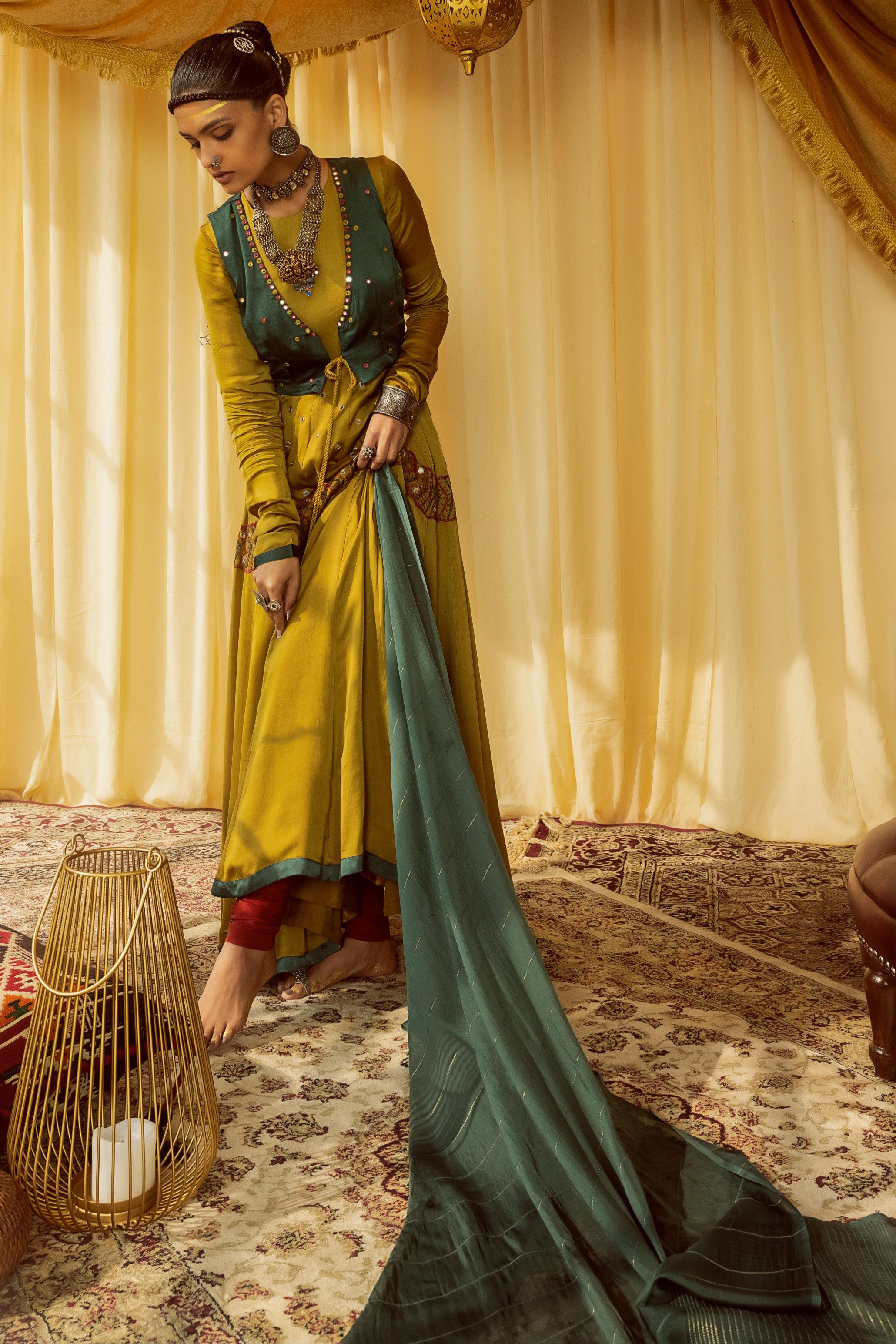 This vibrant mustard Anarkali features intricate hand embroidery along the flare, adding a touch of elegance. Paired with a statement teal waistcoat adorned with delicate mirror work, this ensemble brings a playful yet refined charm. The coordinating teal dupatta, finished with tassel details on the corners, and a classic churidaar complete the lookÑperfect for festive and celebratory occasions.