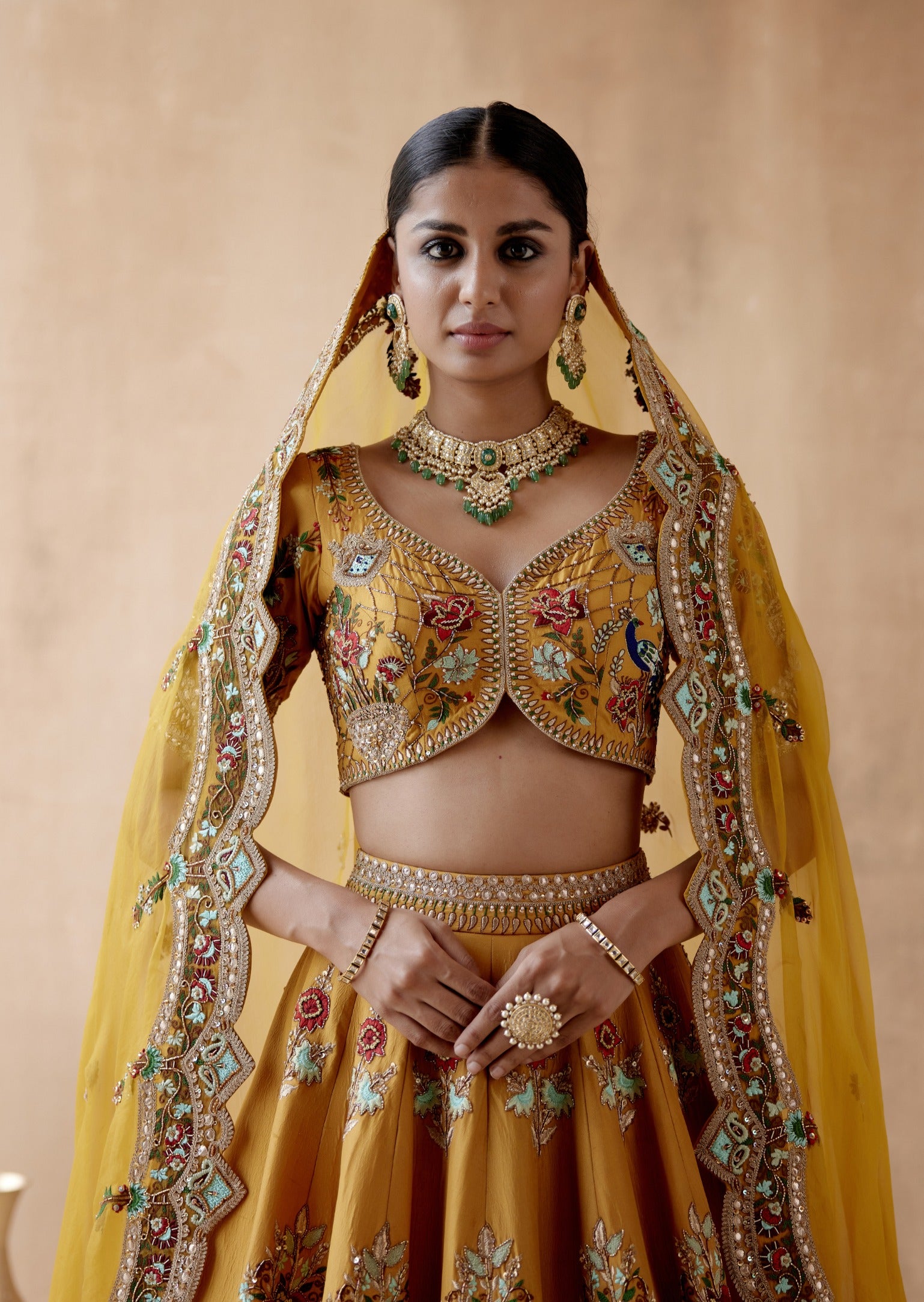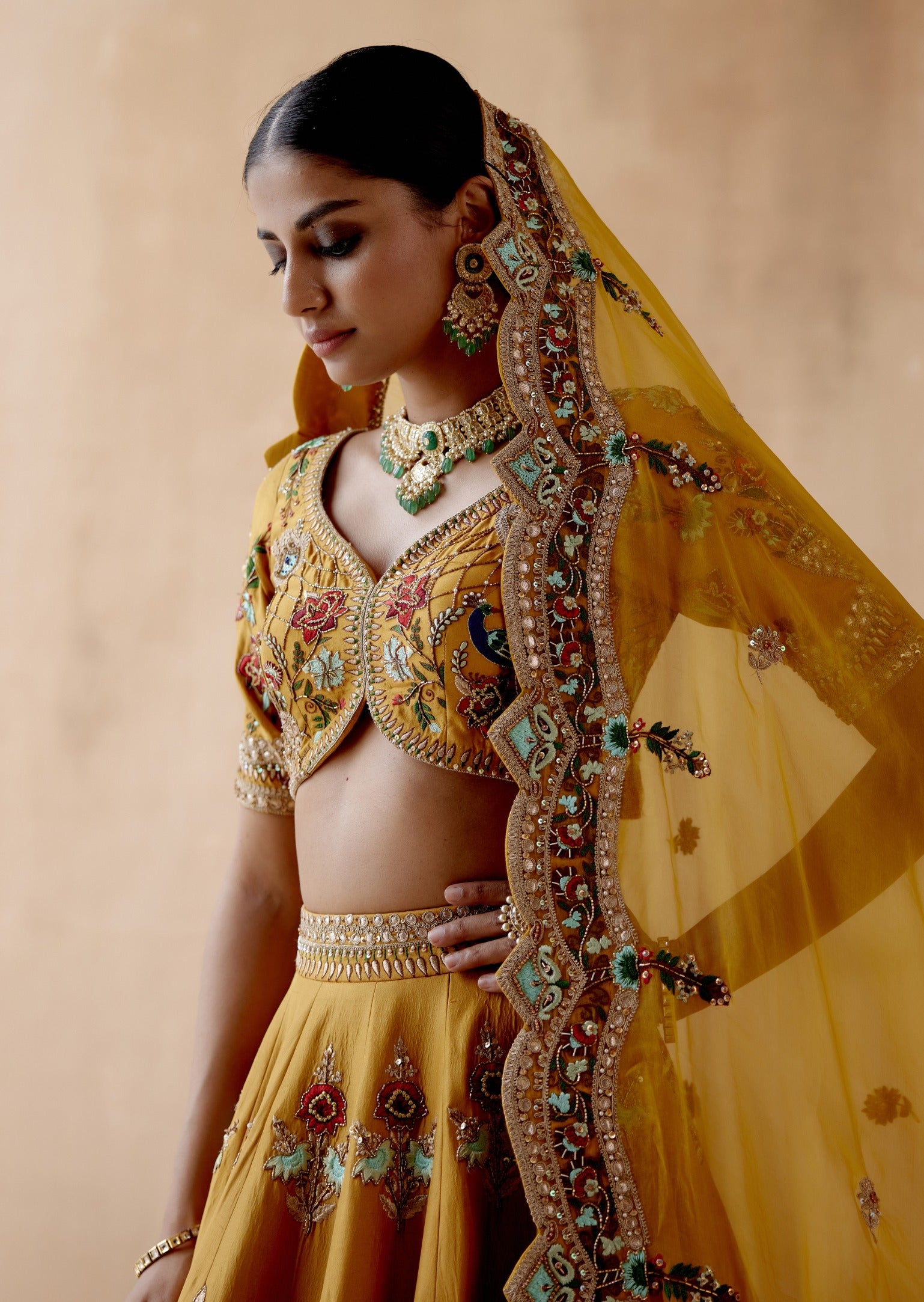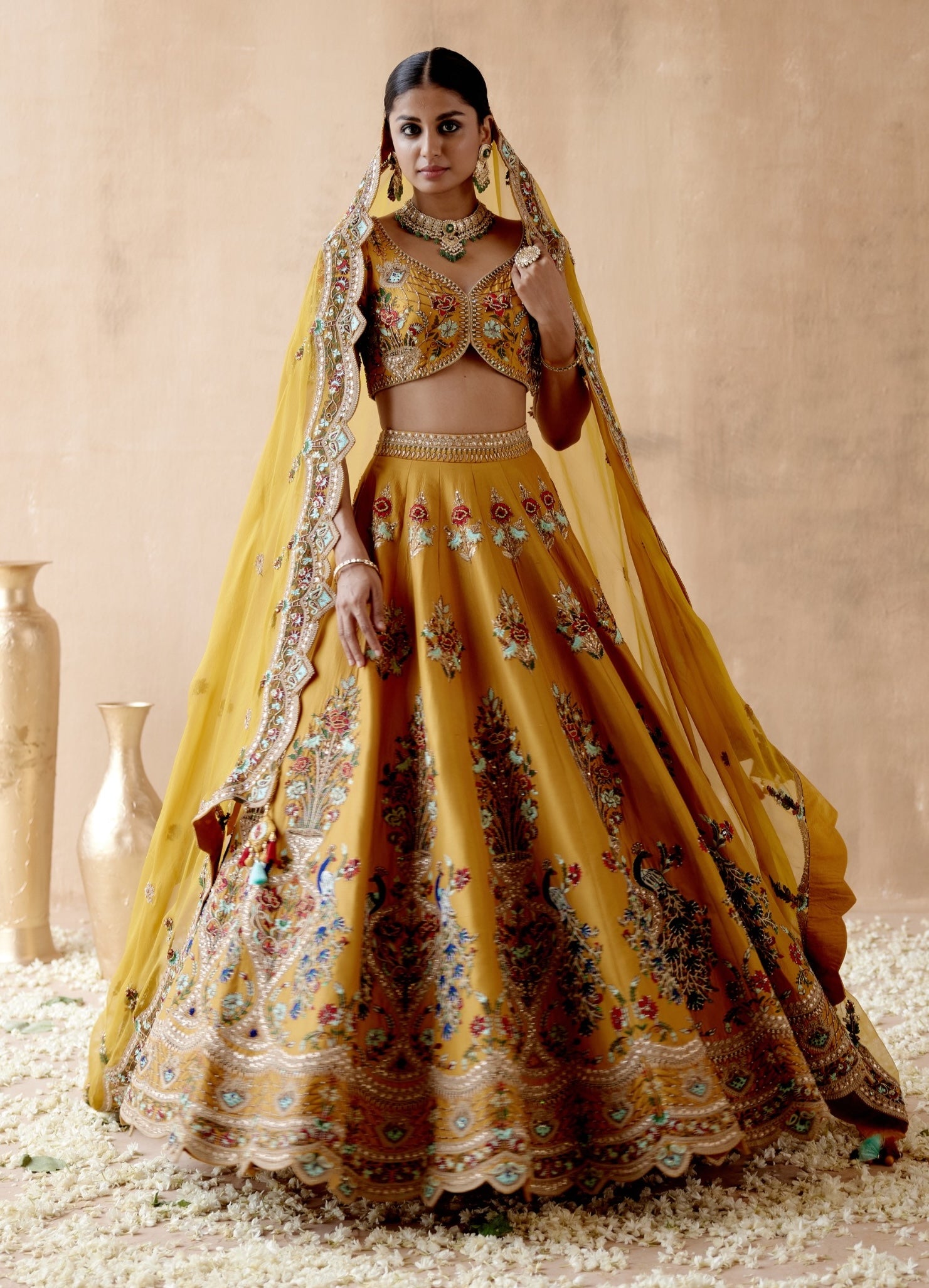 Illuminate your wardrobe with our vibrant mustard dupion silk lehenga set, featuring exquisite floral thread embroidery and adorned with a range of elegant embellishments. This stunning ensemble is paired with a meticulously embroidered blouse and a coordinating dupatta, creating a harmonious and sophisticated look. Perfect for festive celebrations and special events, this lehenga set combines rich texture and intricate detailing to offer a bold yet timeless appearance.