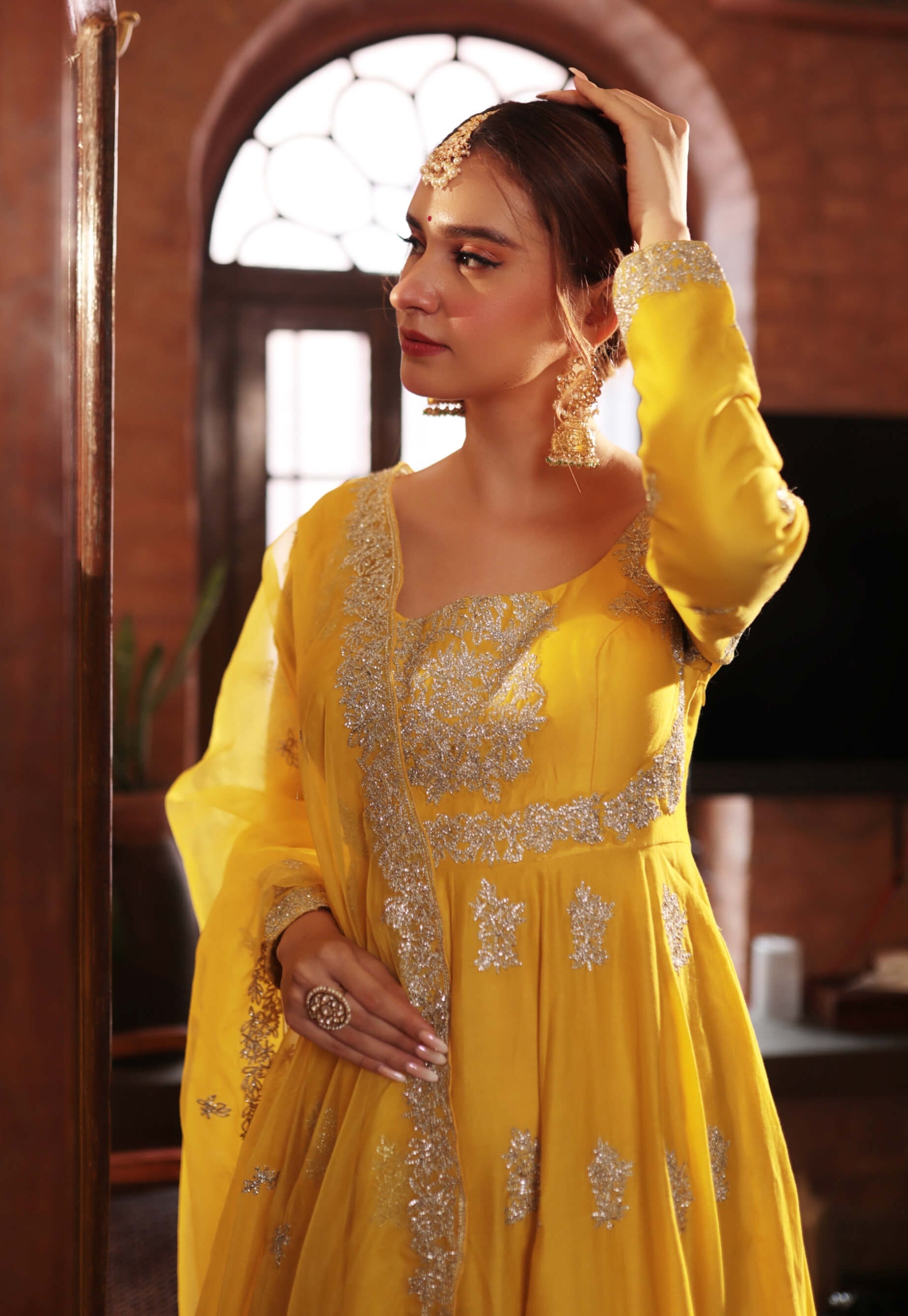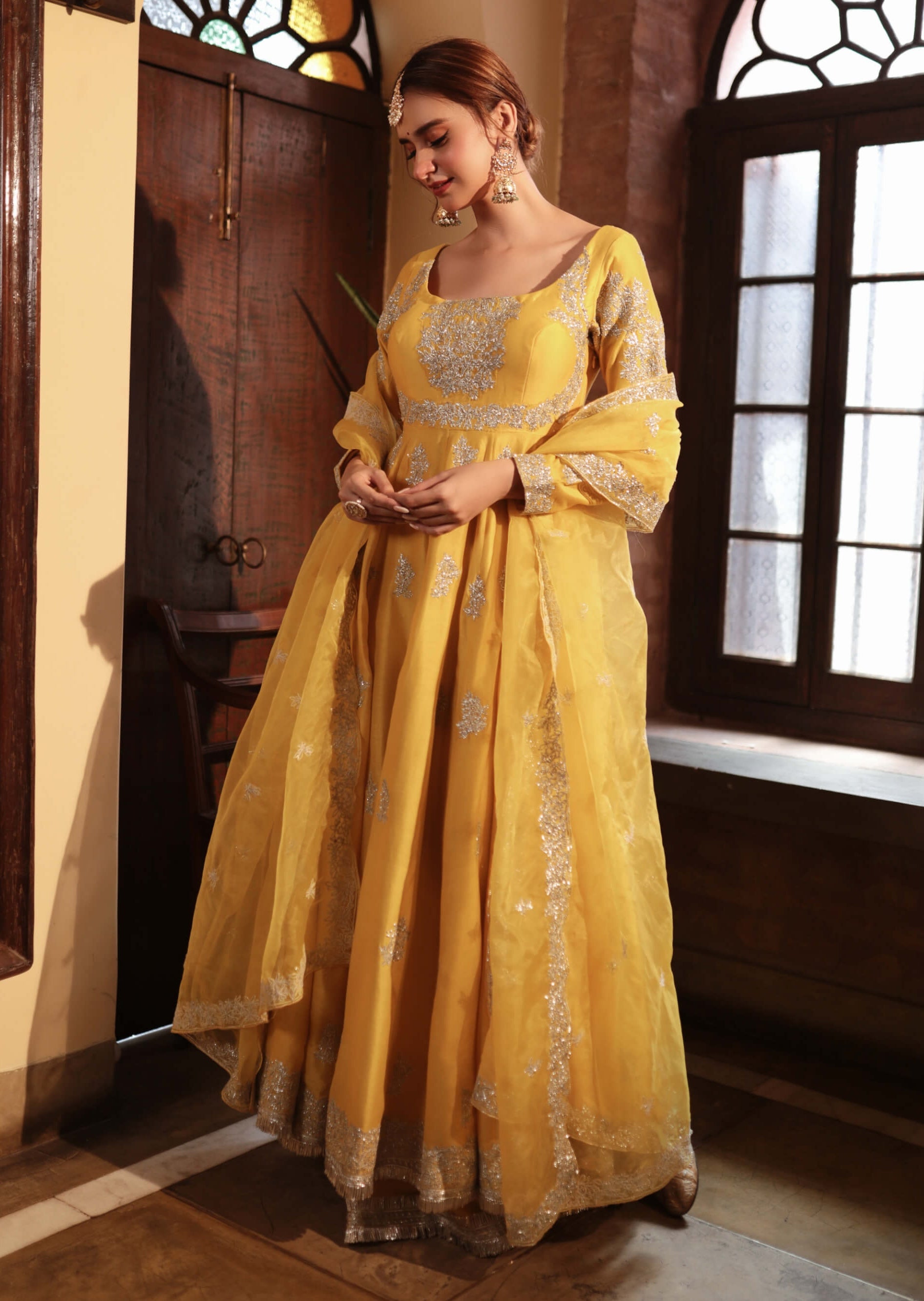 The mustard embroidered angrakha gown is a captivating anarkali set crafted from mustard chanderi lace. The gown features intricate embroidery that enhances the elegant design of the angrakha style. This anarkali set combines traditional craftsmanship with a modern silhouette, creating a refined and striking look perfect for special occasions.