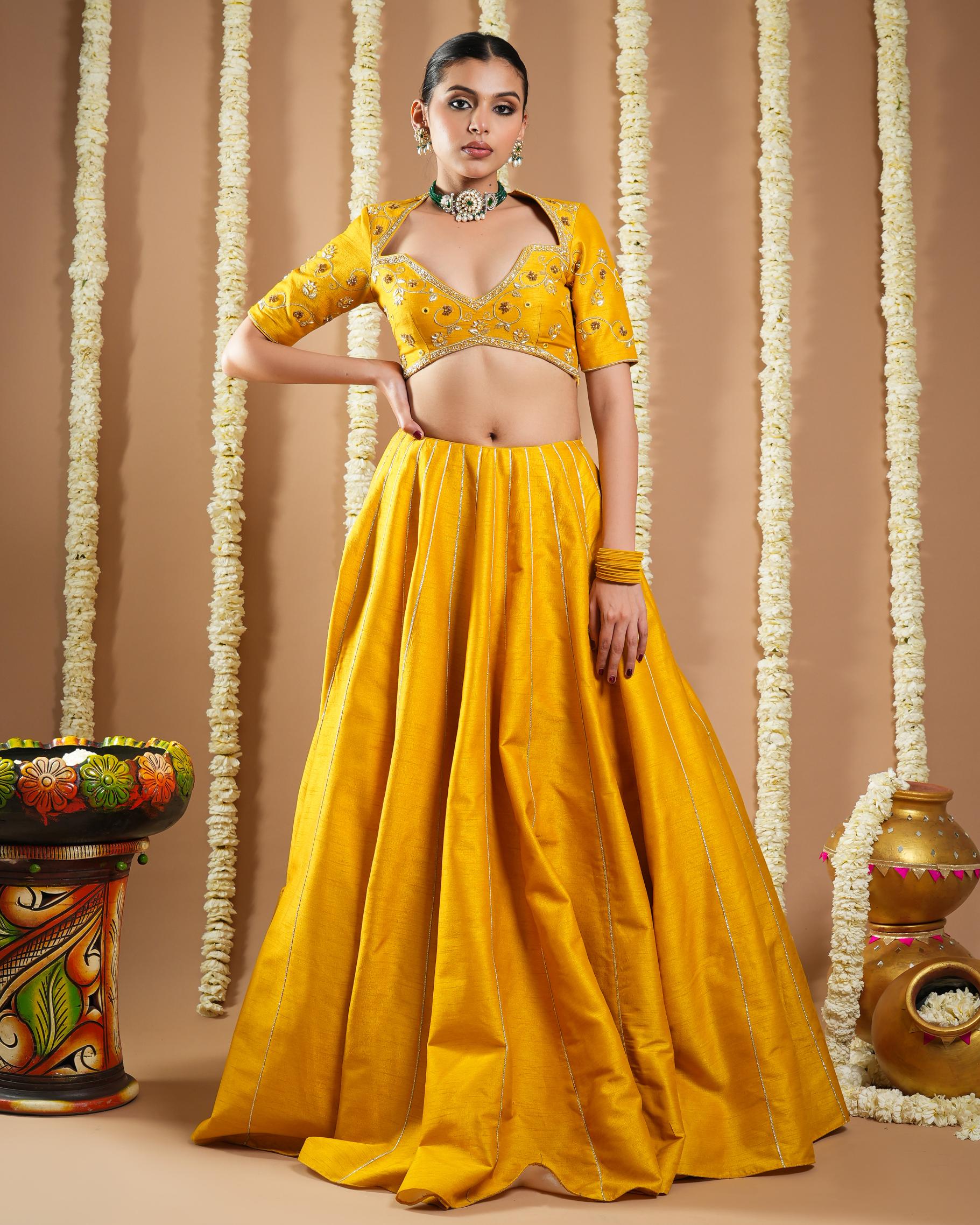 Turn heads in the Mustard Yellow Heavy Slub Avyanna Lehenga Set. Featuring rich texture and vibrant elegance, this ensemble is perfect for weddings, festive celebrations, and grand occasions.