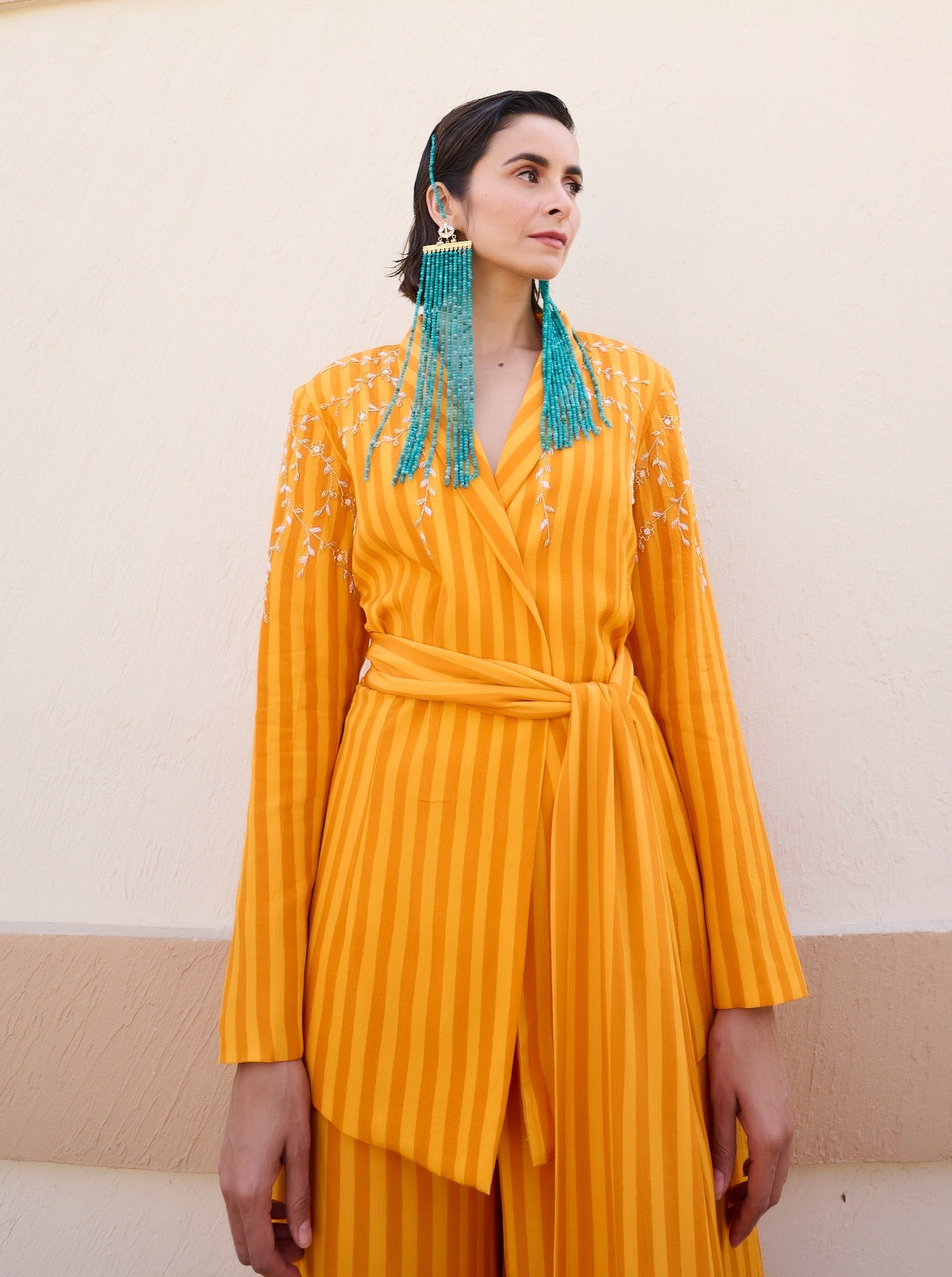Elevate your wardrobe with our striped jaal embroidered tie-knot jacket, showcasing intricate embroidery that adds a touch of classic sophistication. The unique tie-knot design offers a customizable fit and modern flair. Paired with coordinating pants, this ensemble creates a polished and cohesive look suitable for both formal and semi-formal events. Embrace timeless elegance with this beautifully crafted outfit, blending traditional embroidery with contemporary style for a standout appearance.