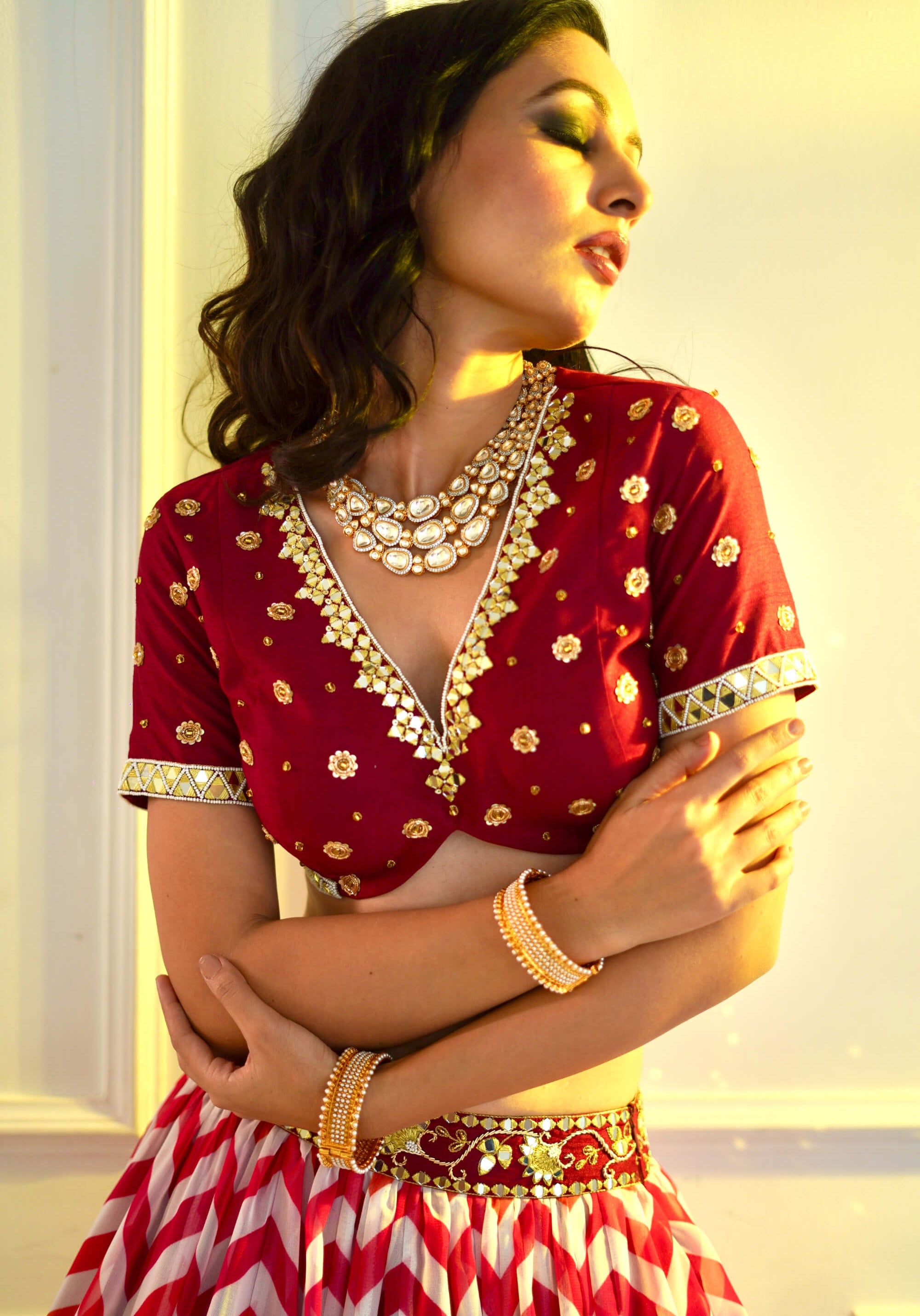 Experience the epitome of grace with our silk blouse paired elegantly with a georgette chevron lehenga, complemented by a delicate net dupatta. The silk blouse exudes luxurious charm with its smooth texture and timeless appeal, while the georgette chevron lehenga adds a modern twist with its sophisticated chevron pattern. The ensemble is beautifully completed by the net dupatta, which adds a light, ethereal layer and enhances the overall elegance of the outfit. Perfect for celebratory occasions, this ensemble promises to elevate your style with its blend of traditional craftsmanship and contemporary design.