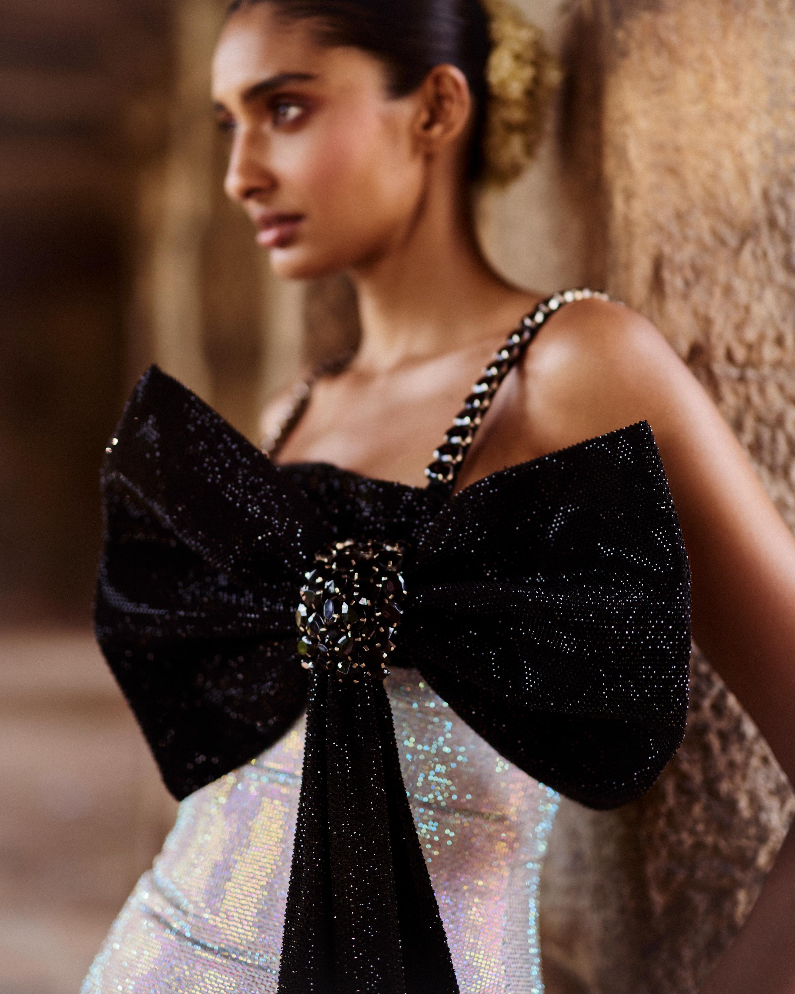 Turn heads with this sophisticated white short dress, crafted from melon crepe and featuring an attached corset for a structured fit. A statement black bow on the shoulder and black stone-embellished straps add a bold, glamorous touch, making it perfect for chic parties and upscale events.