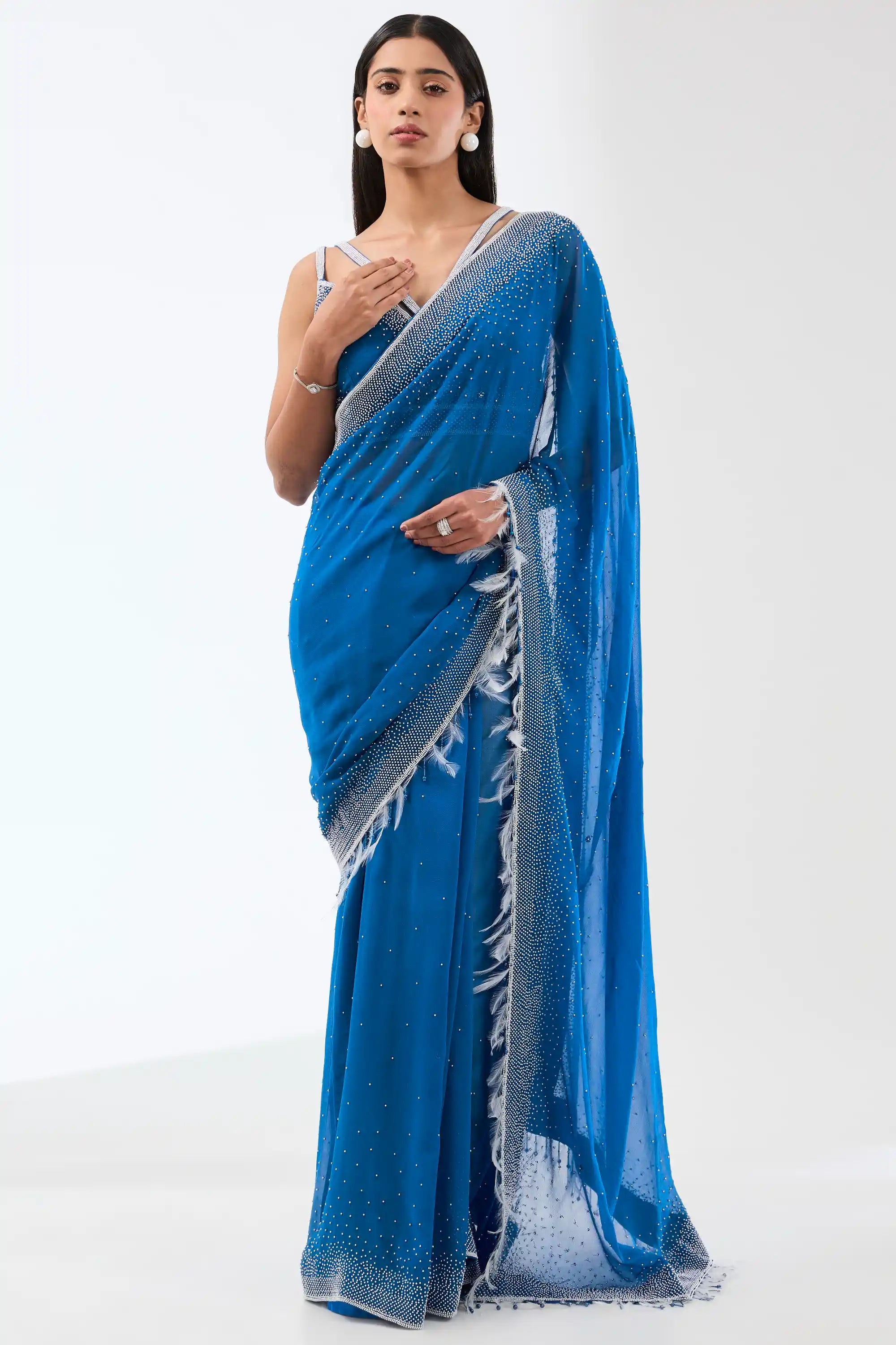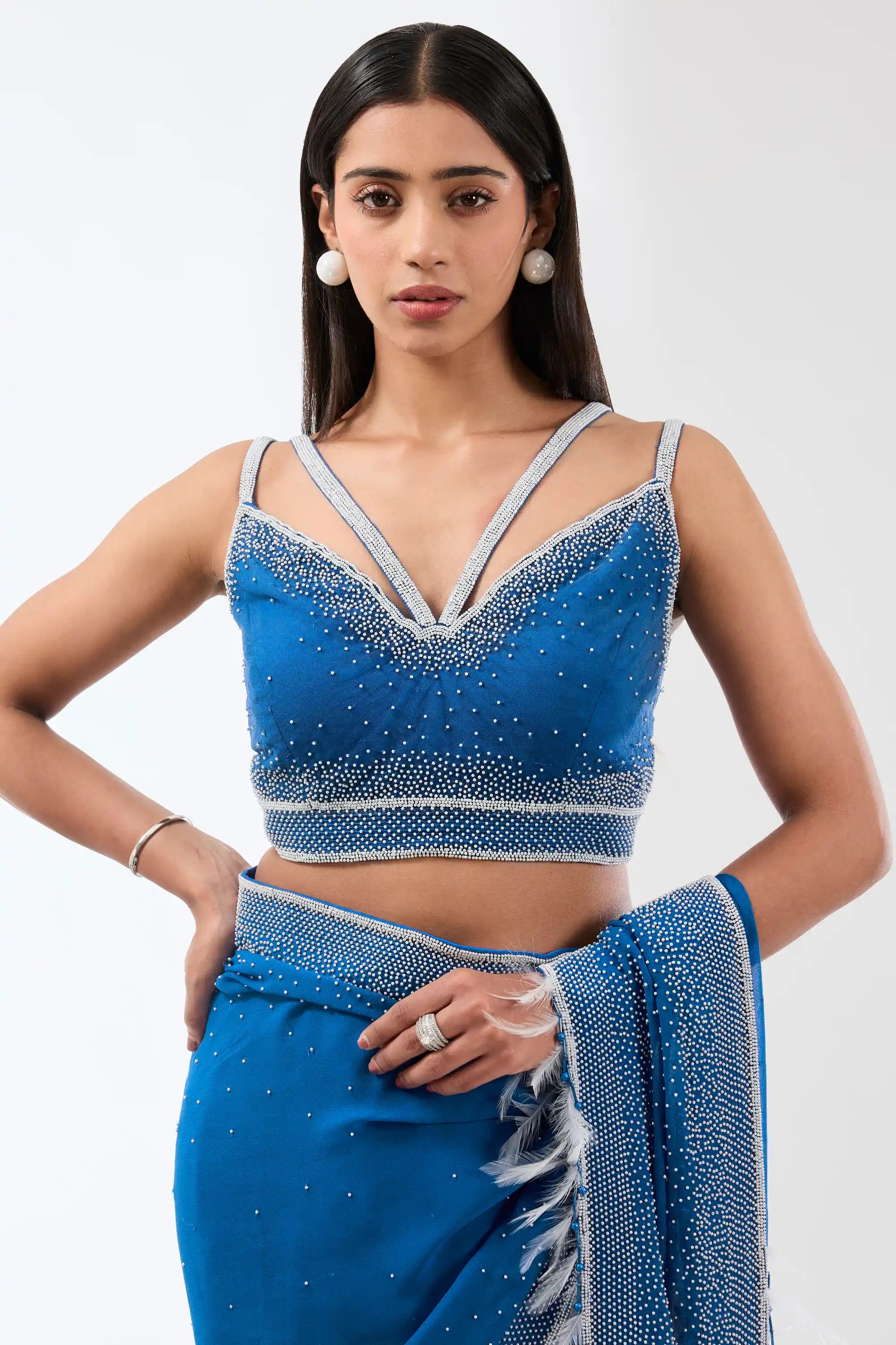 Make a statement with this stunning blue georgette saree set, featuring intricate hand embroidery in a pearl burst design. The exquisite feather detailing at the palla adds a unique touch, elevating the overall look. Perfect for special occasions, this ensemble beautifully blends elegance with modern flair.