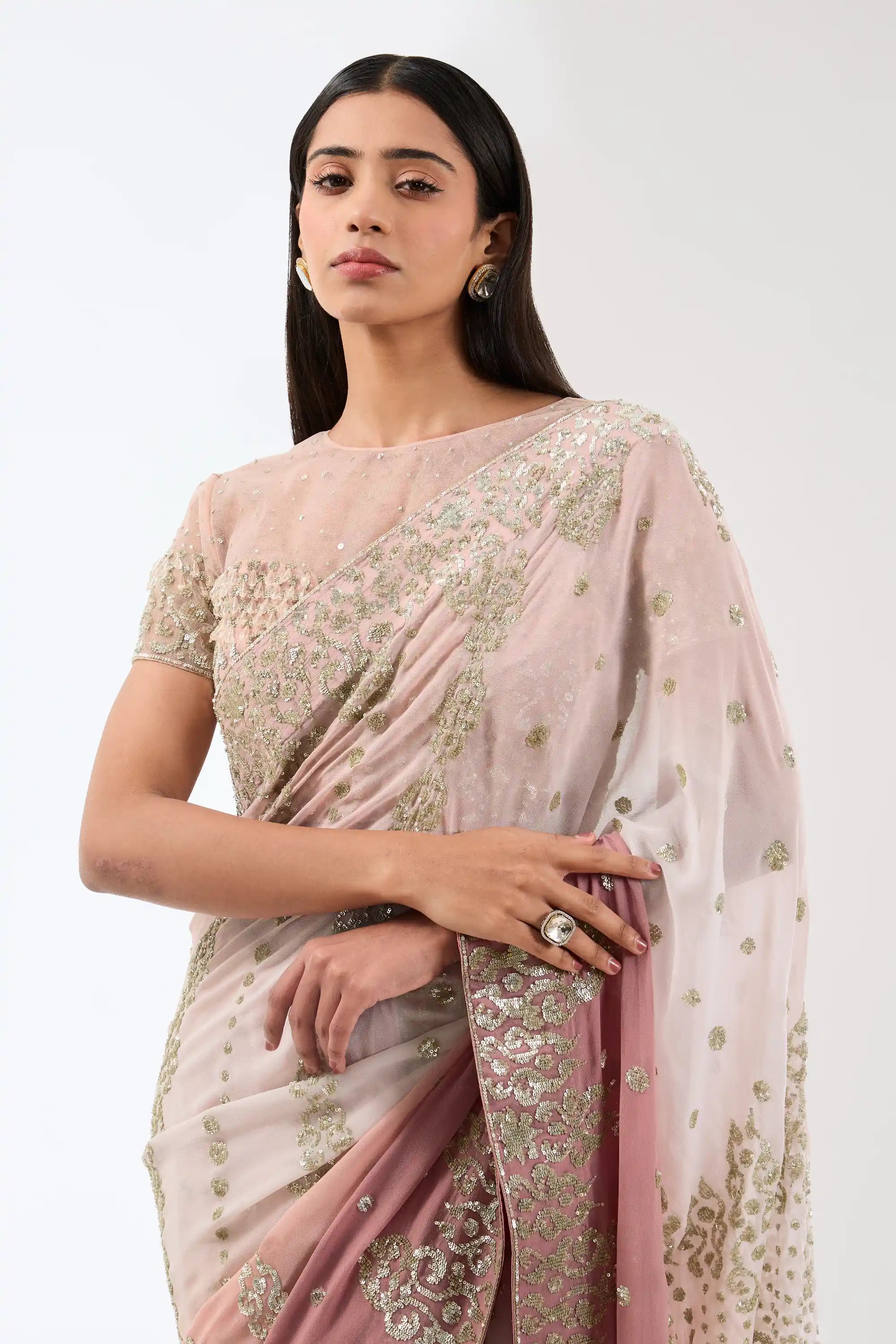 Elevate your elegance with this old rose georgette saree set, featuring exquisite hand embroidery in a beautiful thali palla design. The soft, flowing fabric drapes gracefully, making it perfect for weddings and festive occasions. This ensemble combines traditional craftsmanship with a romantic flair, ensuring you stand out in style.
