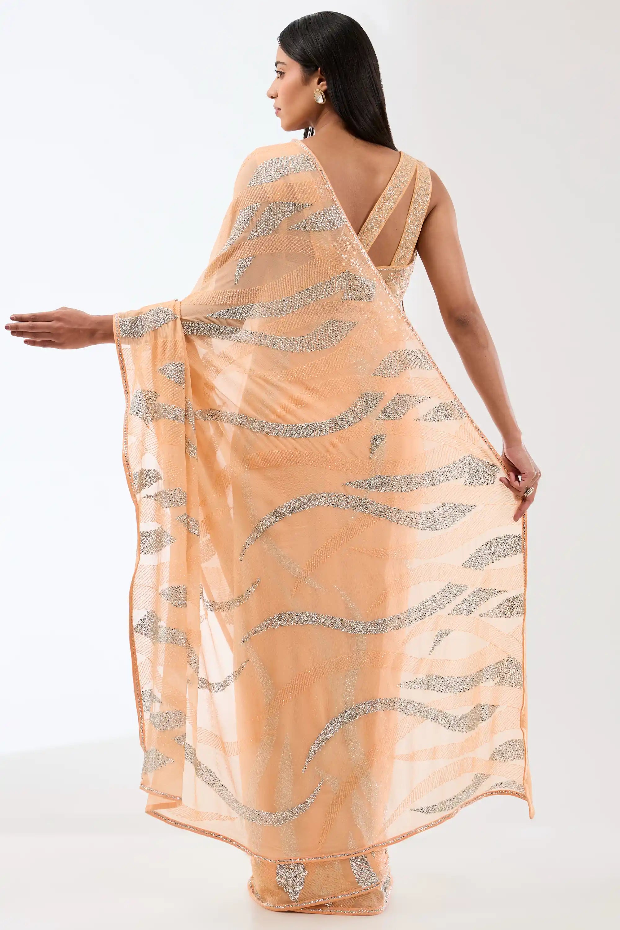 Embrace romance with this enchanting peach chiffon saree set, adorned with exquisite hand-embroidered roses and flames in a delicate jaal pattern. The soft fabric drapes beautifully, making it perfect for festive occasions or special events. This stunning ensemble effortlessly combines elegance and artistry for a timeless look.