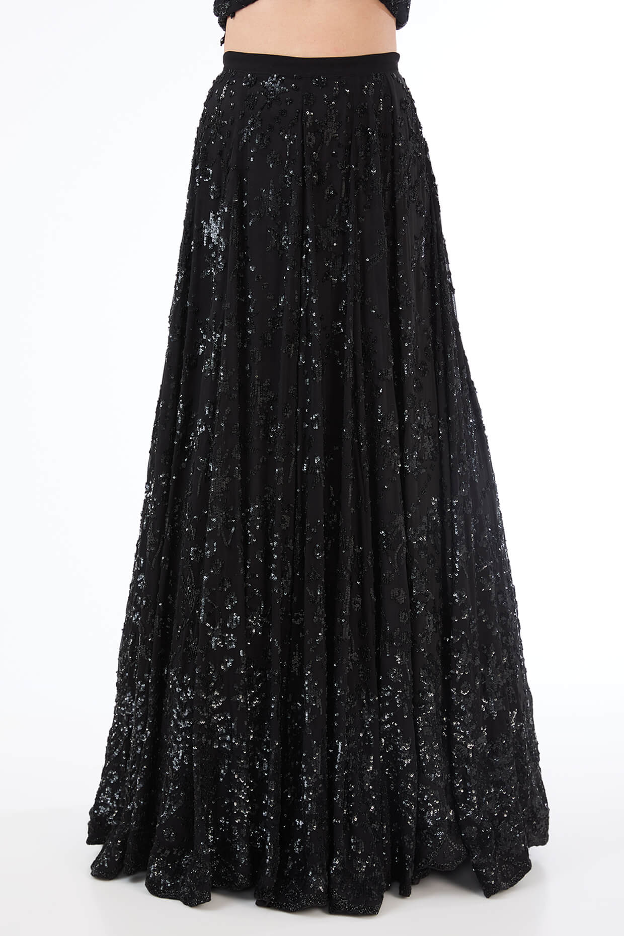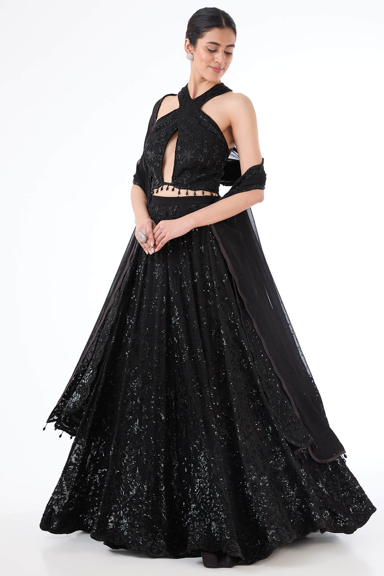 This lehenga set offers a graceful and timeless silhouette, perfect for making a statement at weddings, formal events, or special occasions. The combination of the deep black hue and the intricate handwork ensures a look of refined luxury and unforgettable style.
