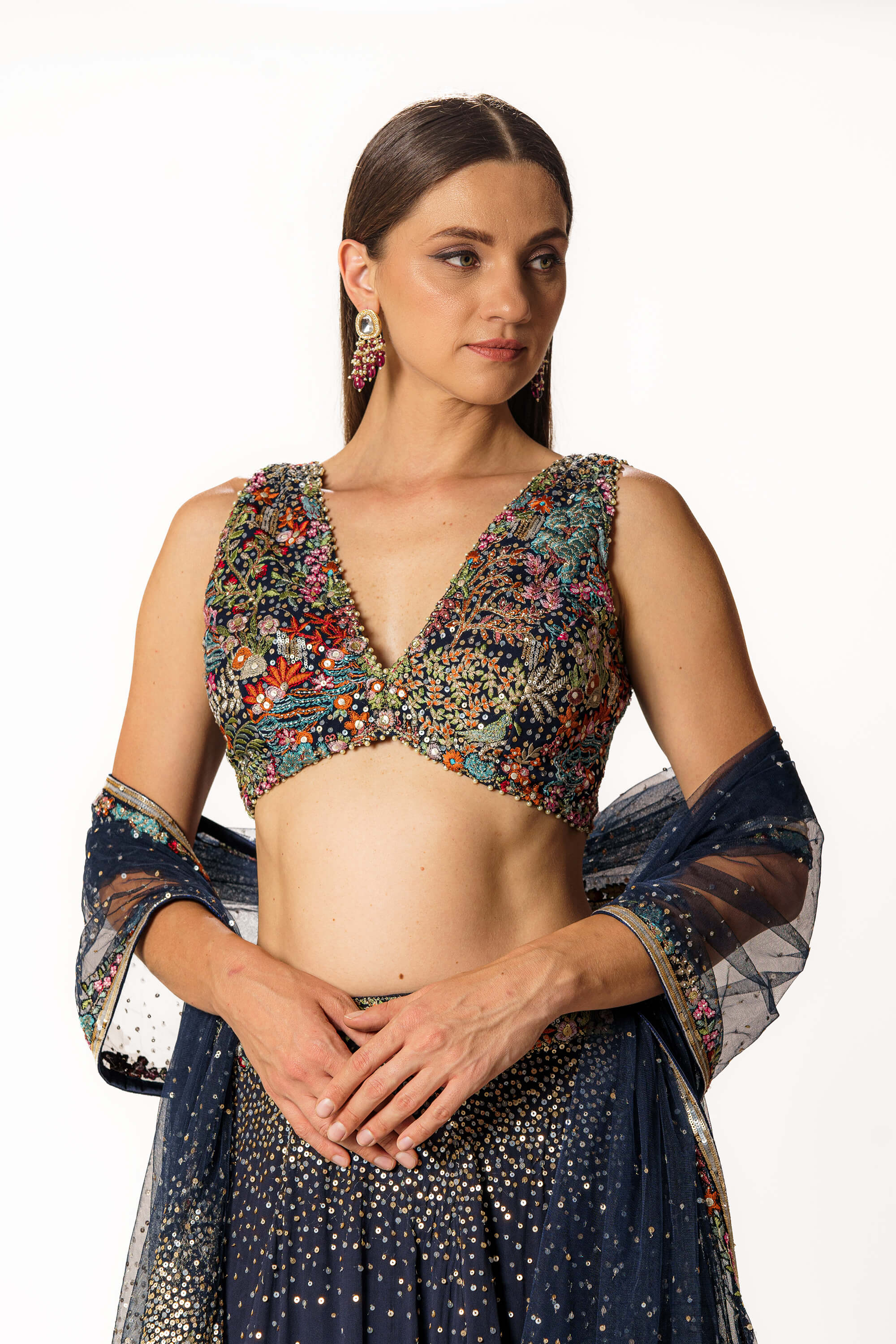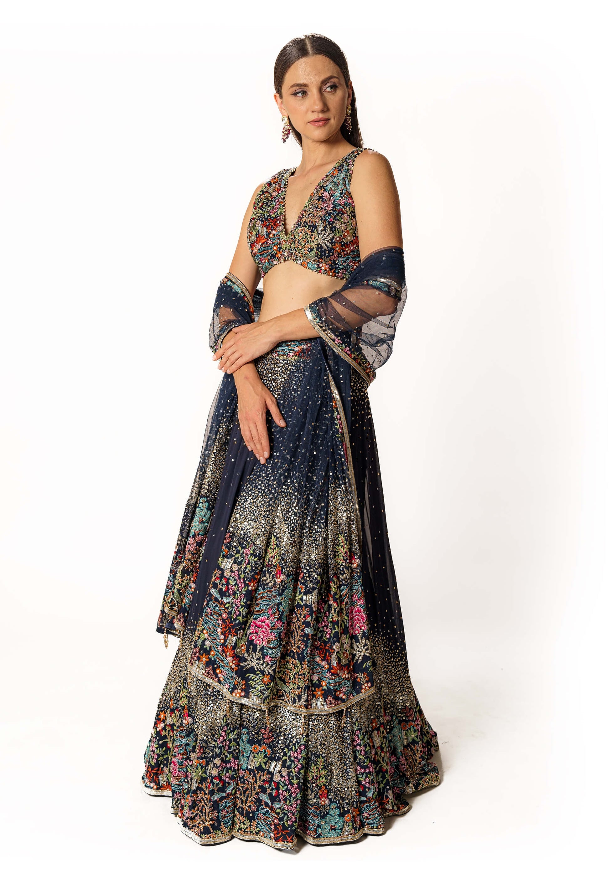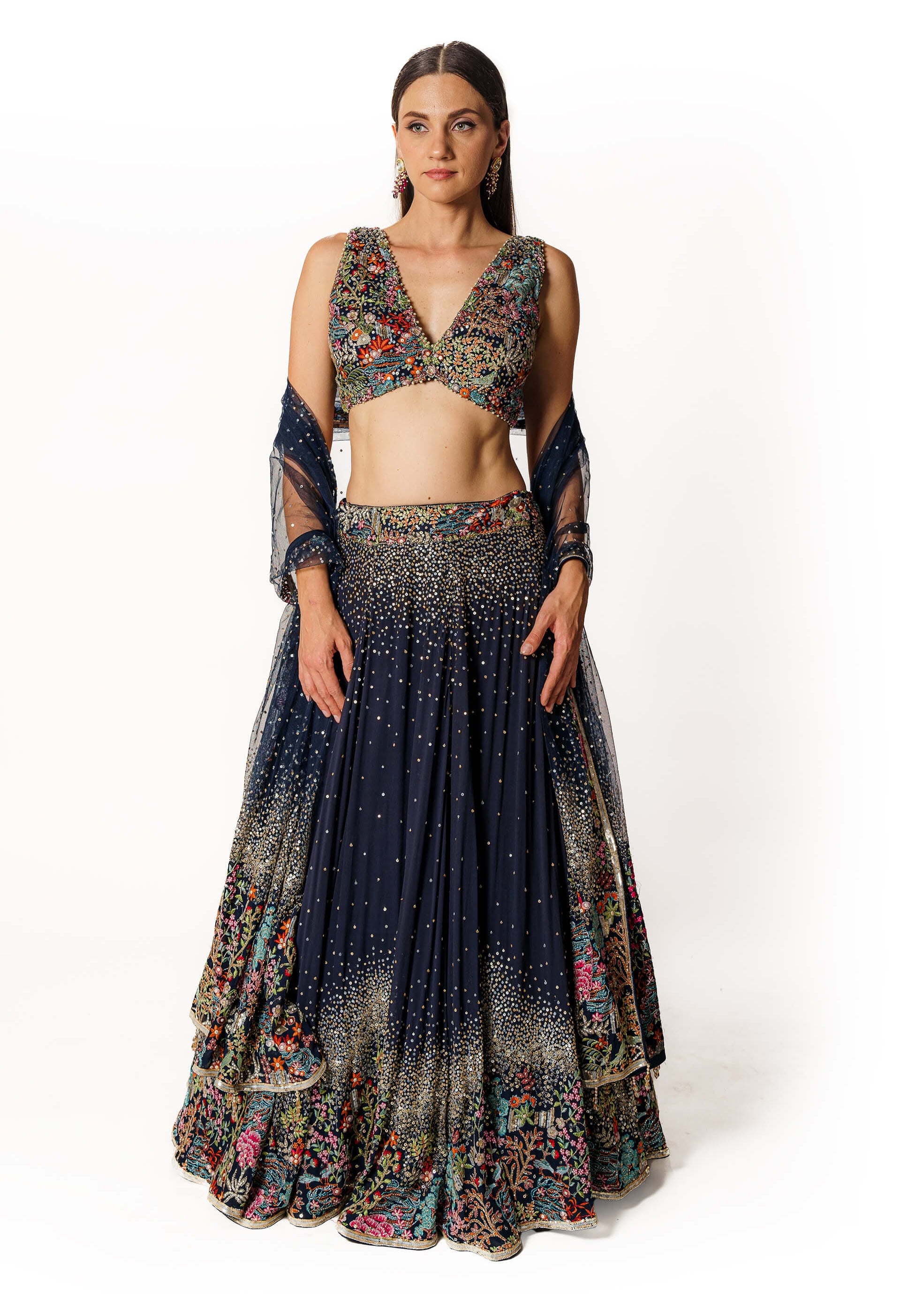 Perfect for weddings, formal events, and special occasions, the nadia lehenga set offers a graceful and stylish silhouette. The rich blue georgette, combined with the elaborate resham and sequin work, ensures a memorable appearance that radiates sophistication and elegance.