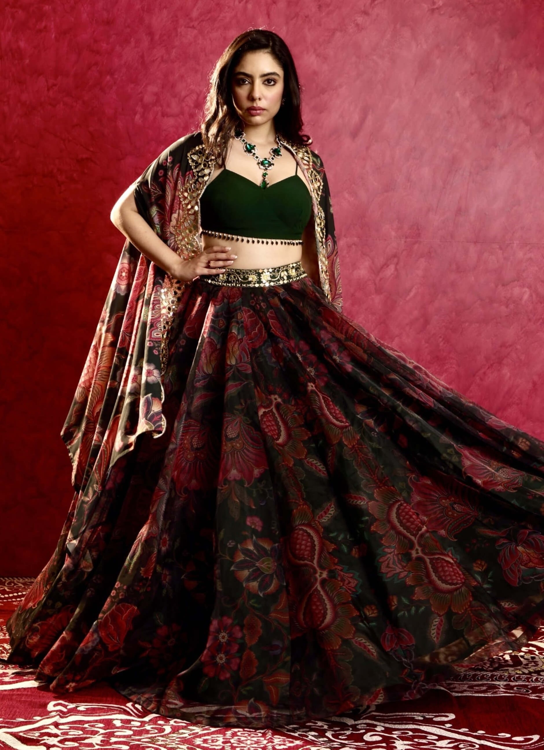 Step into sophistication with an emerald green silk hand-embroidered corset paired elegantly with a hand-embroidered silk lehenga and a georgette choker dupatta. The corset boasts intricate hand embroidery, exuding timeless beauty and allure. The silk lehenga, also meticulously embroidered, blends tradition with modernity flawlessly. Complete your ensemble with the georgette choker dupatta, adding a touch of elegance and grace. Ideal for weddings and special occasions, this ensemble epitomizes luxury and refinement, ensuring you radiate elegance with every step you take.
