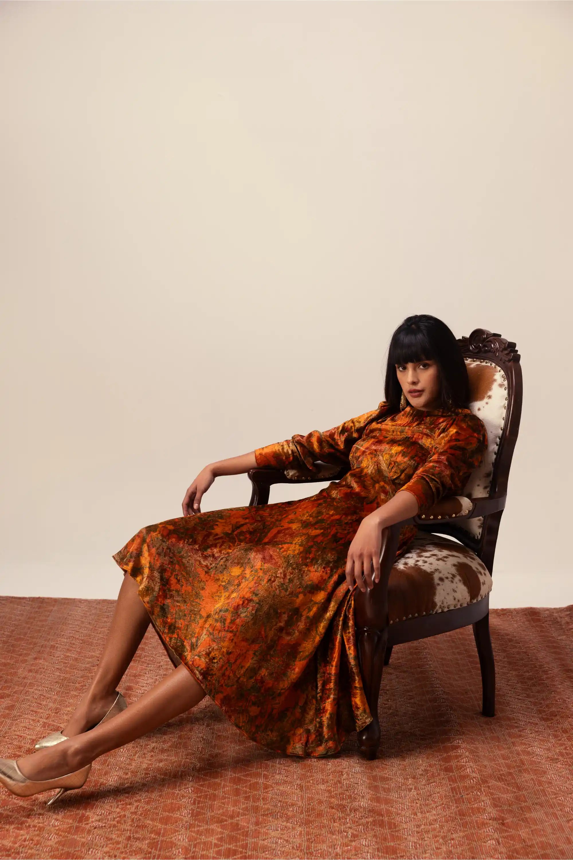 Make a statement with our stunning midi dress, featuring a striking abstract floral print in a rich rust hue. Crafted from soft viscose velvet, this dress combines luxurious comfort with an eye-catching design. Its flattering silhouette flows beautifully, making it perfect for any occasion, from brunch to evening events. Elevate your wardrobe with this versatile piece that effortlessly merges style and sophistication!