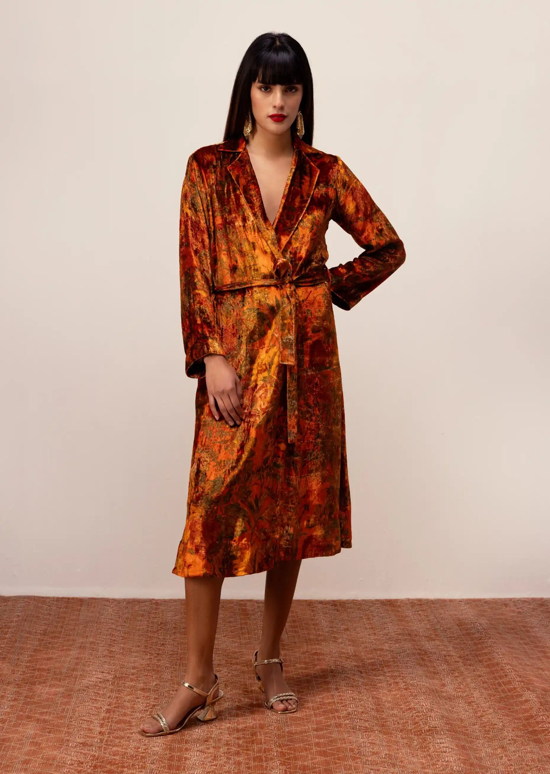Step into elegance with our robe midi dress, featuring a captivating abstract floral print that exudes sophistication. Crafted from soft rust viscose velvet, this dress offers a luxurious touch and a comfortable fit, perfect for any occasion. The flowing silhouette adds a touch of grace, while the vibrant colors make a bold statement. Elevate your style with this versatile piece that beautifully combines comfort and chic design!