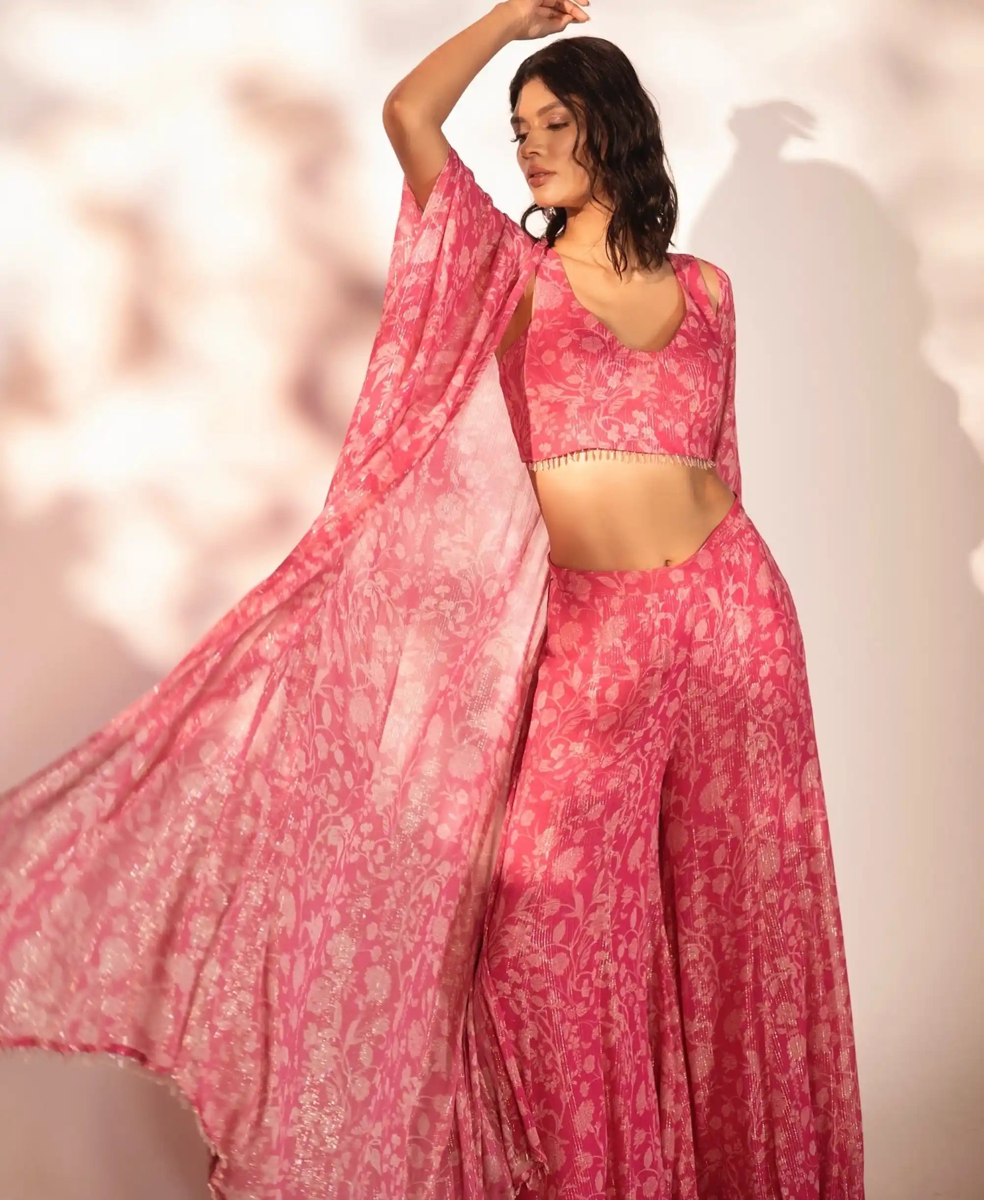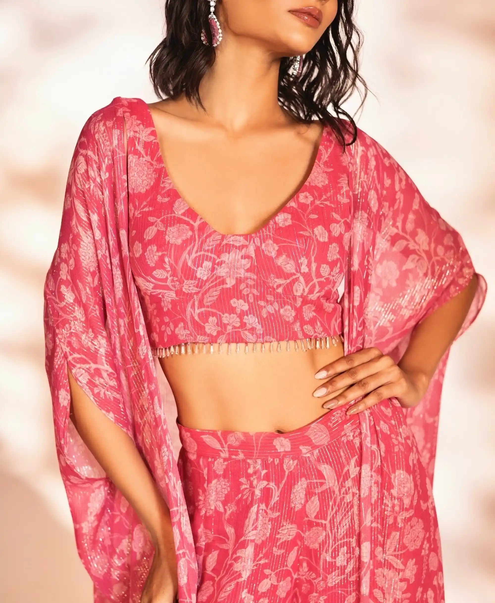 Elevate your style with our pink printed cape pants and blouse set designed for the fashion-forward individual. This stunning ensemble features a vibrant pink print that exudes elegance while the flowy cape adds a modern flair. Adorned with crystal embellishments along the hem the cape catches the light beautifully making it perfect for both daytime and evening events. The comfortable pants and chic blouse complete the look ensuring you feel as fabulous as you look. Effortlessly sophisticated this set is ideal for making a statement at any occasion!