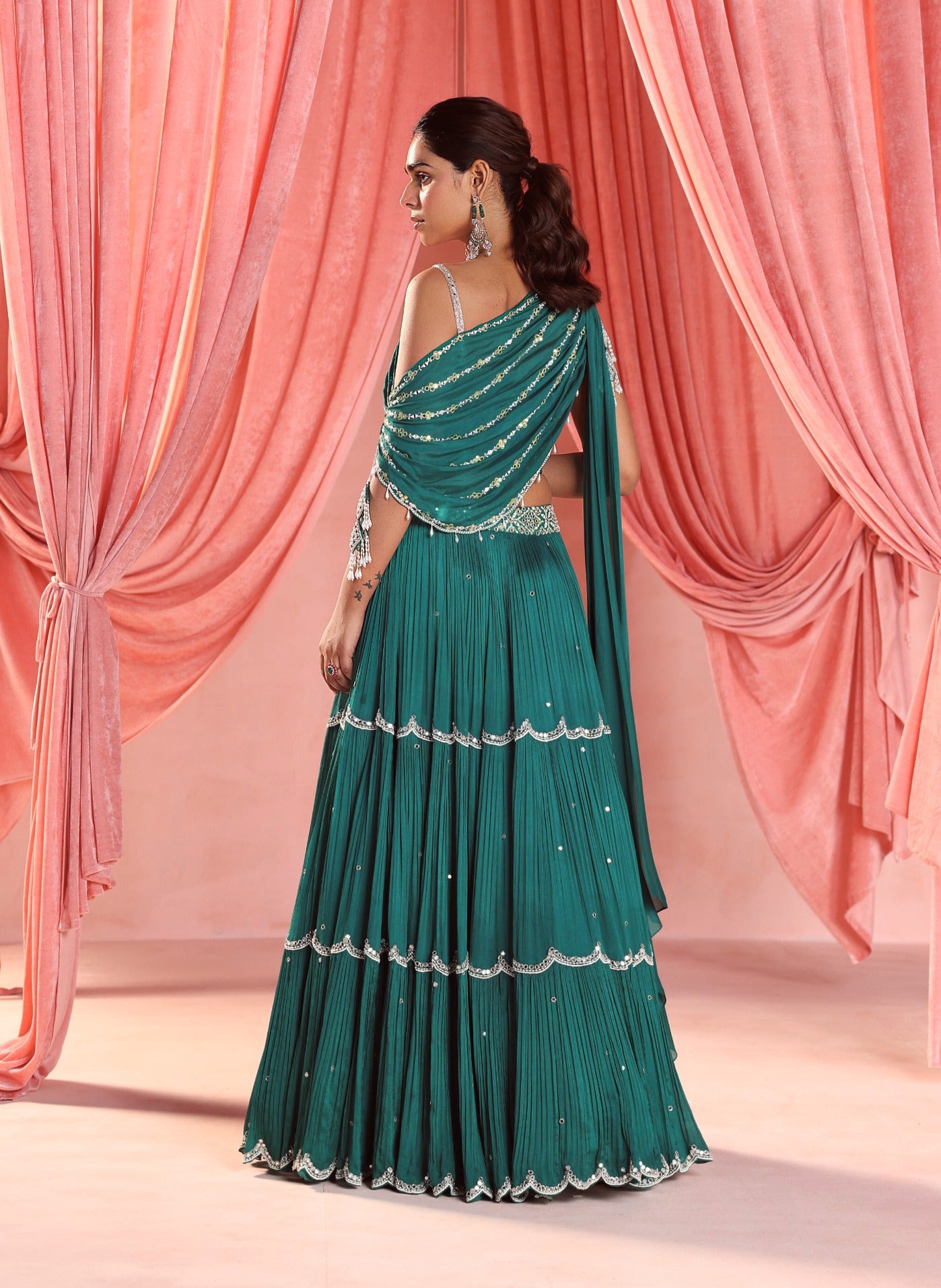 Explore refined elegance with our embellished draped choli, detailed with delicate tassels, and paired with a beautifully embellished tiered skirt. This exquisite ensemble combines intricate embellishments with a graceful, flowing design, creating a striking and sophisticated silhouette. Ideal for special occasions or formal events, it effortlessly merges classic charm with modern sophistication, ensuring you make a memorable and elegant impression.