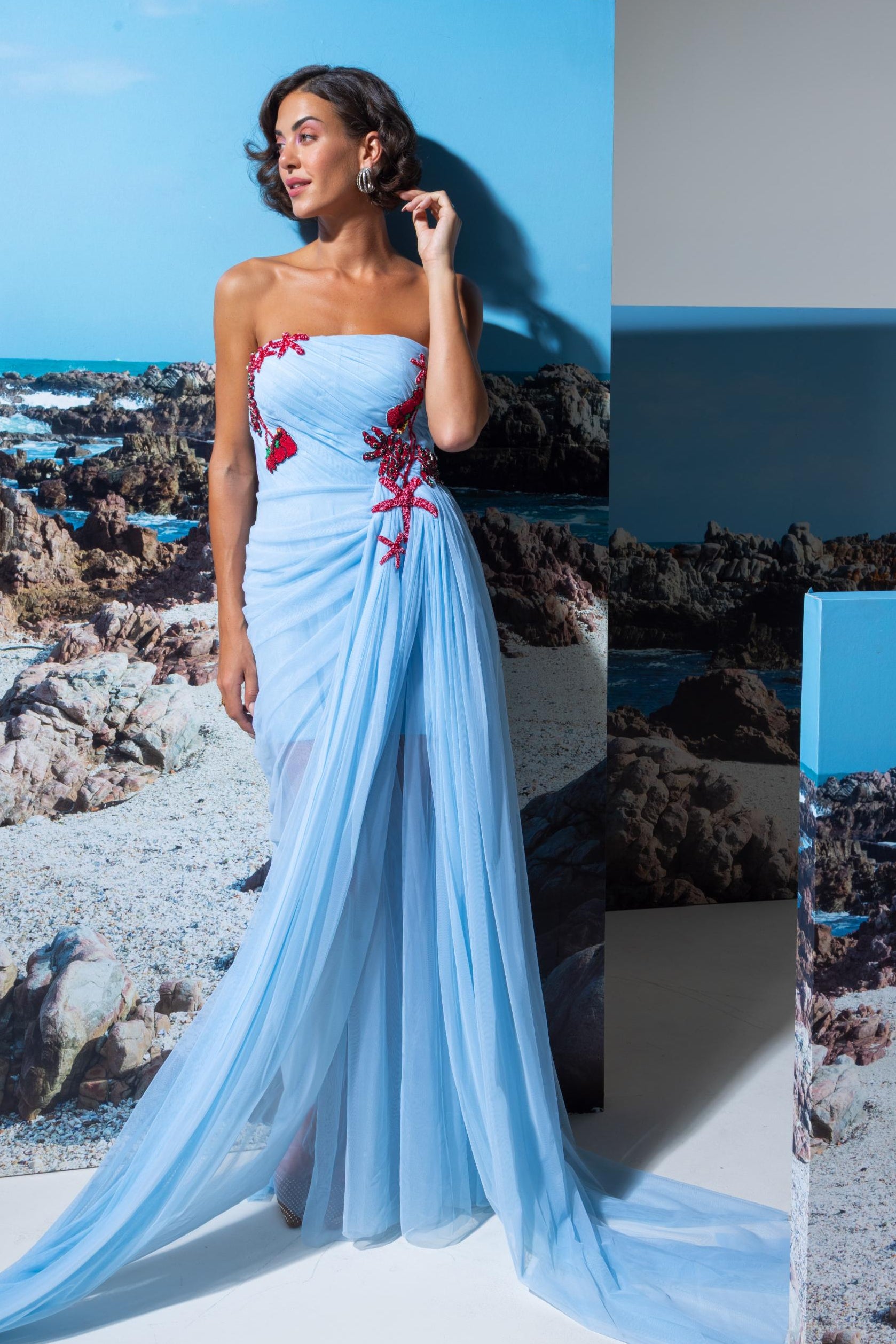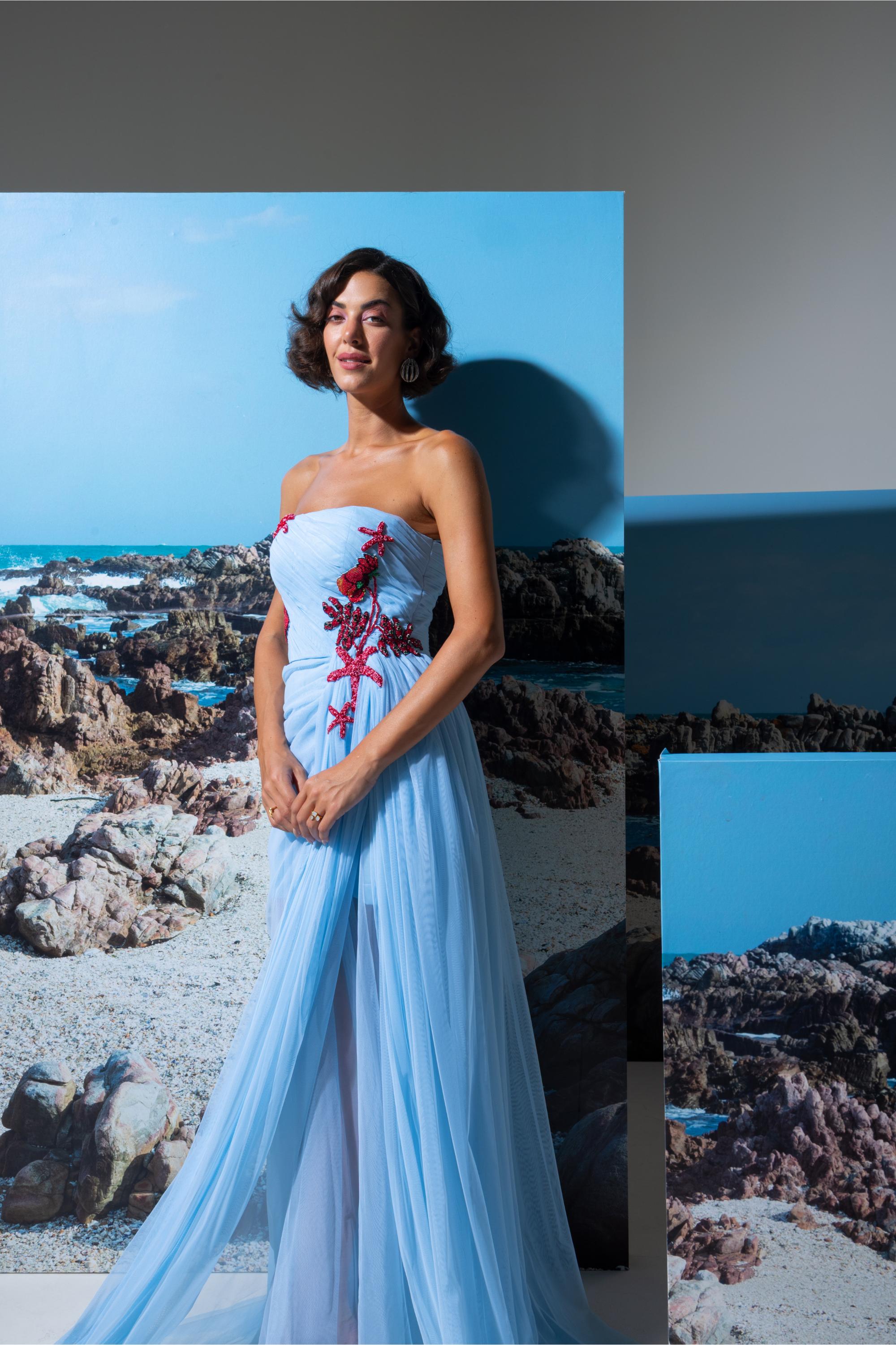 The Blue Mer-Mood tube dress with draped trail is designed for the modern woman who loves statement-making fashion. Featuring a fitted tube silhouette with an attached draped netted trail, this tube dress with draped trail combines elegance with drama. Perfect for cocktail nights, red-carpet inspired looks, or resort soirées, it brings together confidence and fluidity.