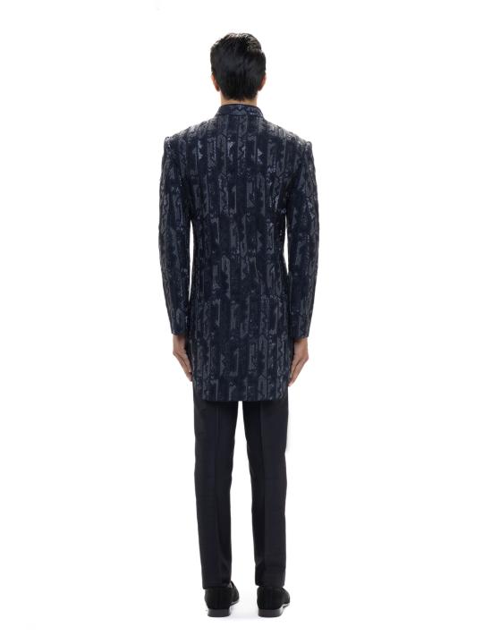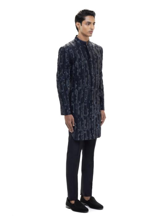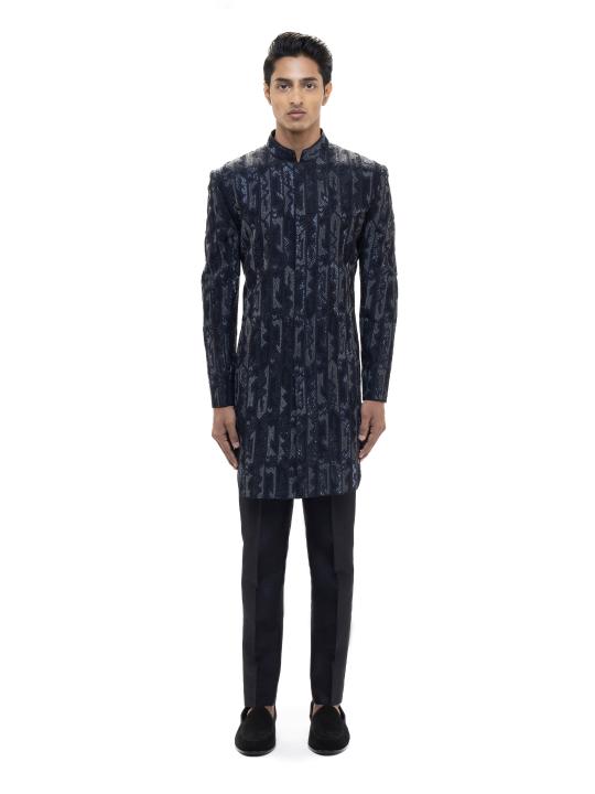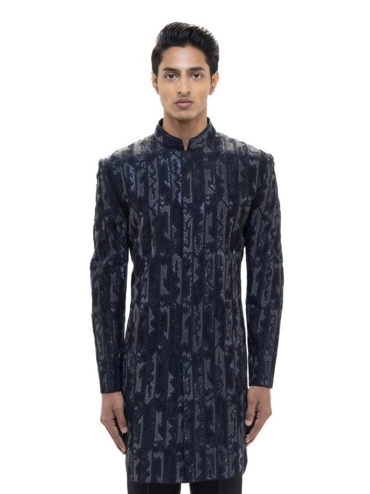 Bold and distinctive, this Navy Blue Silk Aztec Embroidered Sherwani Set features intricate Aztec-inspired embroidery that adds cultural richness and texture. Crafted from luxurious silk, it boasts a stand collar, concealed placket, and elegant Mother of Pearl buttons. The bucket cut hem and regular fit offer a modern silhouette-perfect for weddings, festive occasions, and celebrations with a statement-making style.