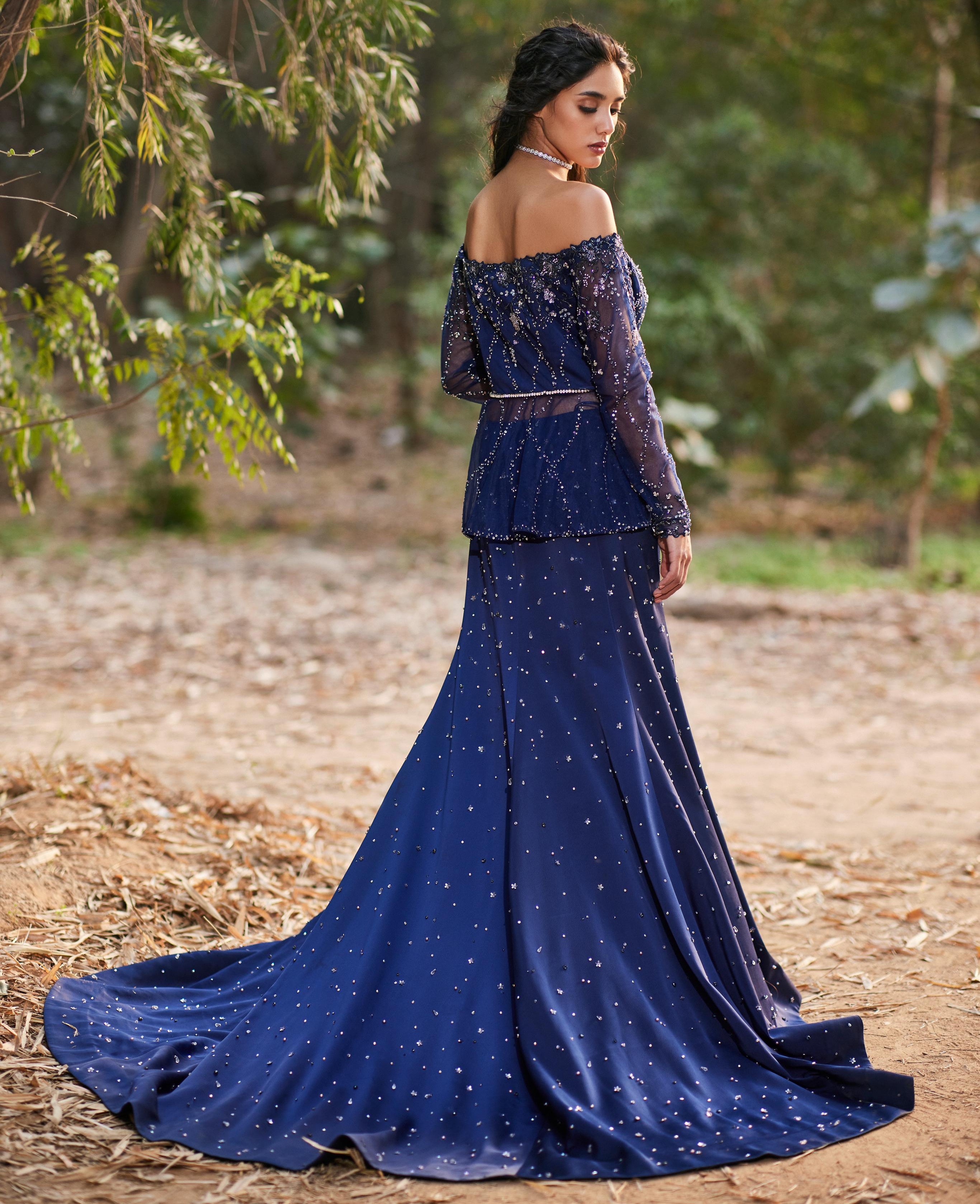 An opulent ensemble featuring a statement peplum top and a mermaid-cut skirt with a graceful trail. The blouse showcases intricate cutwork with a stunning floral and curved texture design, adding elegance and artistry to the look. Paired with a figure-flattering mermaid skirt, heavily embellished with scattered crystals and sequins, this set is perfect for glamorous occasions like cocktails, sangeets, or receptions, exuding sophistication and sparkle in every detail.