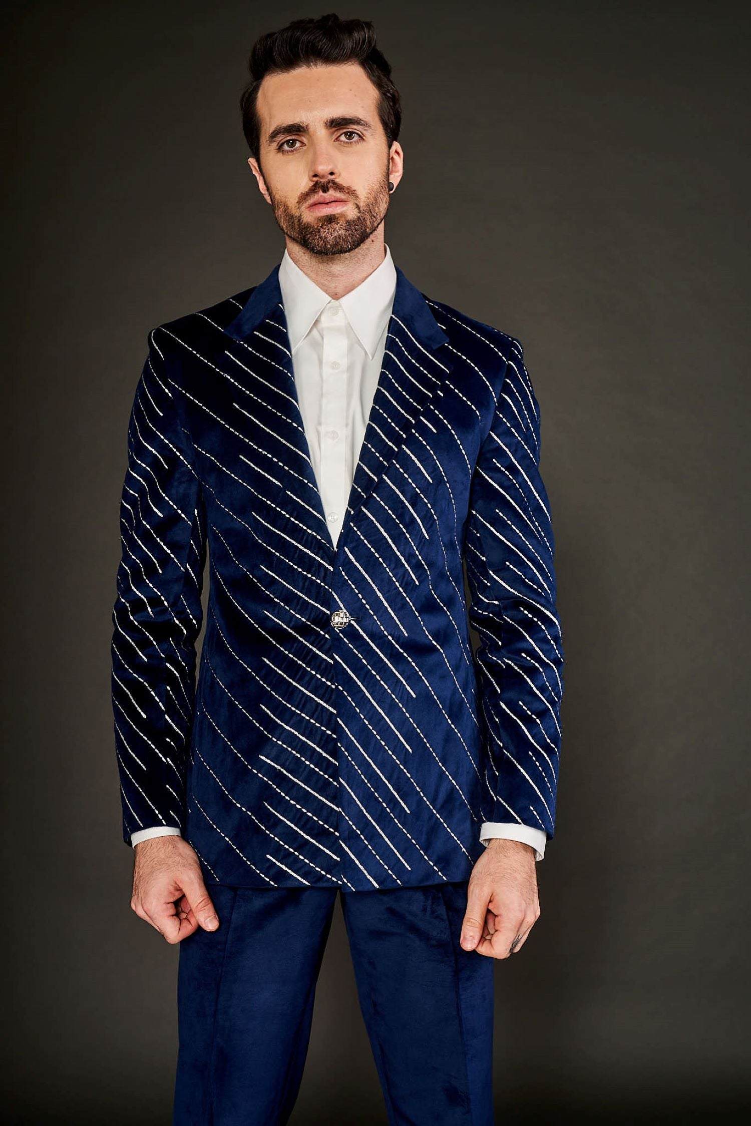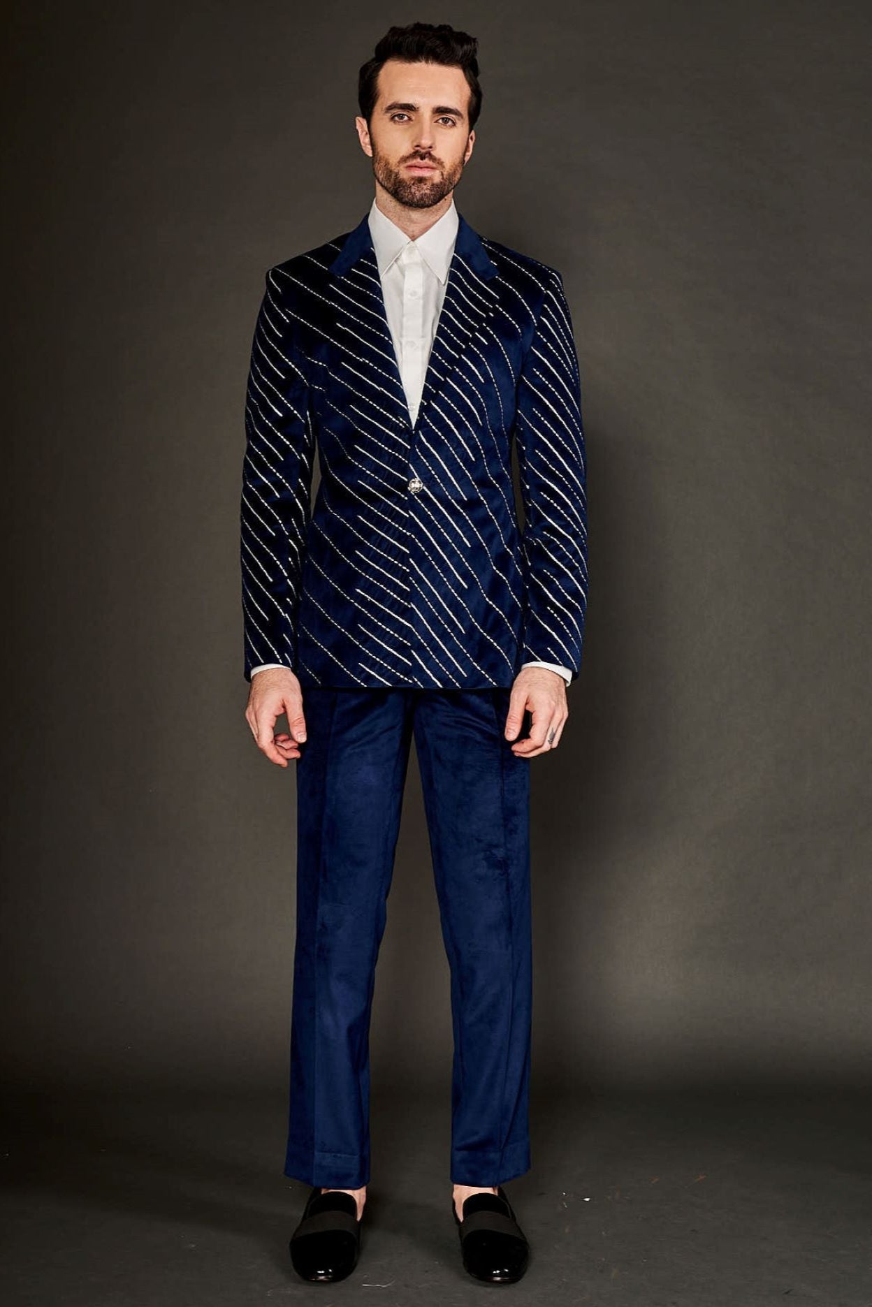 Navy blue diagonal silver resham running chain stitch embroidered suit