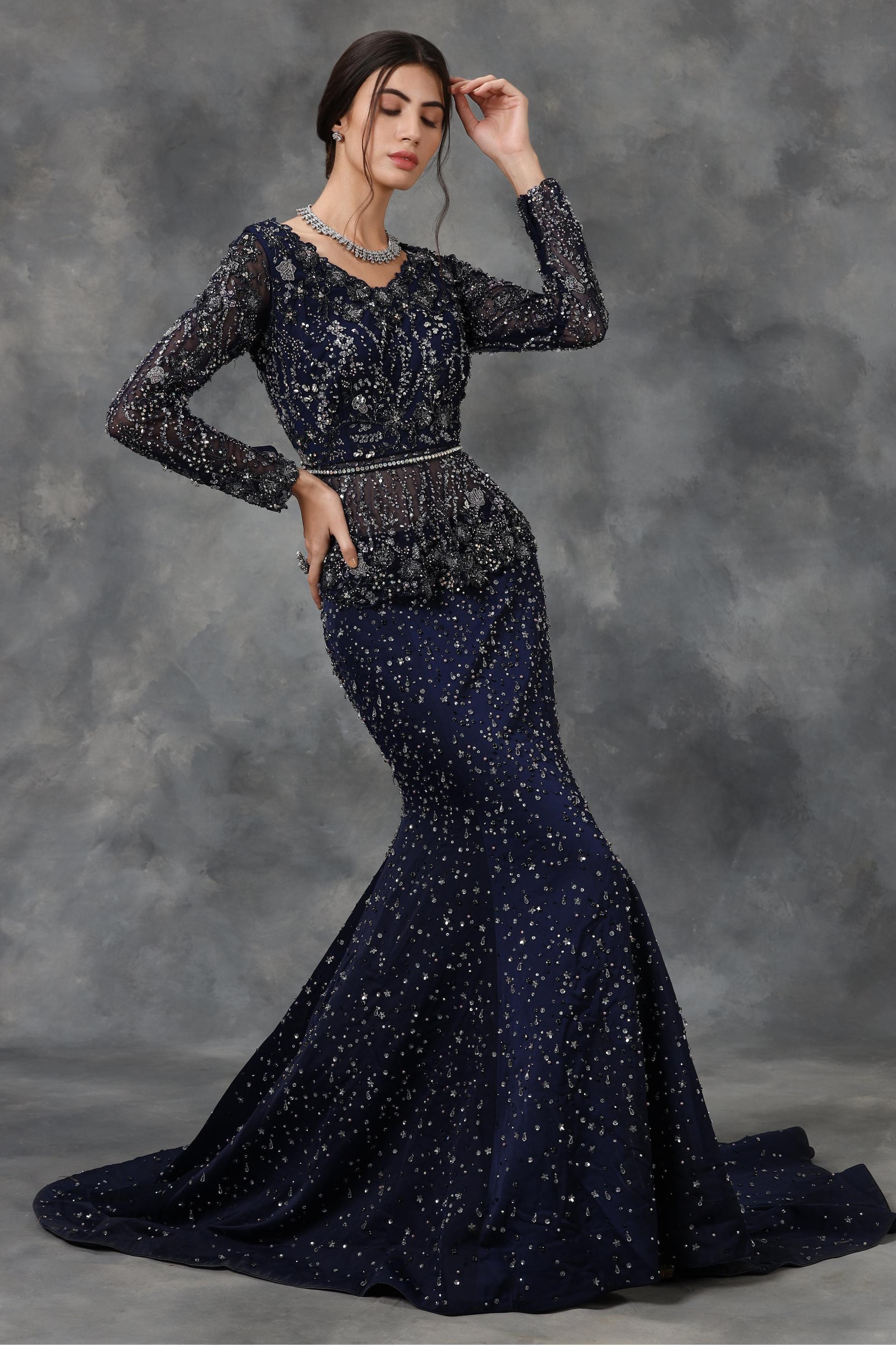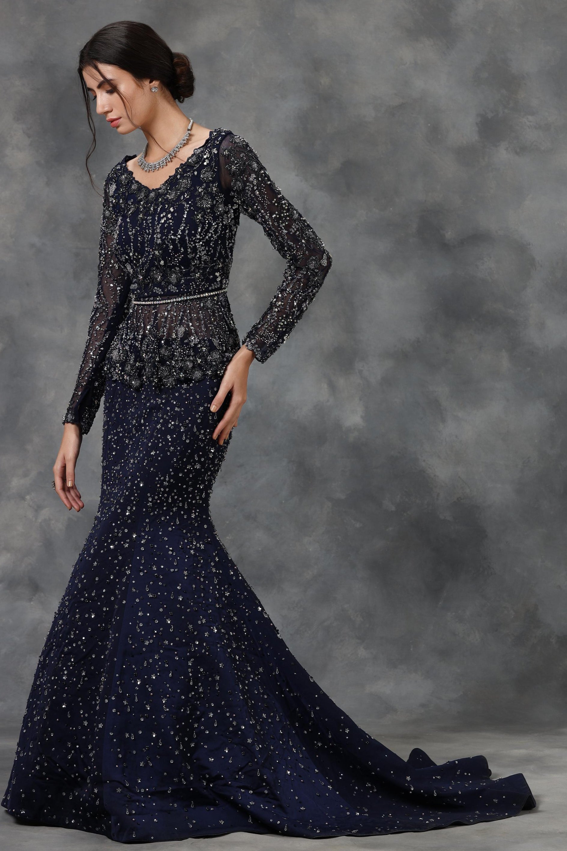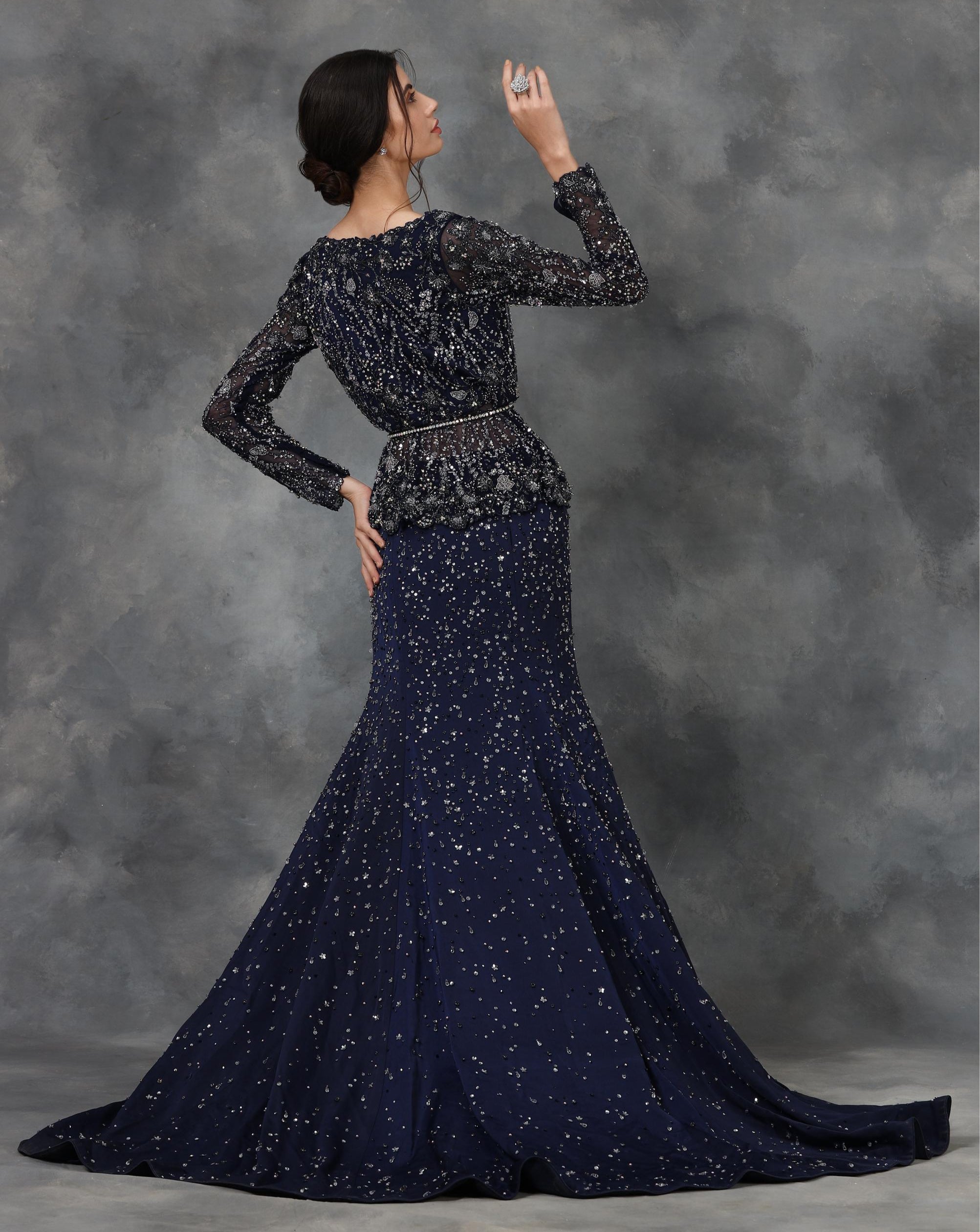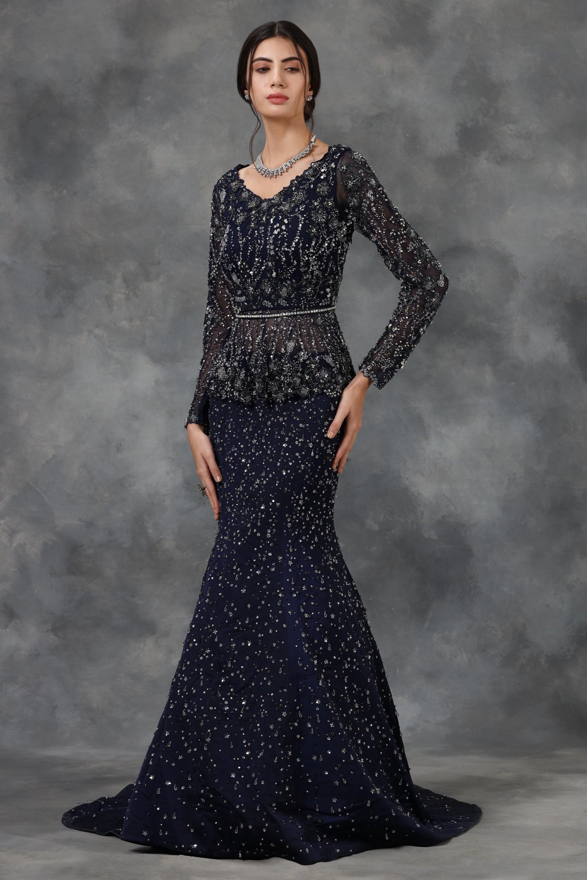 Navy blue embellished peplum top and mermaid skirt