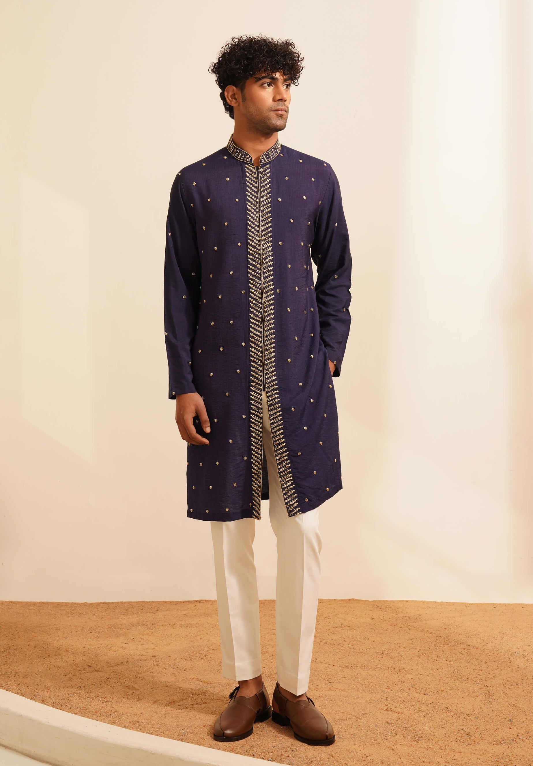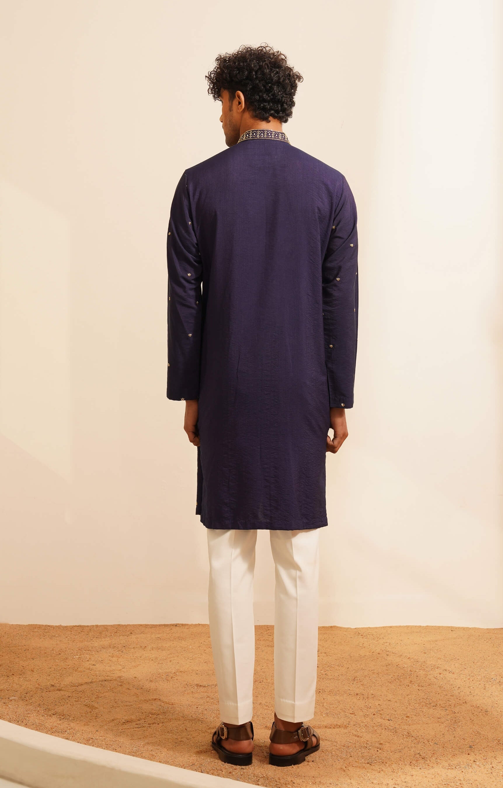 Step into sophistication with our navy blue button-down kurta, featuring a sleek mandarin collar and a discreet hidden placket for a refined finish. This elegant piece is enhanced with intricate hand-embroidered details along the neckline, placket, and throughout the garment, showcasing exceptional craftsmanship. Ideal for both formal events and everyday wear, this kurta seamlessly blends classic design with contemporary style. Elevate your wardrobe with this beautifully detailed and versatile piece.