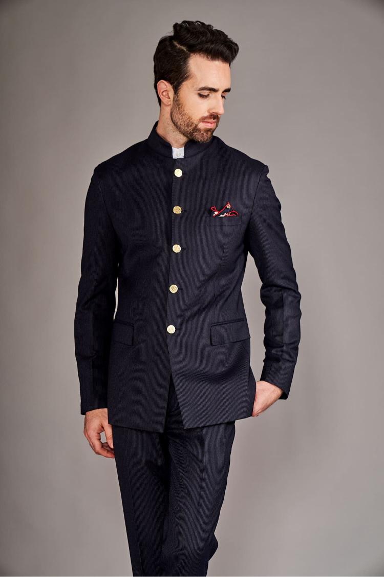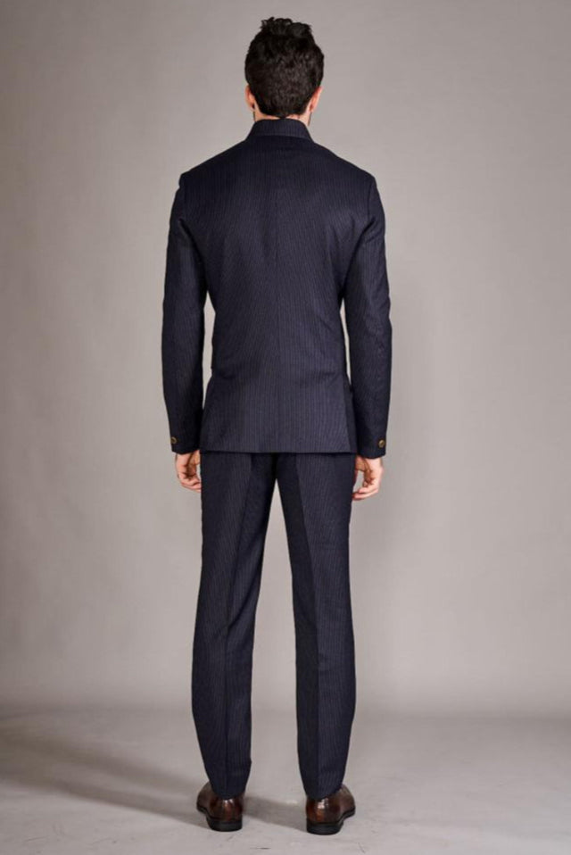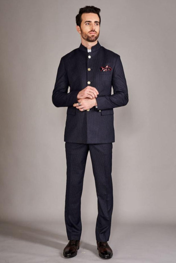 Make a statement with this Navy Blue Pinstripe Bandhgala Suit. Featuring a sleek pinstripe pattern, this suit combines the classic Bandhgala design with modern sophistication. The sharp tailoring enhances the slim, flattering fit, while the navy blue color exudes refined elegance. Perfect for formal events, weddings, or receptions, this suit offers a stylish blend of tradition and contemporary flair.