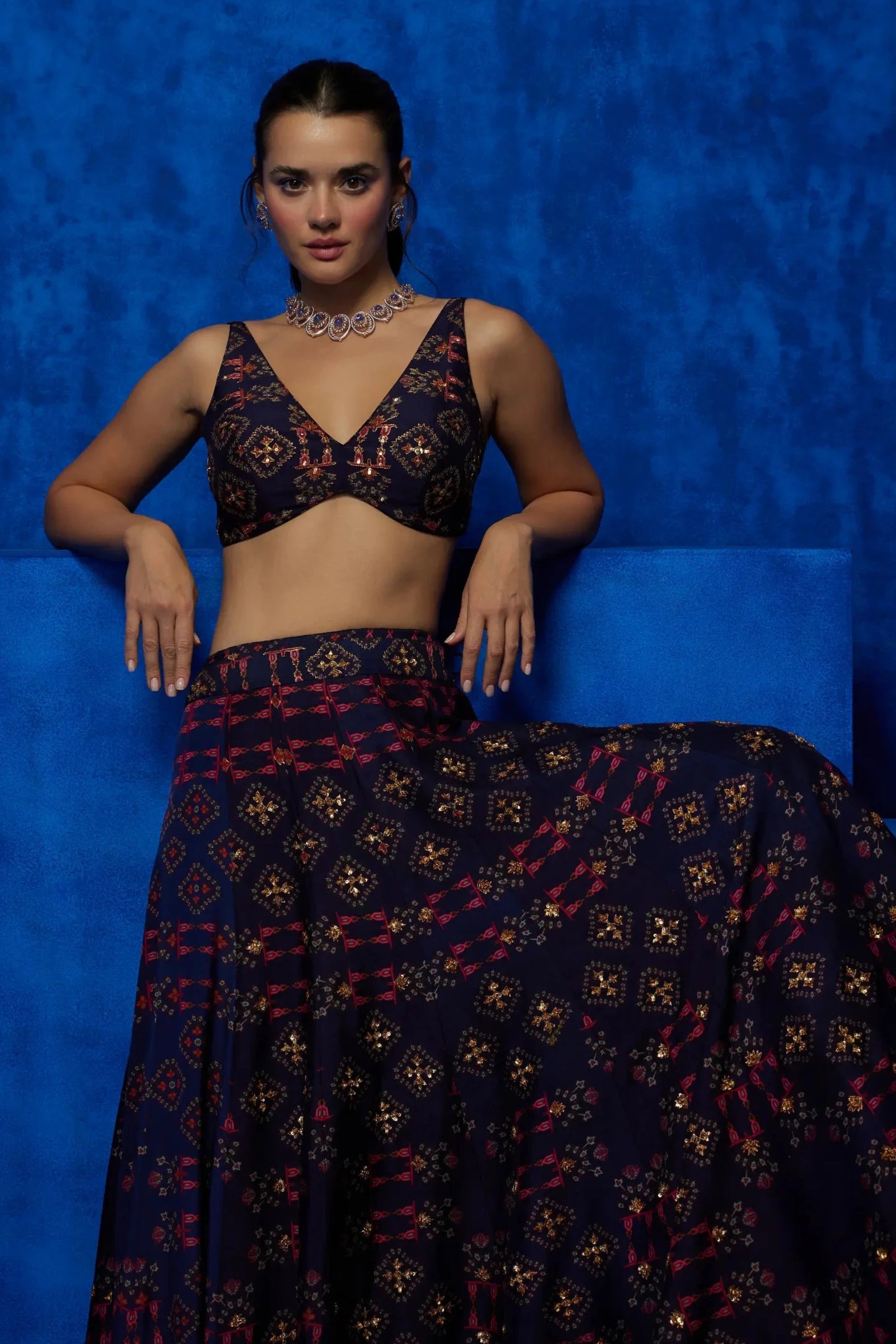 Shine bright at your next celebration with this navy blue starry print lehenga set. The deep navy hue, adorned with a mesmerizing starry print, creates a celestial-inspired look that is both elegant and enchanting. The lehenga, paired with a matching blouse and dupatta, offers a flattering silhouette, perfect for weddings, receptions, or festive occasions. This set blends traditional beauty with a touch of modern glamour, making it a standout choice for any special event.