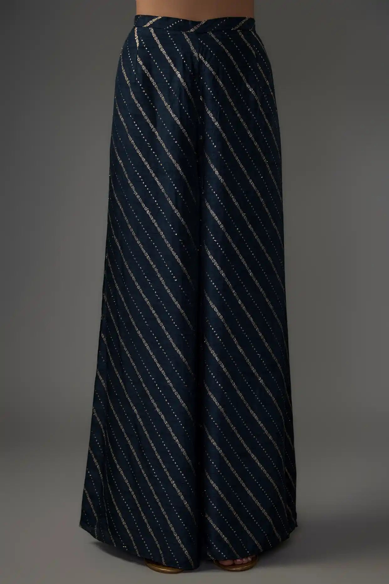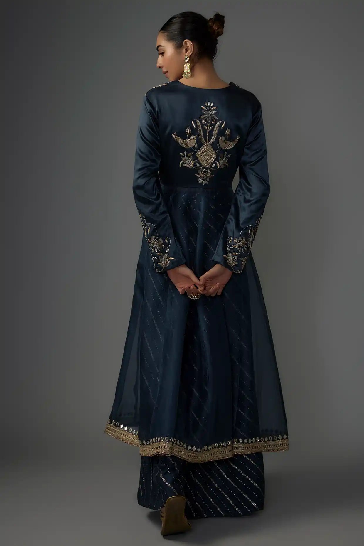 Step into sophistication with this stunning navy satin and organza embroidered anarkali, perfectly paired with a gold stripe dola silk palazzo and an intricately embroidered organza dupatta. The rich navy hue is complemented by exquisite embroidery, creating a striking contrast that exudes elegance. The flowing silhouette of the anarkali paired with the palazzo offers both comfort and style, while the dupatta adds an ethereal touch. Ideal for festive occasions and celebrations, this ensemble beautifully blends traditional charm with contemporary flair, ensuring you make a memorable impression.