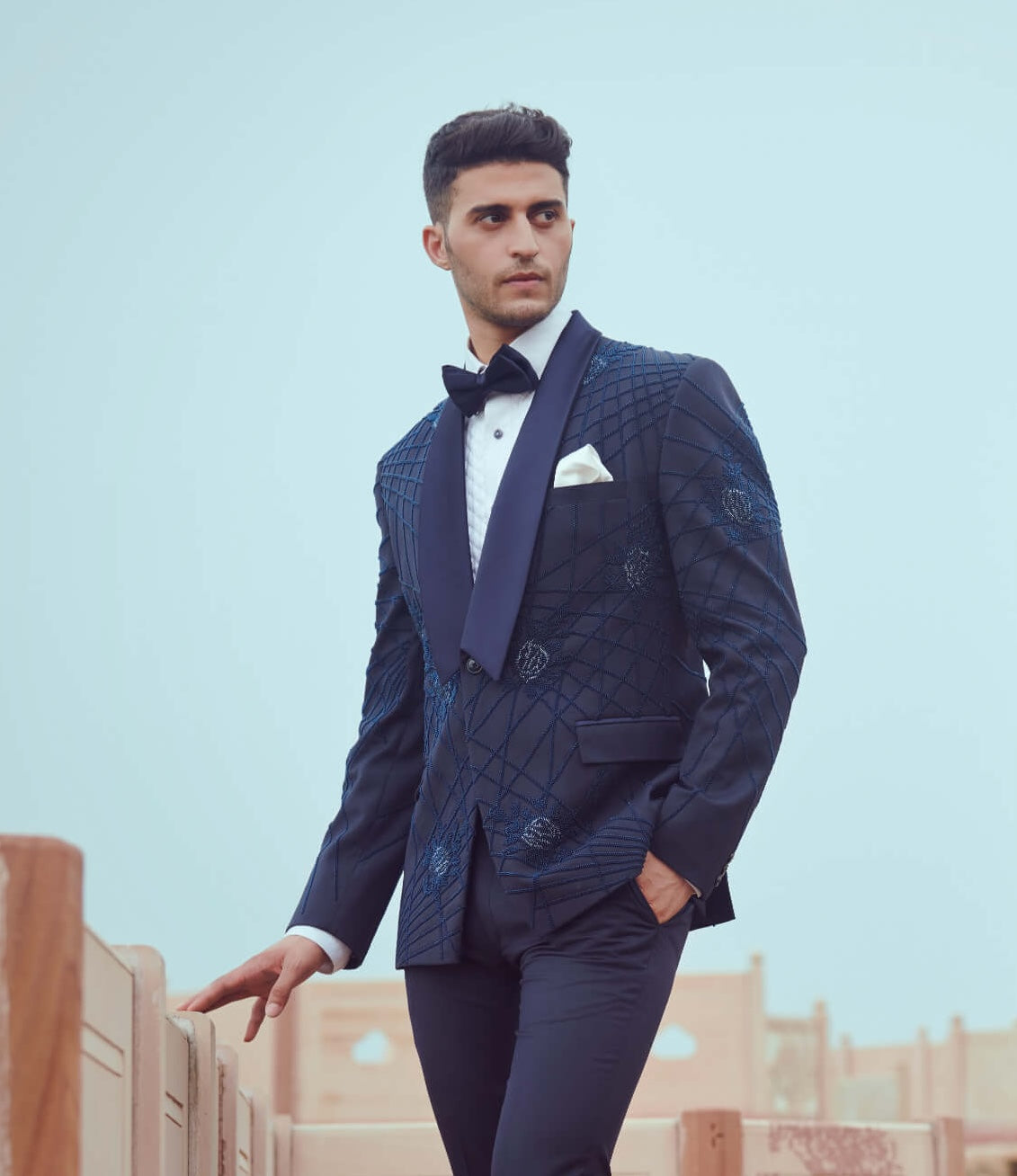Elevate your formal look with this navy tuxedo, featuring exquisite tone-on-tone all-over embroidery. Crafted from luxurious suiting fabric, the tuxedo is complemented by a classic bow tie, adding a touch of timeless sophistication. The intricate embroidery and sleek design create a refined and distinguished appearance, perfect for any elegant occasion.