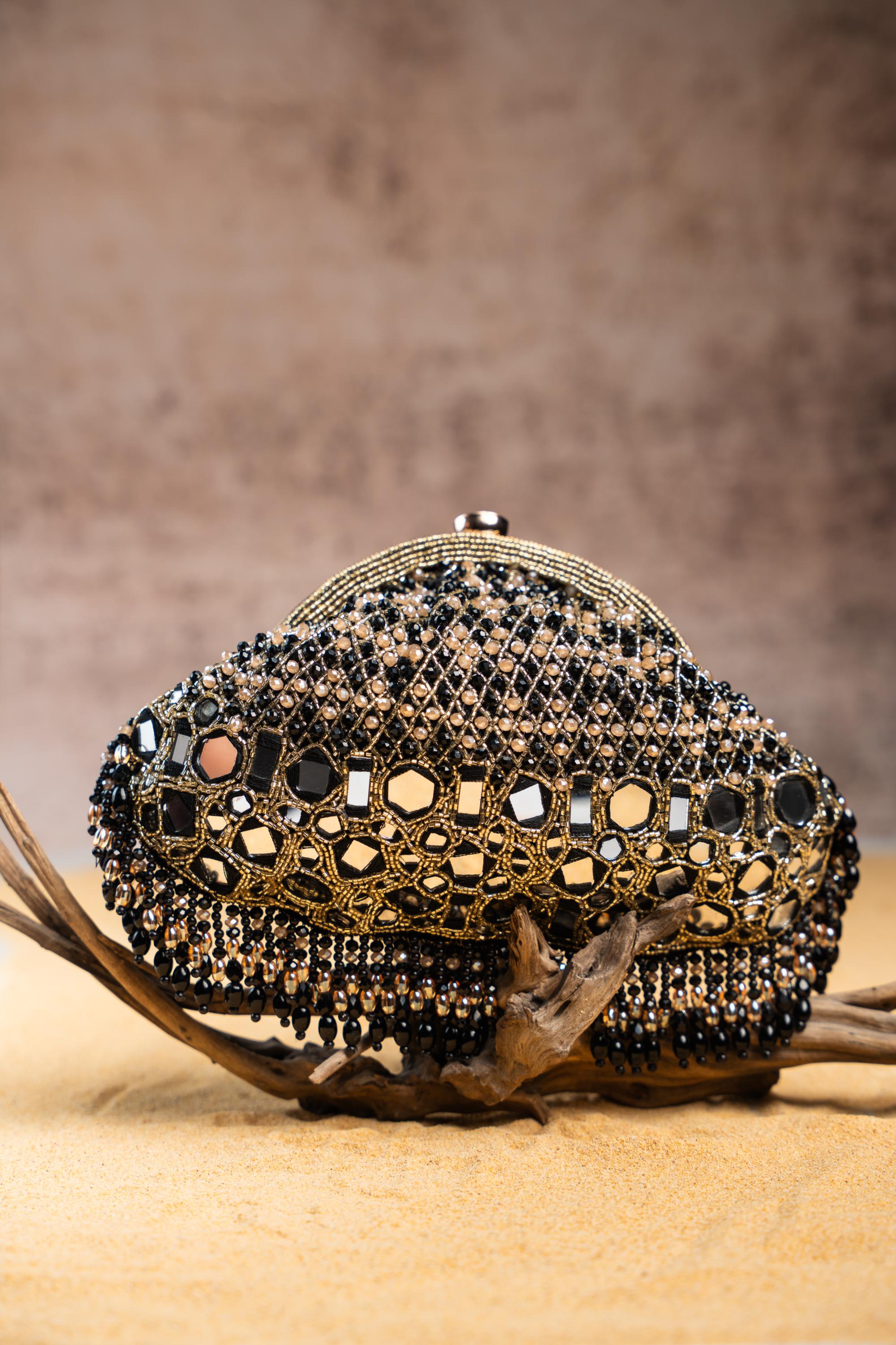 The Black Aynali evening clutch bag is tailored for cocktail nights and contemporary celebrations. Its sleek silhouette makes it the perfect companion for modern sarees and gowns. This evening clutch bag introduces bold elegance through intricate aynali embellishments set against a deep black base. Ideal for receptions and formal gatherings, the evening clutch bag elevates minimal outfits with refined sparkle. Carry it when you want timeless sophistication with a confident edge.