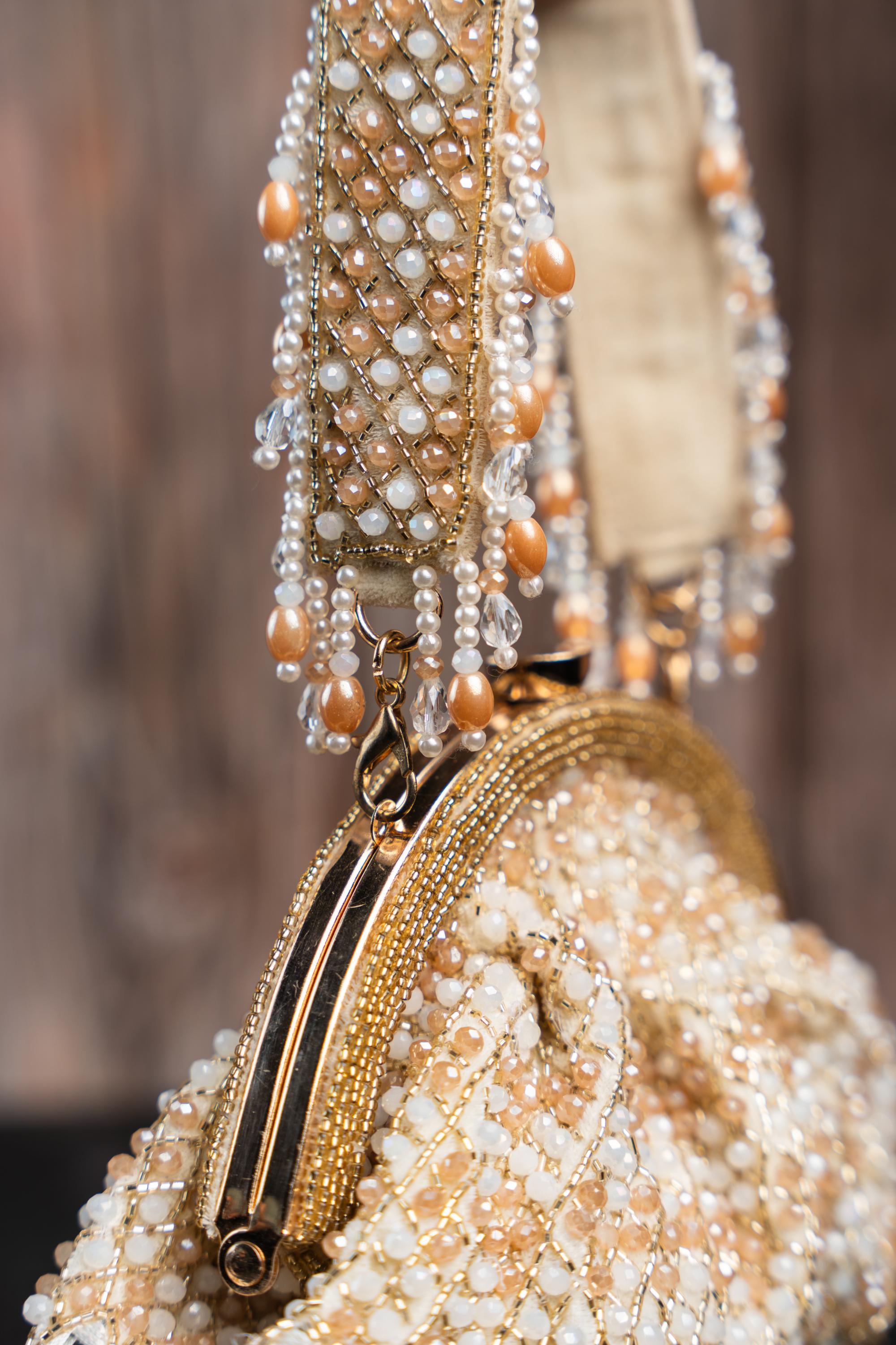 The Gold Ecru Aynali bridal clutch bag is designed for brides who appreciate subtle luxury. Its soft ecru base accented with gold detailing complements ivory lehengas and pastel ensembles beautifully. This bridal clutch bag balances modern structure with traditional artistry. Perfect for wedding ceremonies and receptions, the bridal clutch bag offers both elegance and practicality. Carry it to complete a refined bridal or festive look.