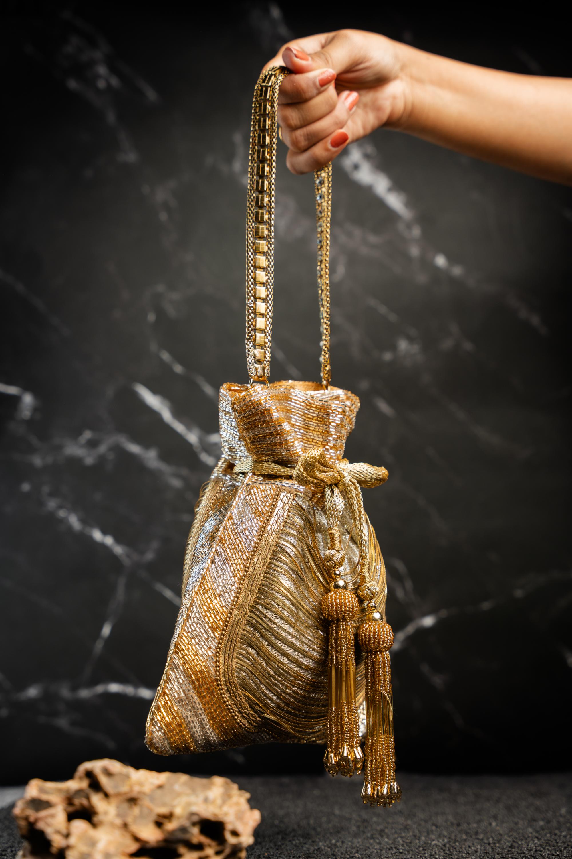 The Gold hinted embroidered potli bag is curated for traditional Indian wedding rituals and festive ceremonies. Featuring intricate embroidery and a classic potli silhouette, it pairs effortlessly with lehengas, sarees, and anarkalis. This potli bag adds heritage charm to wedding looks.
