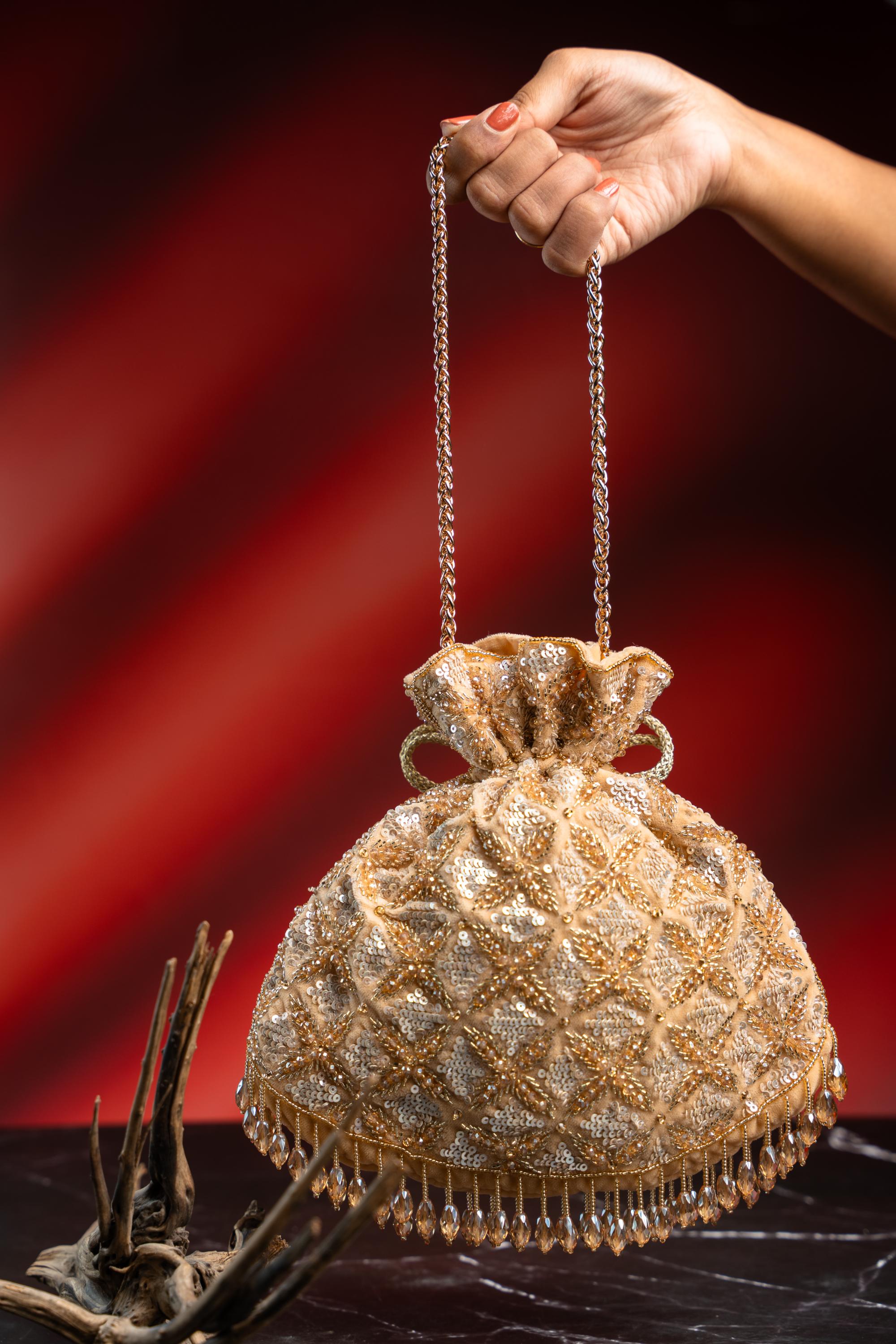 The gold leafy lattice handbag by Nayaab By Sonia is crafted to enhance wedding and festive styling. Designed with a detailed lattice structure, the gold leafy lattice handbag showcases artistic metalwork inspired by nature. Ideal for Indian wedding functions, the gold leafy lattice handbag offers both style and functionality. The structured form ensures the gold leafy lattice handbag remains elegant while carrying essentials. Whether styled with lehengas or sarees, the gold leafy lattice handbag adds a touch of luxury. This gold leafy lattice handbag is a timeless accessory for celebratory occasions.