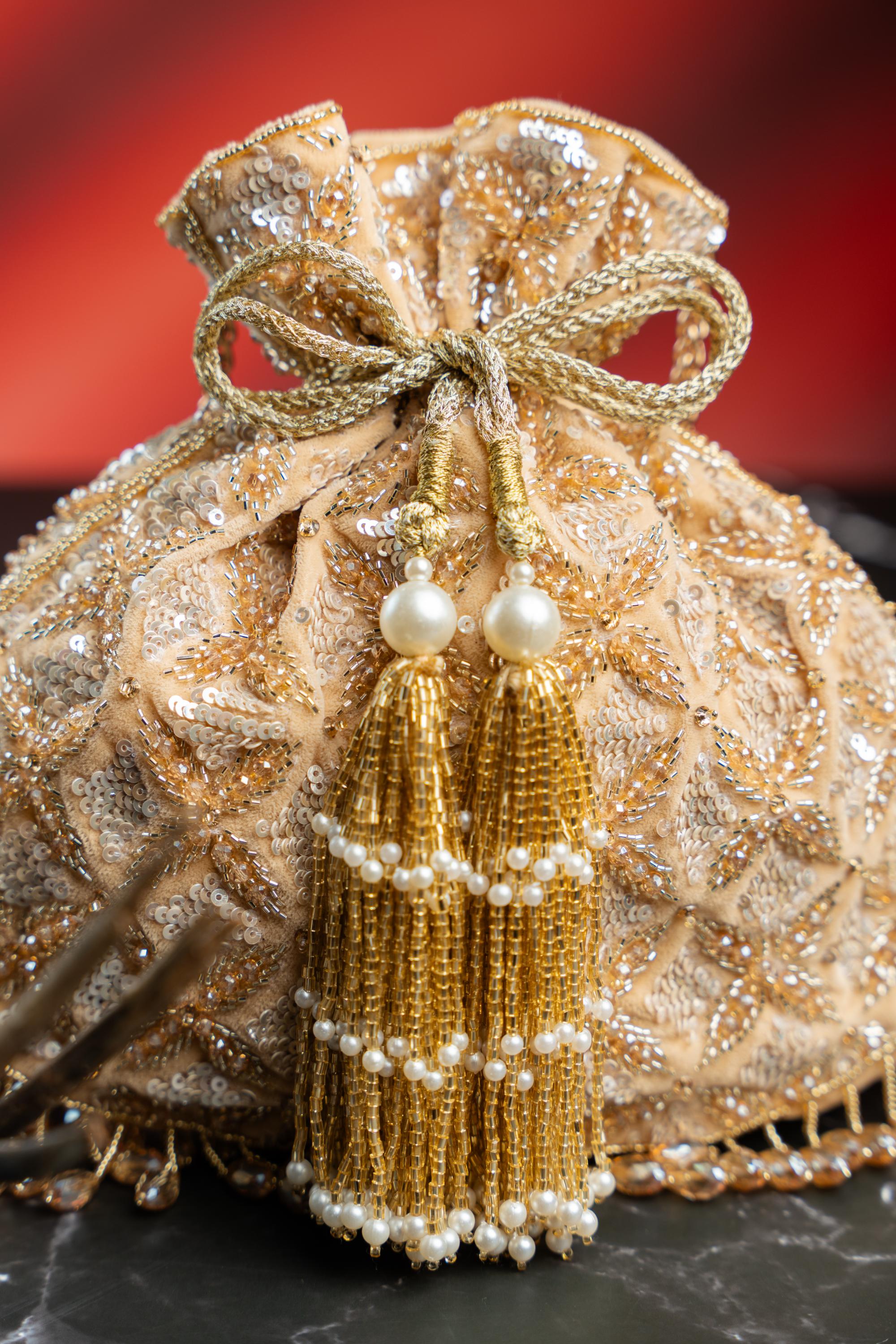 The gold leafy lattice handbag by Nayaab By Sonia is a refined accessory designed to elevate festive and wedding looks. Featuring an intricate leafy lattice pattern, this handbag blends sculptural detailing with elegant craftsmanship. The gold finish adds ceremonial charm, making it ideal for weddings, receptions, and festive evenings. Curated for those who appreciate statement accessories, this handbag pairs effortlessly with traditional ensembles while also complementing contemporary silhouettes.