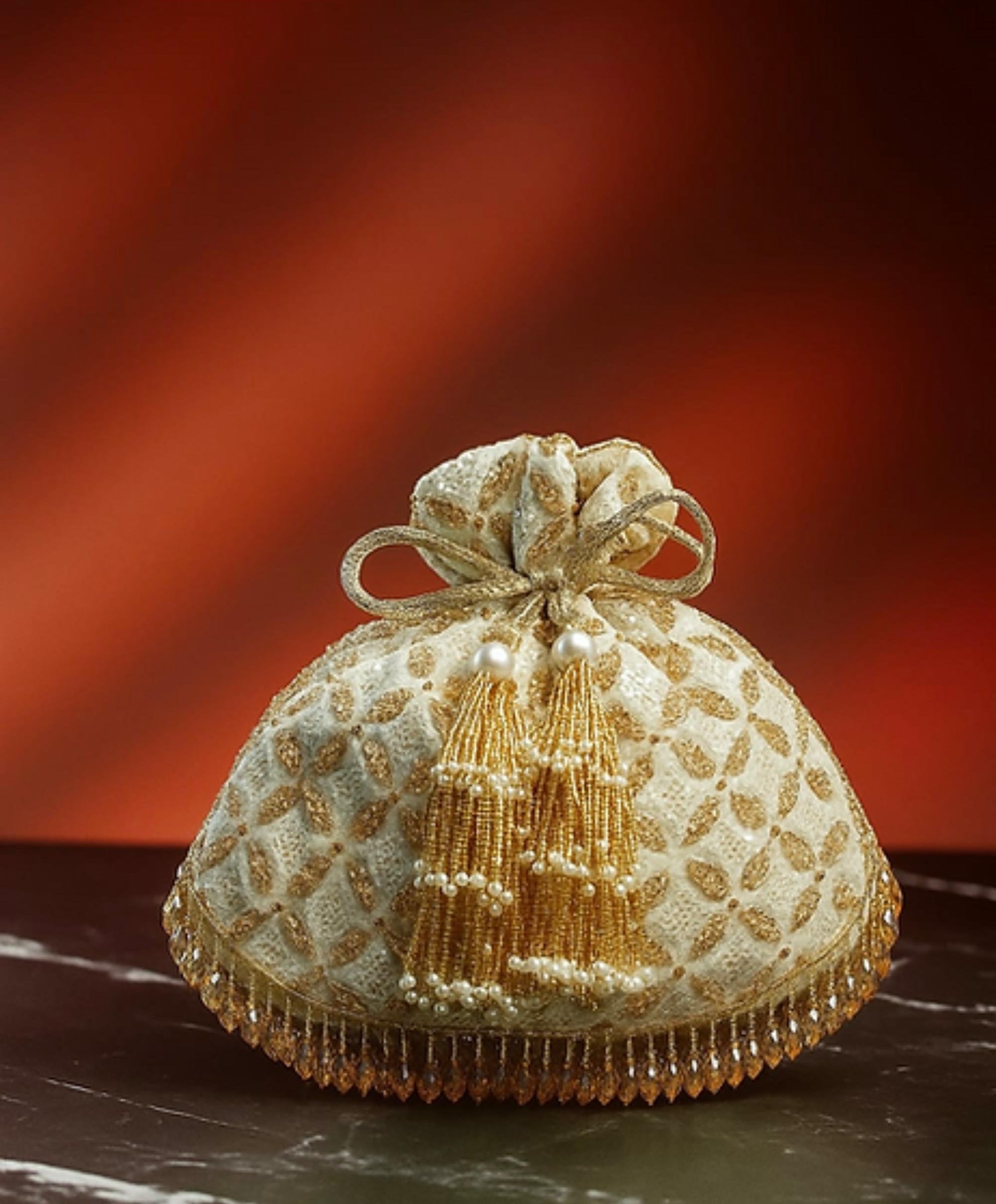 The ivory leafy lattice handbag by Nayaab By Sonia reflects understated elegance through intricate lattice craftsmanship. Designed for refined festive dressing, this handbag pairs beautifully with soft-toned lehengas and sarees. The ivory finish offers versatility, making it suitable for daytime weddings and elegant celebrations.