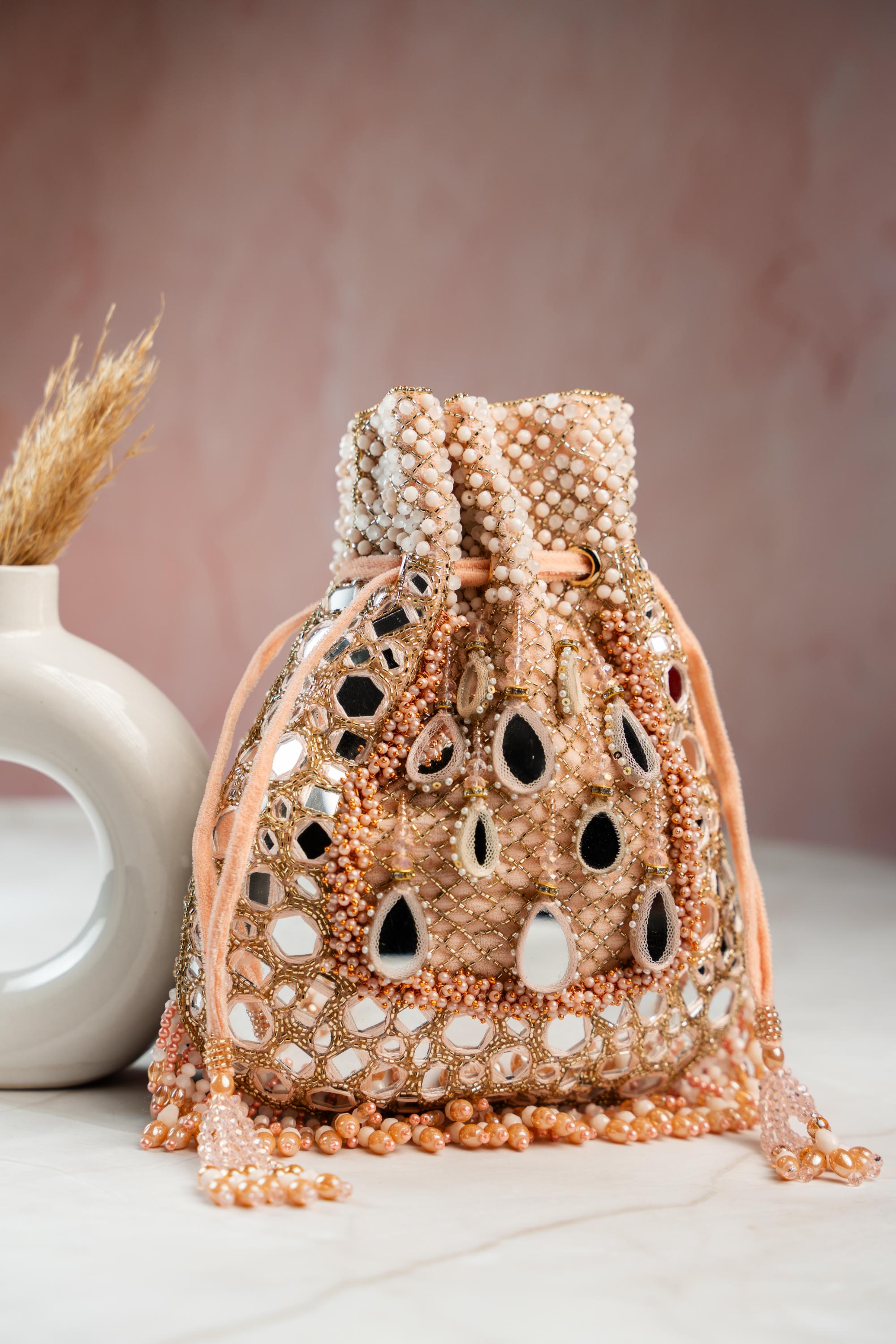 The Pink Aaina Jaal Jhaalar Blush Potli Bag is a festive accessory crafted with intricate mirror jaal detailing and elegant tassel accents. Designed for wedding functions, this potli bag enhances pastel and vibrant ensembles alike. The blush hue highlights the craftsmanship of this potli bag, making it a refined addition to lehengas and sarees. Its drawstring silhouette keeps essentials secure while maintaining the charm of a traditional potli bag. Lightweight and statement-worthy, this potli bag reflects light beautifully during evening celebrations. Styled with coordinated jewellery, this potli bag elevates sangeet and reception outfits effortlessly. For those seeking a handcrafted and elegant potli bag, this design offers festive sophistication with playful detailing.