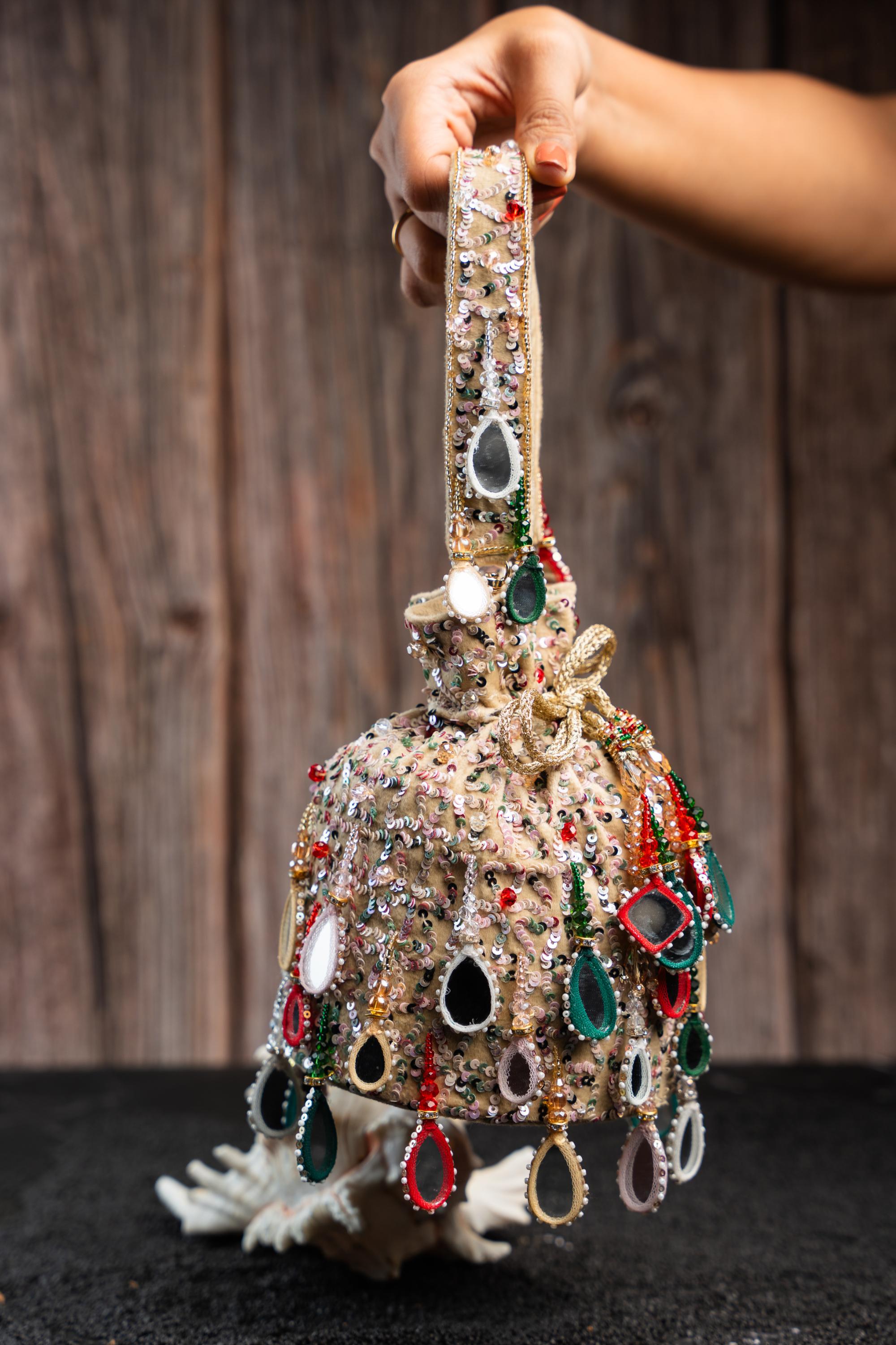 The White Aaina Bucket Rangeela Embroidered Potli Bag blends mirror artistry with vibrant embellishment over an elegant white base. Designed for weddings and festive occasions, this embroidered potli bag enhances traditional ensembles with colour and shimmer. The structured bucket silhouette gives this embroidered potli bag modern definition while preserving classic charm. Lightweight and functional, this embroidered potli bag holds essentials while elevating your look. The intricate detailing ensures this embroidered potli bag reflects light beautifully during celebrations. Styled with bold lehengas or pastel sarees, this embroidered potli bag becomes a festive statement piece. For those seeking a distinctive embroidered potli bag, this design offers joyful craftsmanship with timeless appeal.