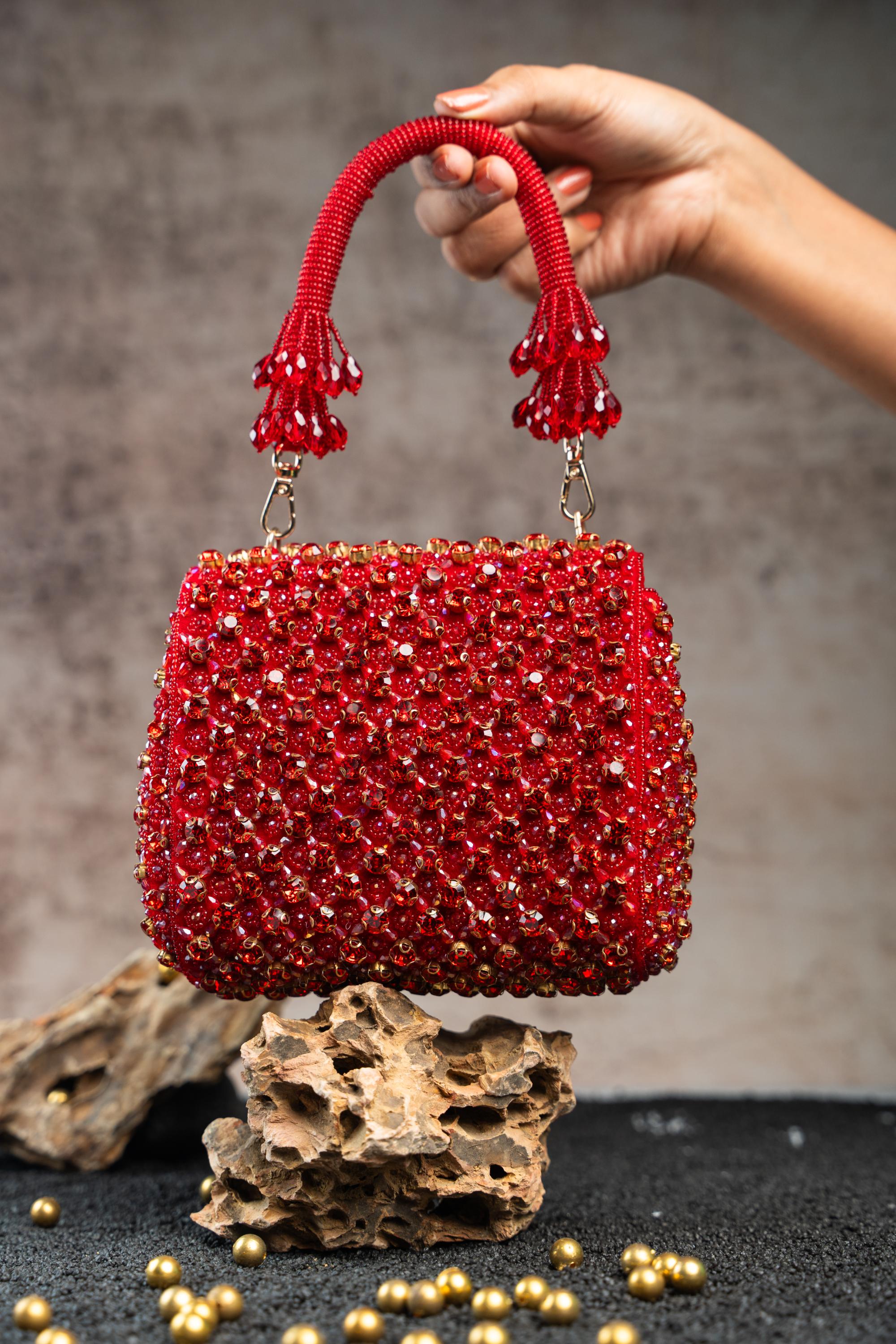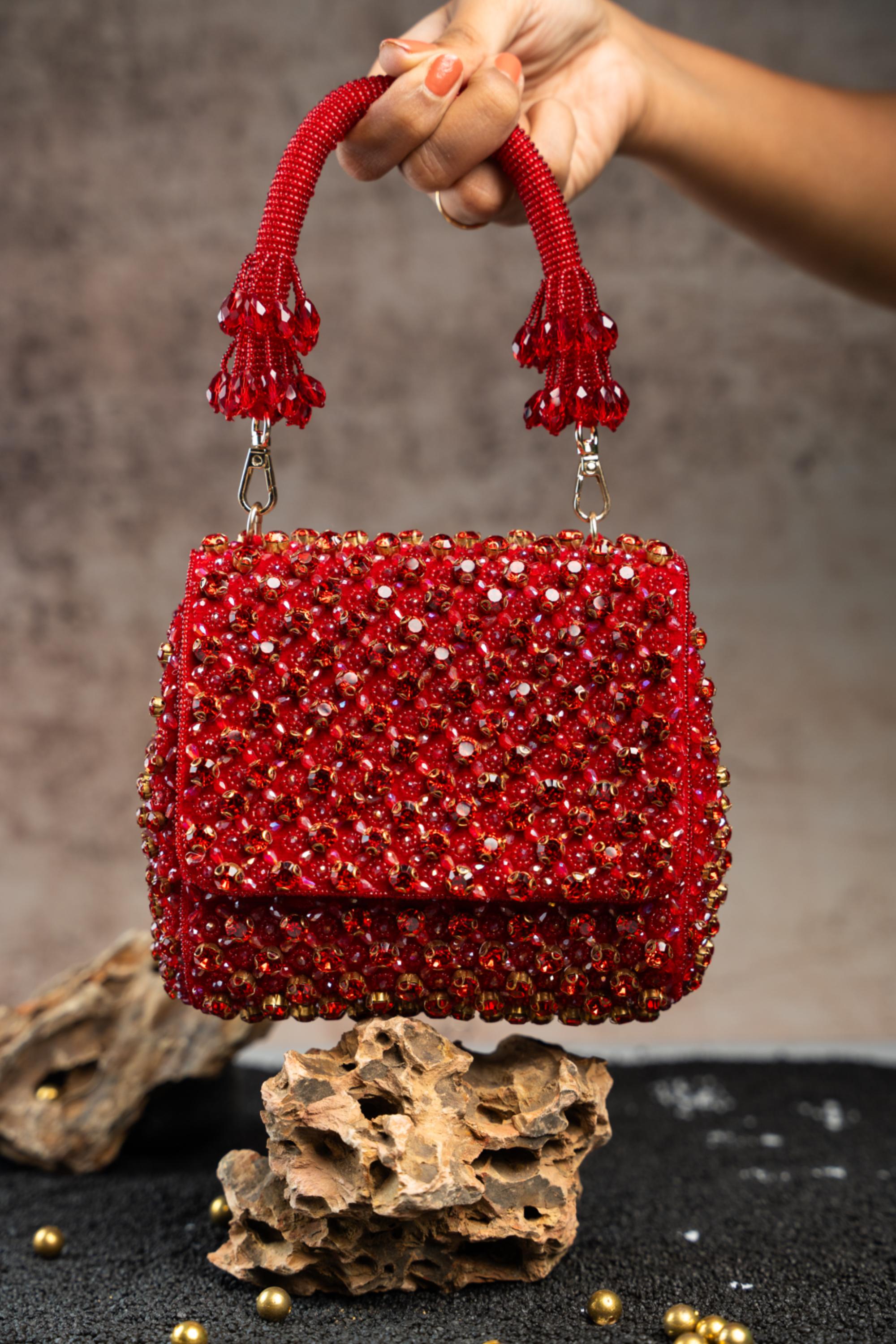 The Wine aurora shimmering designer wedding handbag is curated for evening Indian weddings and glamorous festive celebrations. Its rich wine hue combined with a luminous shimmer makes it an ideal accessory for cocktail nights, receptions, and night-time wedding functions. Designed to elevate embellished ensembles, this handbag adds depth, drama, and refined elegance to wedding looks while remaining effortlessly stylish.