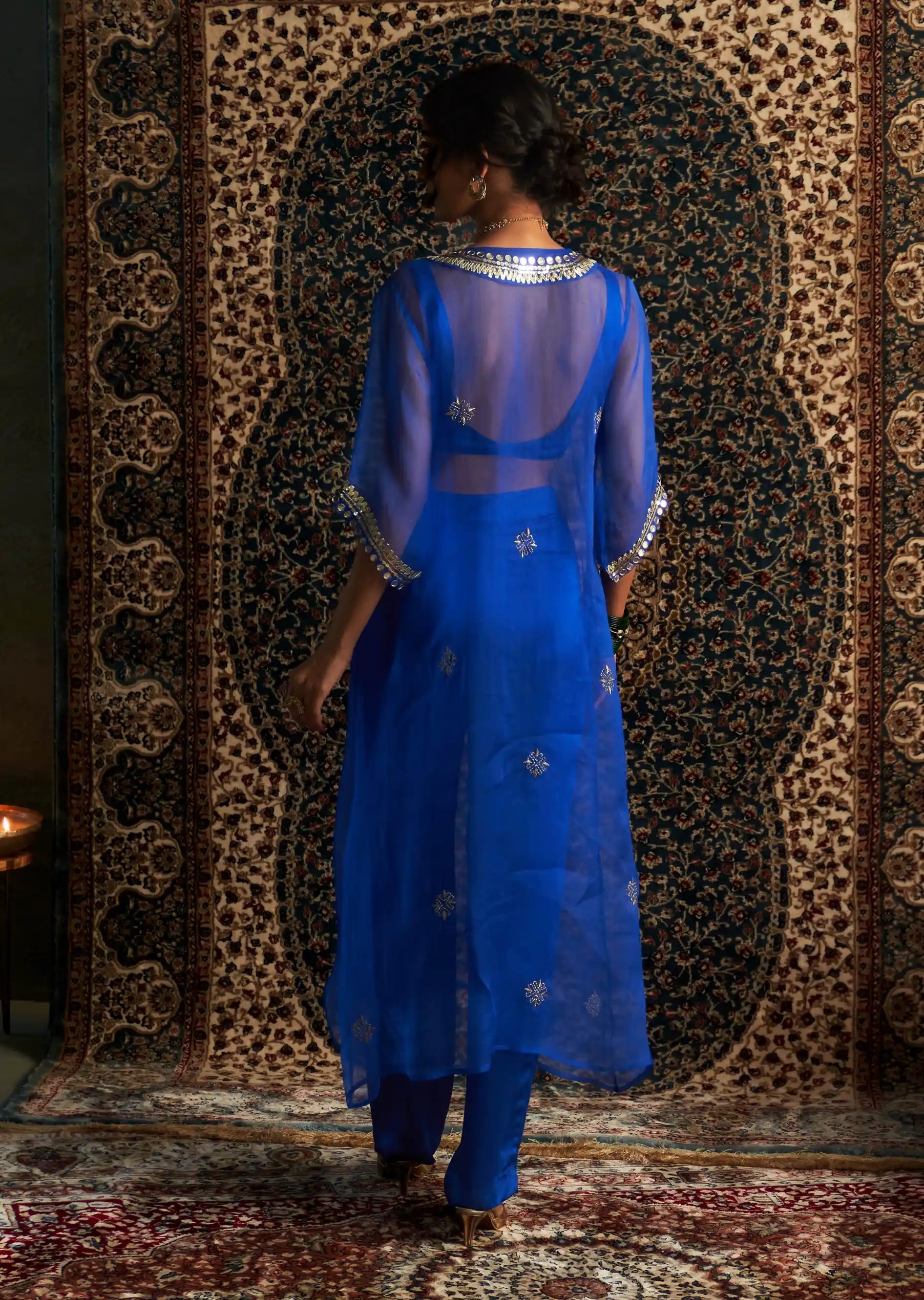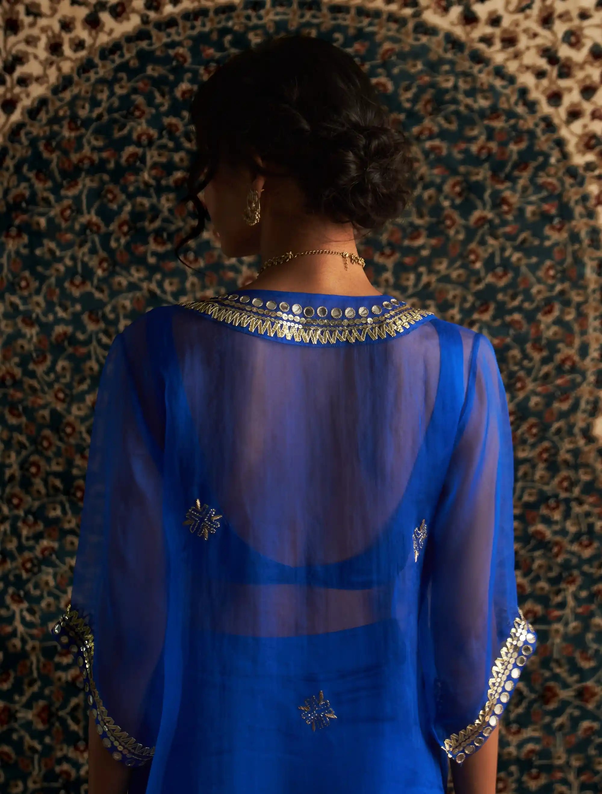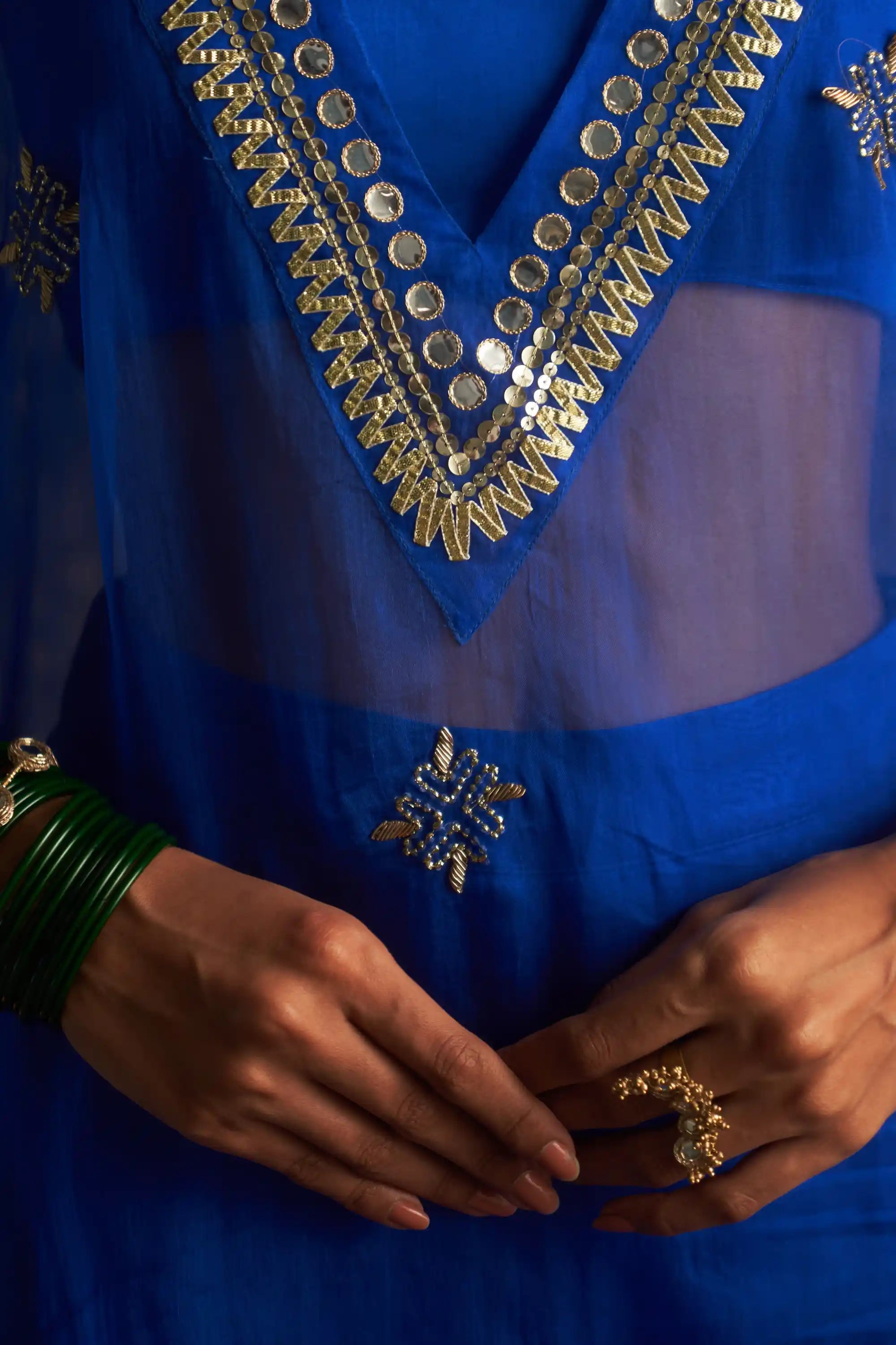 This stunning blue long kurta is a true showstopper for any occasion, radiating effortless elegance and refined sophistication. Crafted from luxurious organza, the sheer overlay features exquisite hand-embroidered dabka and zari motifs that create a mesmerizing visual effect. Intricate gota and sequin detailing adorn the neckline and sleeves, adding a touch of opulence to the design.
