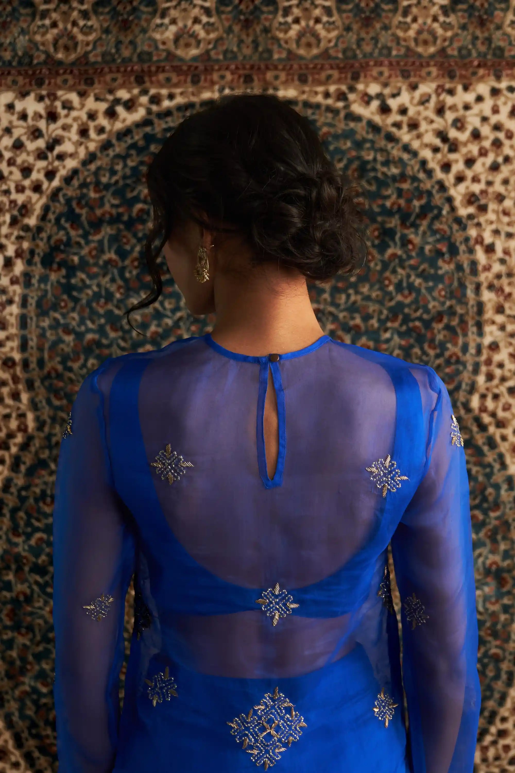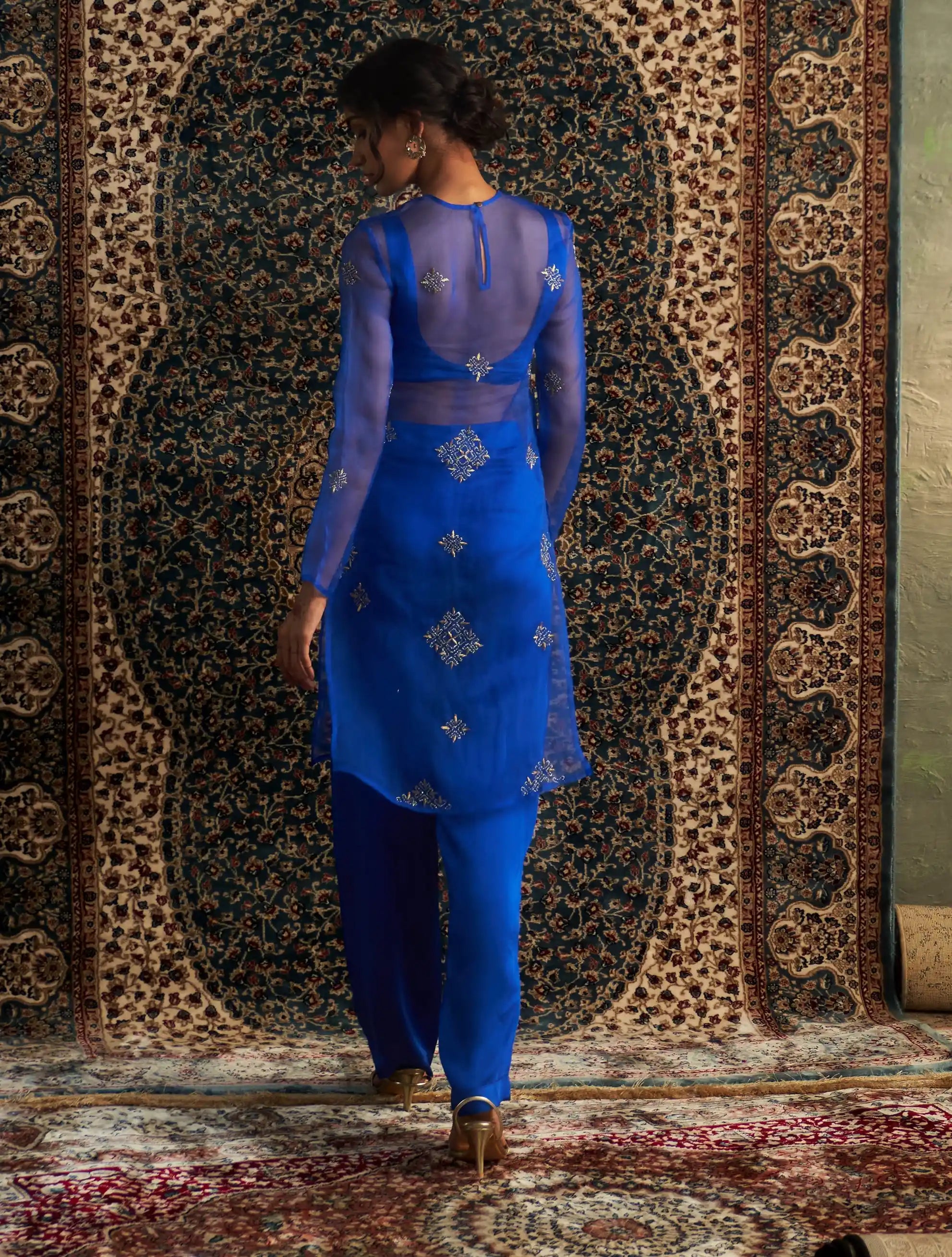 Elevate your festive wardrobe with this exquisite blue organza kurta, artfully paired with sleek, tailored straight trousers. The sheer organza fabric features intricate zari and dabka motifs that exude timeless elegance. A fully embroidered bustier adorned with wave motifs and golden zari work adds a touch of opulence, creating a striking focal point.