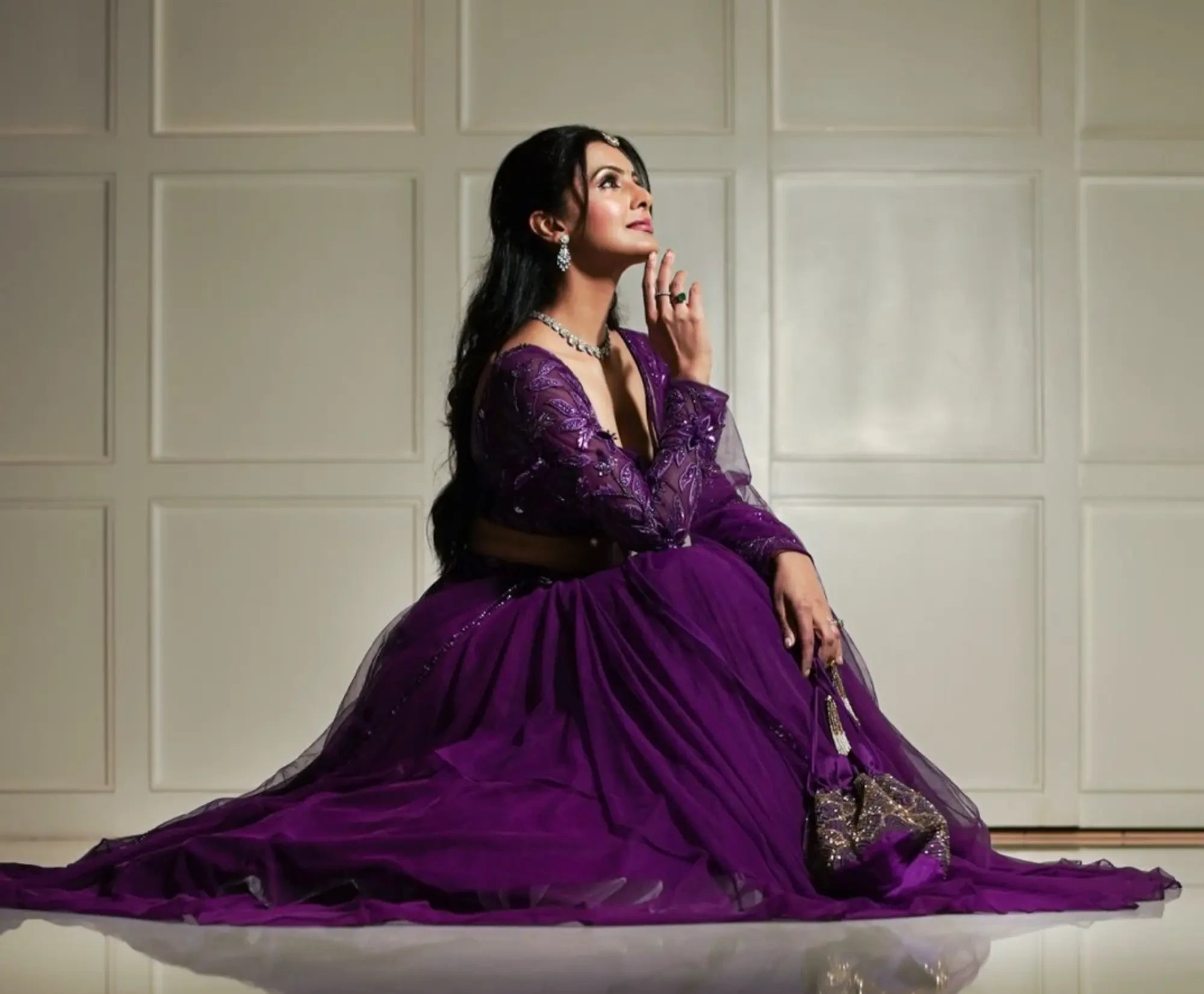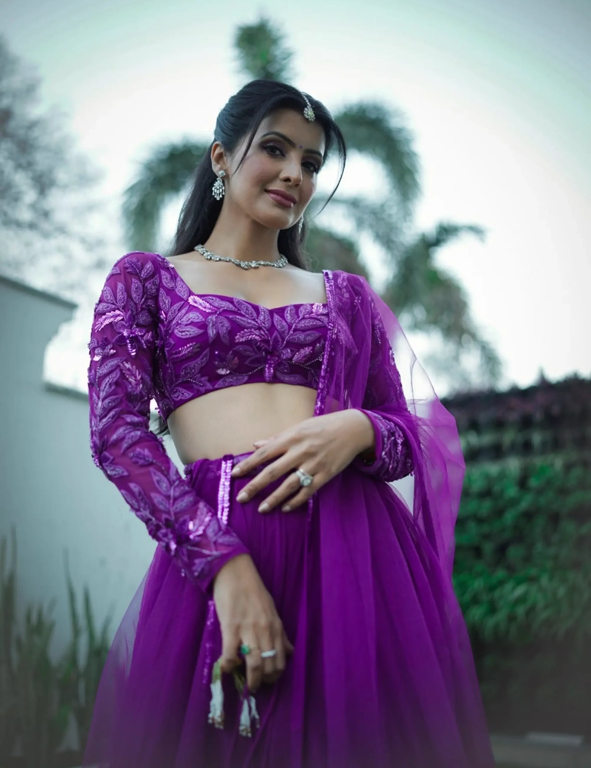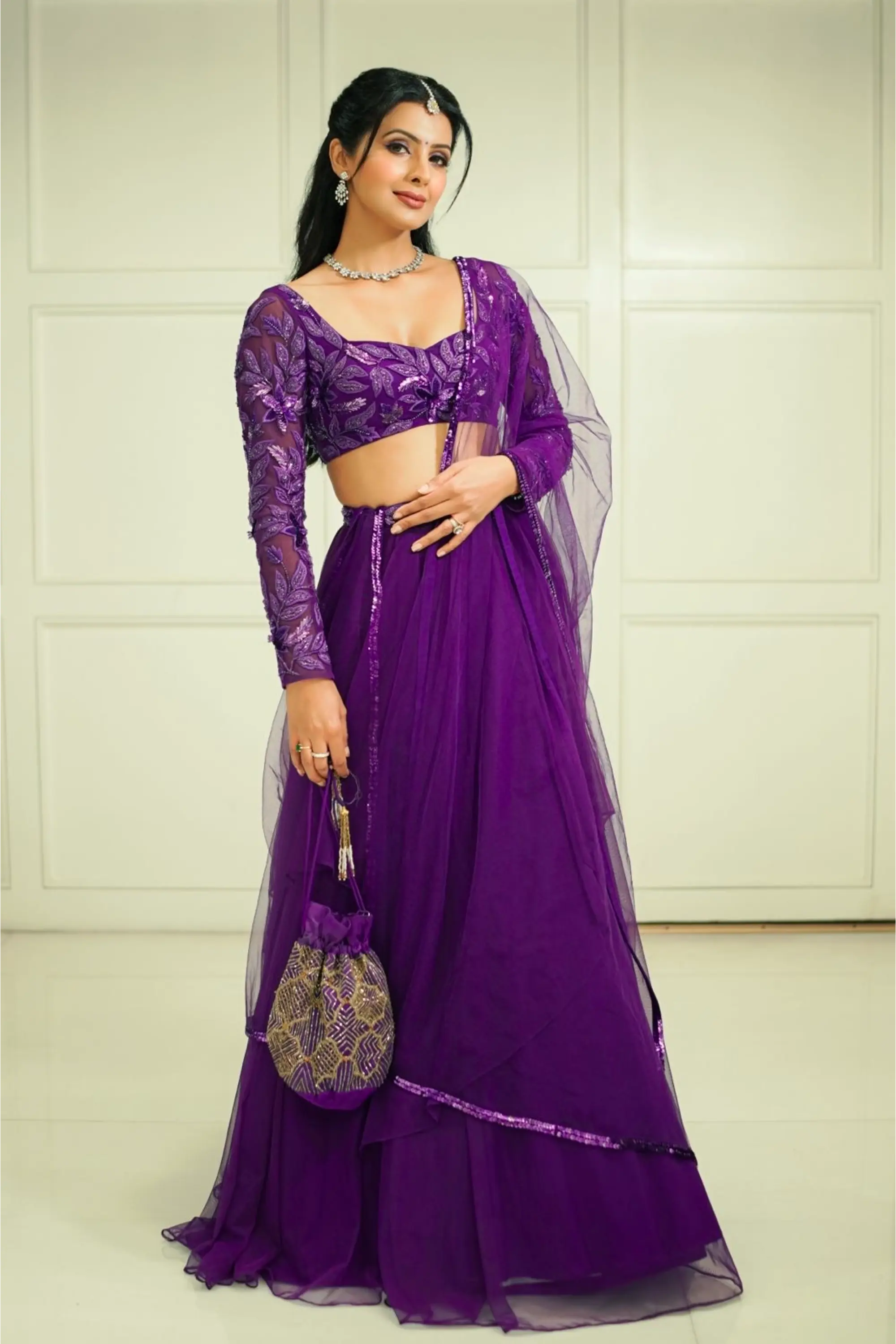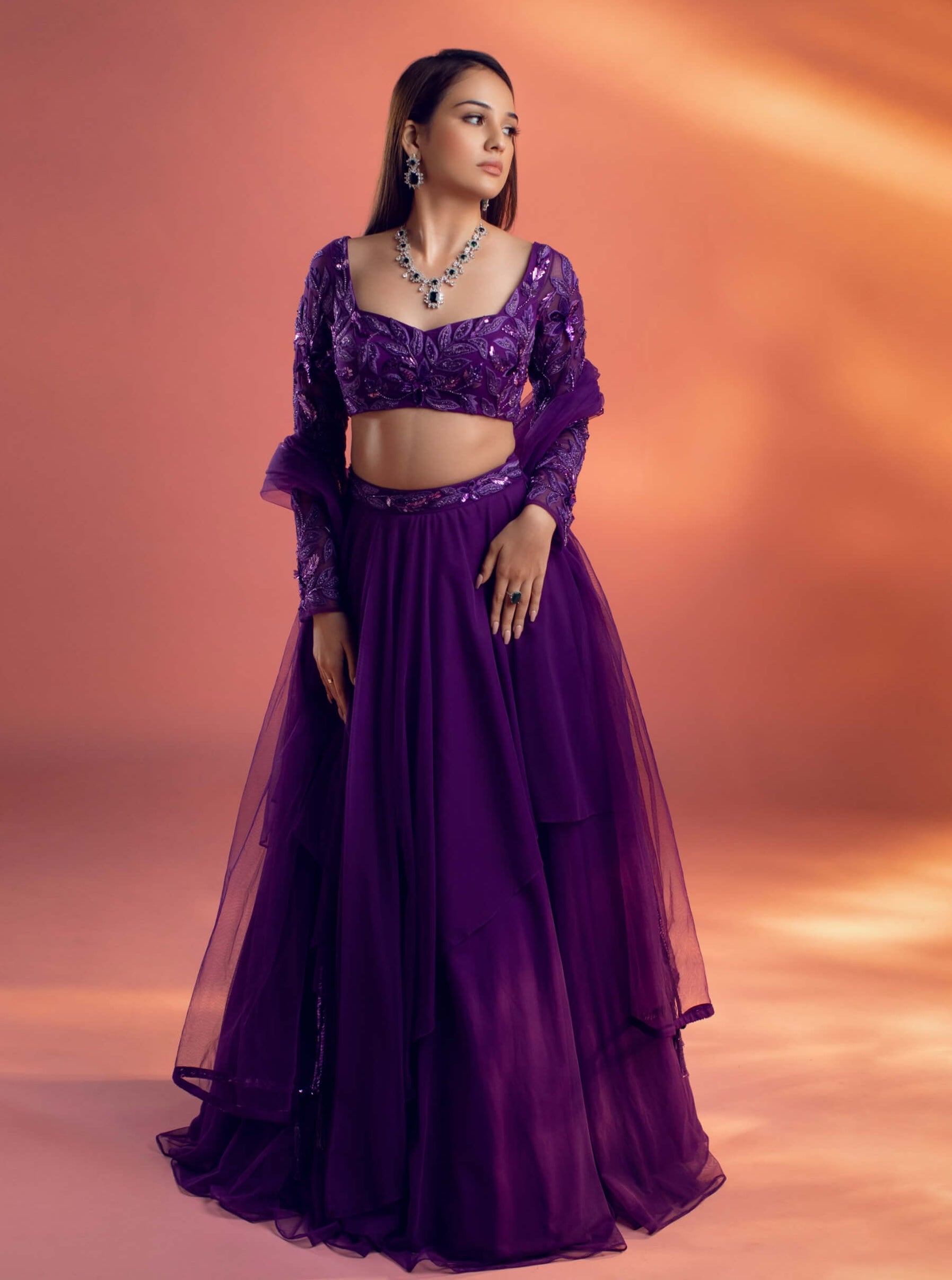 Discover the allure of our purple lehenga set, where modern sophistication meets timeless elegance. The ensemble features a lavish lehenga paired with a full-sleeve blouse, intricately embellished to create a stunning visual effect. A coordinating waist belt accentuates the silhouette with a touch of refined glamour. Completing the look is a dupatta with a tasseled sequin border, adding an element of dynamic sparkle and movement. Ideal for any grand occasion, this set promises to make a memorable impression with its perfect blend of opulence and style.