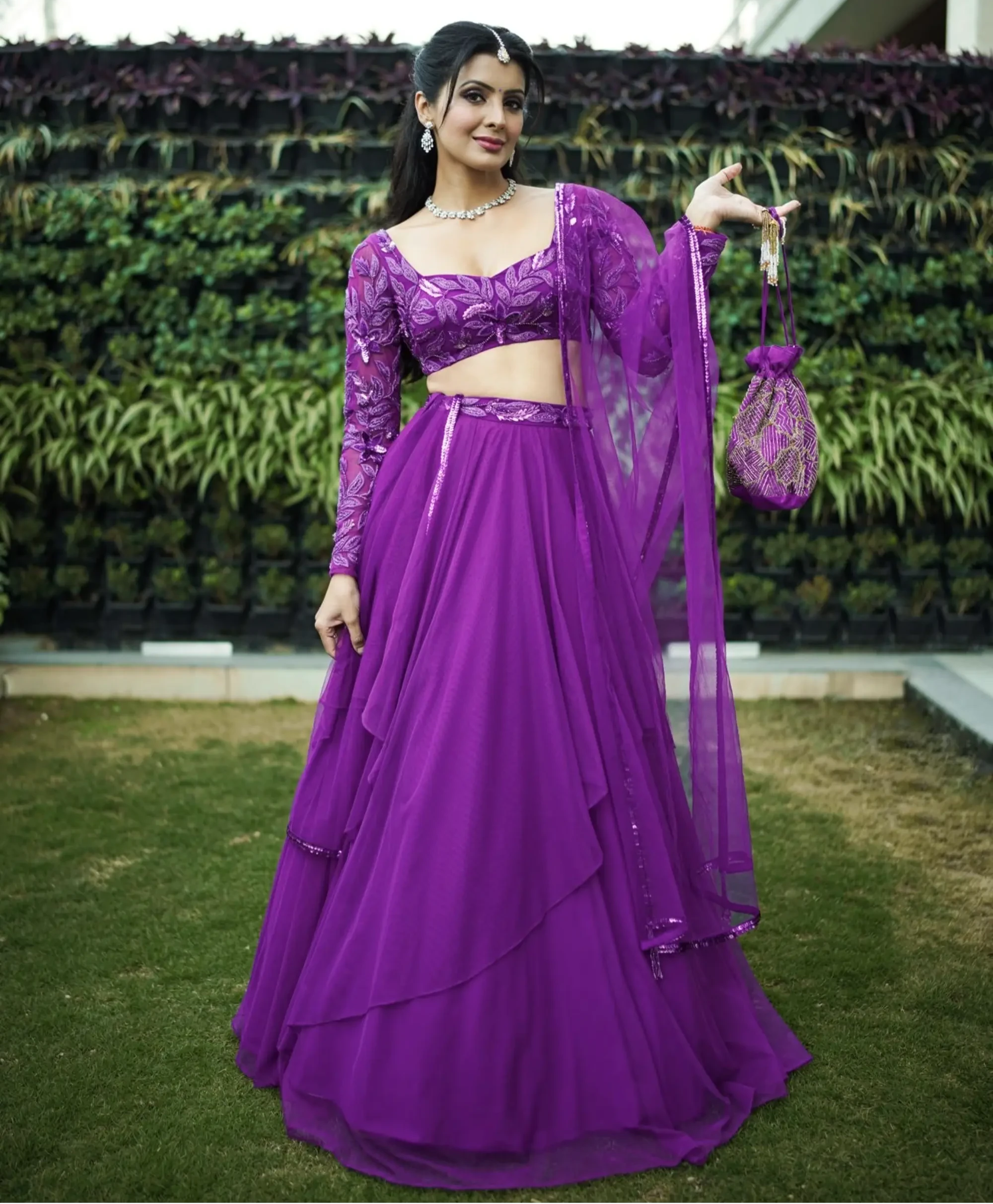 Discover the allure of our purple lehenga set where modern sophistication meets timeless elegance. The ensemble features a lavish lehenga paired with a full-sleeve blouse intricately embellished to create a stunning visual effect. A coordinating waist belt accentuates the silhouette with a touch of refined glamour. Completing the look is a dupatta with a tasseled sequin border adding an element of dynamic sparkle and movement. Ideal for any grand occasion this set promises to make a memorable impression with its perfect blend of opulence and style.